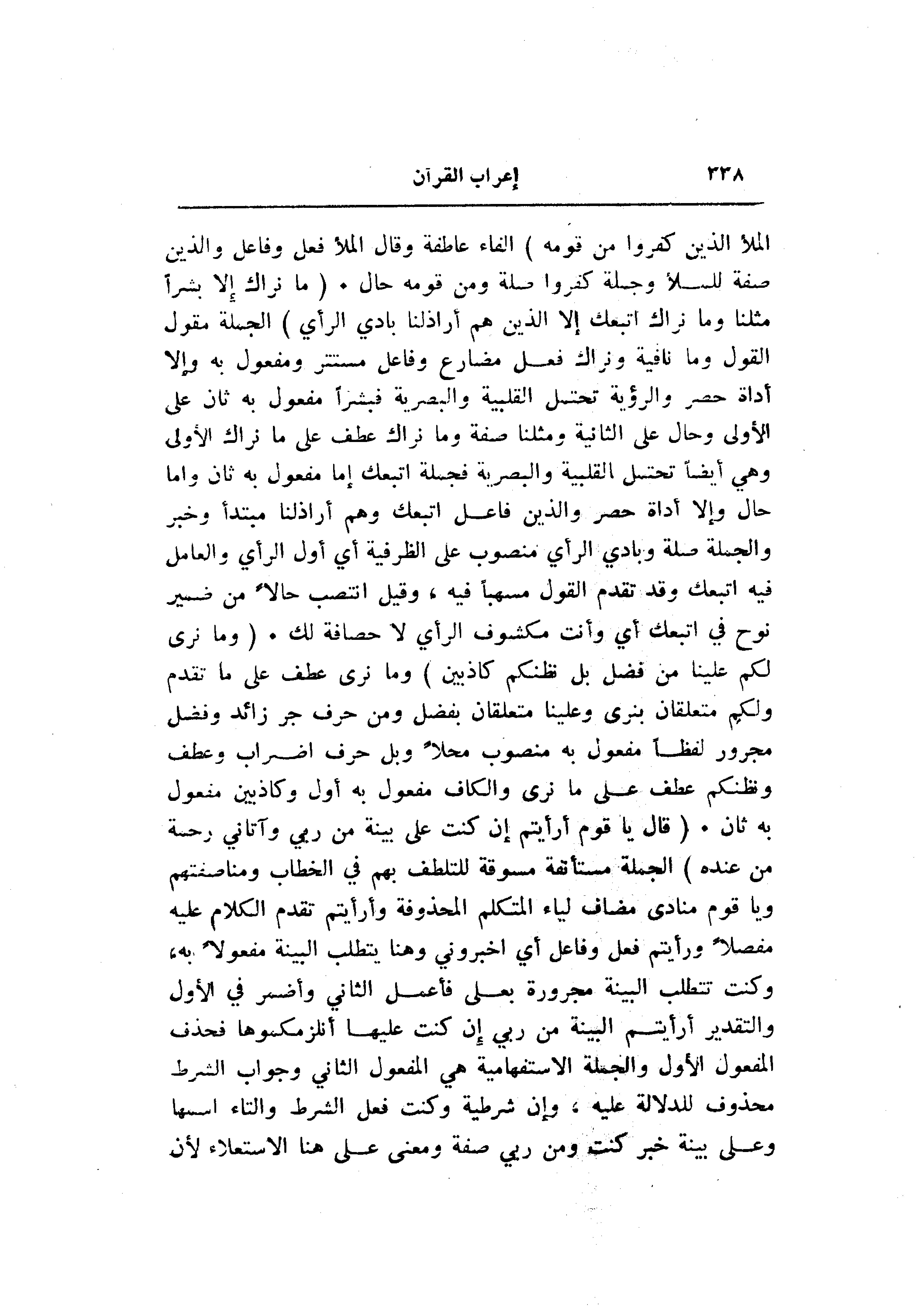 الفاء عاطفة وقال الملأ فعل وفاعل والذين صفة للملأ وجملة كفروا صلة ومن قومه حال. (ما نَراكَ إِلَّا بَشَراً مِثْلَنا وَما نَراكَ اتَّبَعَكَ إِلَّا الَّذِينَ هُمْ أَراذِلُنا بادِيَ الرَّأْيِ) الجملة مقول القول وما نافية ونراك فعل مضارع وفاعل مستتر ومفعول به وإلا أداة حصر والرؤية تحتمل القلبية والبصرية فبشرا مفعول به ثان على الأولى وحال على الثانية ومثلنا صفة وما نراك عطف على ما نراك الأولى وهي أيضا تحتمل القلبية والبصرية فجملة اتبعك إما مفعول به ثان واما حال وإلا أداة حصر والذين فاعل اتبعك وهم أراذلنا مبتدأ وخبر والجملة صلة وبادي الرأي منصوب على الظرفية أي أول الرأي والعامل فيه اتبعك وقد تقدم القول مسهبا فيه، وقيل انتصب حالا من ضمير نوح في اتبعك أي وأنت مكشوف الرأي لا حصافة لك. (وَما نَرى لَكُمْ عَلَيْنا مِنْ فَضْلٍ بَلْ نَظُنُّكُمْ كاذِبِينَ) وما نرى عطف على ما تقدم ولكم متعلقان بنرى وعلينا متعلقان بفضل ومن حرف جر زائد وفضل مجرور لفظا مفعول به منصوب محلا وبل حرف إضراب وعطف ونظنكم عطف على ما نرى والكاف مفعول به أول وكاذبين مفعول به ثان. (قالَ يا قَوْمِ أَرَأَيْتُمْ إِنْ كُنْتُ عَلى بَيِّنَةٍ مِنْ رَبِّي وَآتانِي رَحْمَةً مِنْ عِنْدِهِ) الجملة مستأنفة مسوقة للتلطف بهم في الخطاب ومنا صفتهم ويا قوم منادى مضاف لياء المتكلم المحذوفة وأرأيتم تقدم الكلام عليه مفصلا ورأيتم فعل وفاعل أي اخبروني وهنا يتطلب البينة مفعولا به، وكنت تتطلب البينة مجرورة بعلى فأعمل الثاني وأضمر في الأول والتقدير أرأيتم البينة من ربي إن كنت عليها أنلزمكموها فحذف المفعول الأول والجملة الاستفهامية هي المفعول الثاني وجواب الشرط محذوف للدلالة عليه، وإن شرطية وكنت فعل الشرط والتاء اسمها وعلى بينة خبر كنت ومن ربي صفة ومعنى على هنا الاستعلاء لأن
