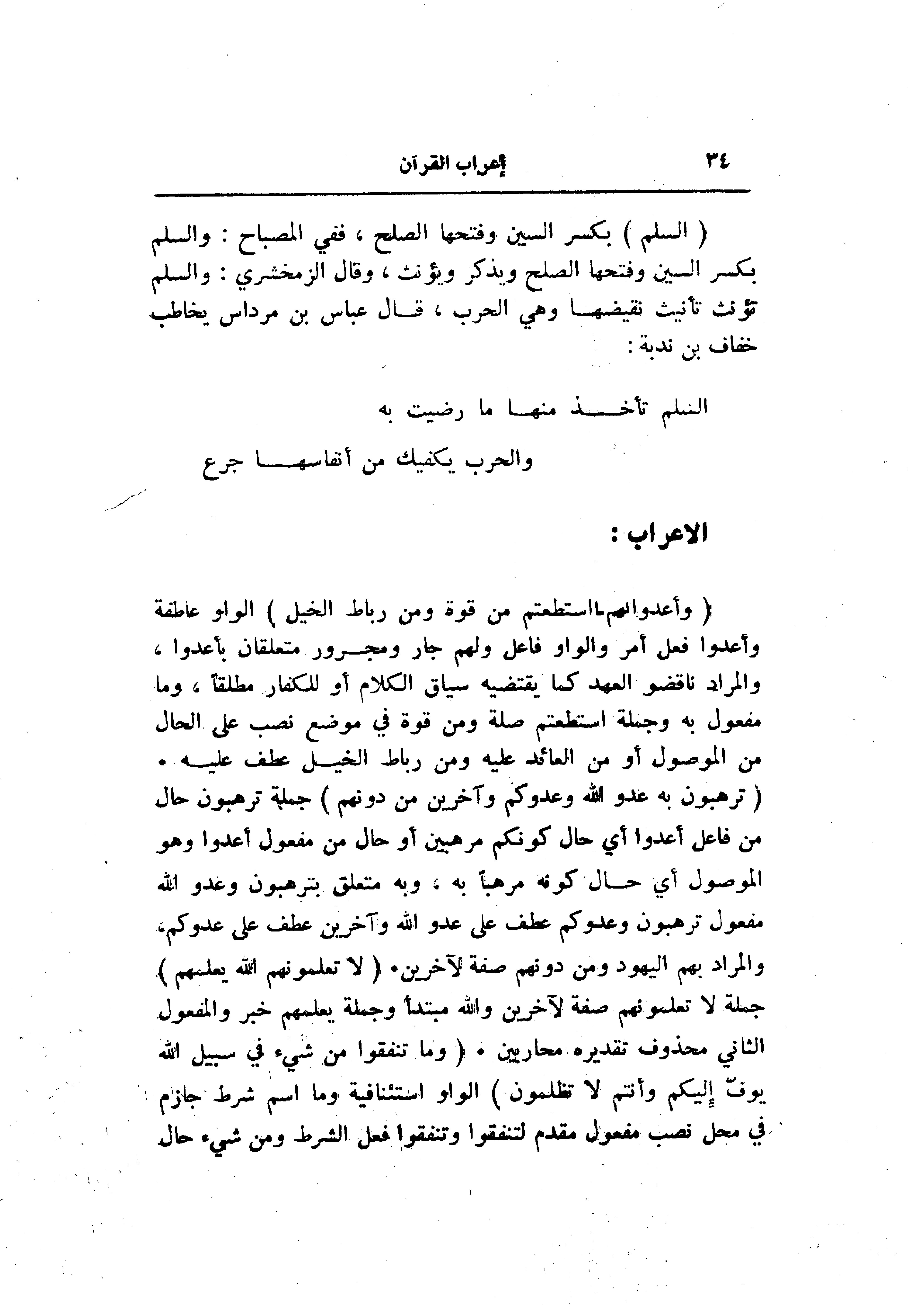 (وَأَعِدُّوا لَهُمْ مَا اسْتَطَعْتُمْ مِنْ قُوَّةٍ وَمِنْ رِباطِ الْخَيْلِ) الواو عاطفة وأعدوا فعل أمر والواو فاعل ولهم جار ومجرور متعلقان بأعدوا، والمراد ناقضو العهد كما يقتضيه سياق الكلام أو للكفار مطلقا، وما مفعول به وجملة استطعتم صلة ومن قوة في موضع نصب على الحال من الموصول أو من العائد عليه ومن رباط الخيل عطف عليه.