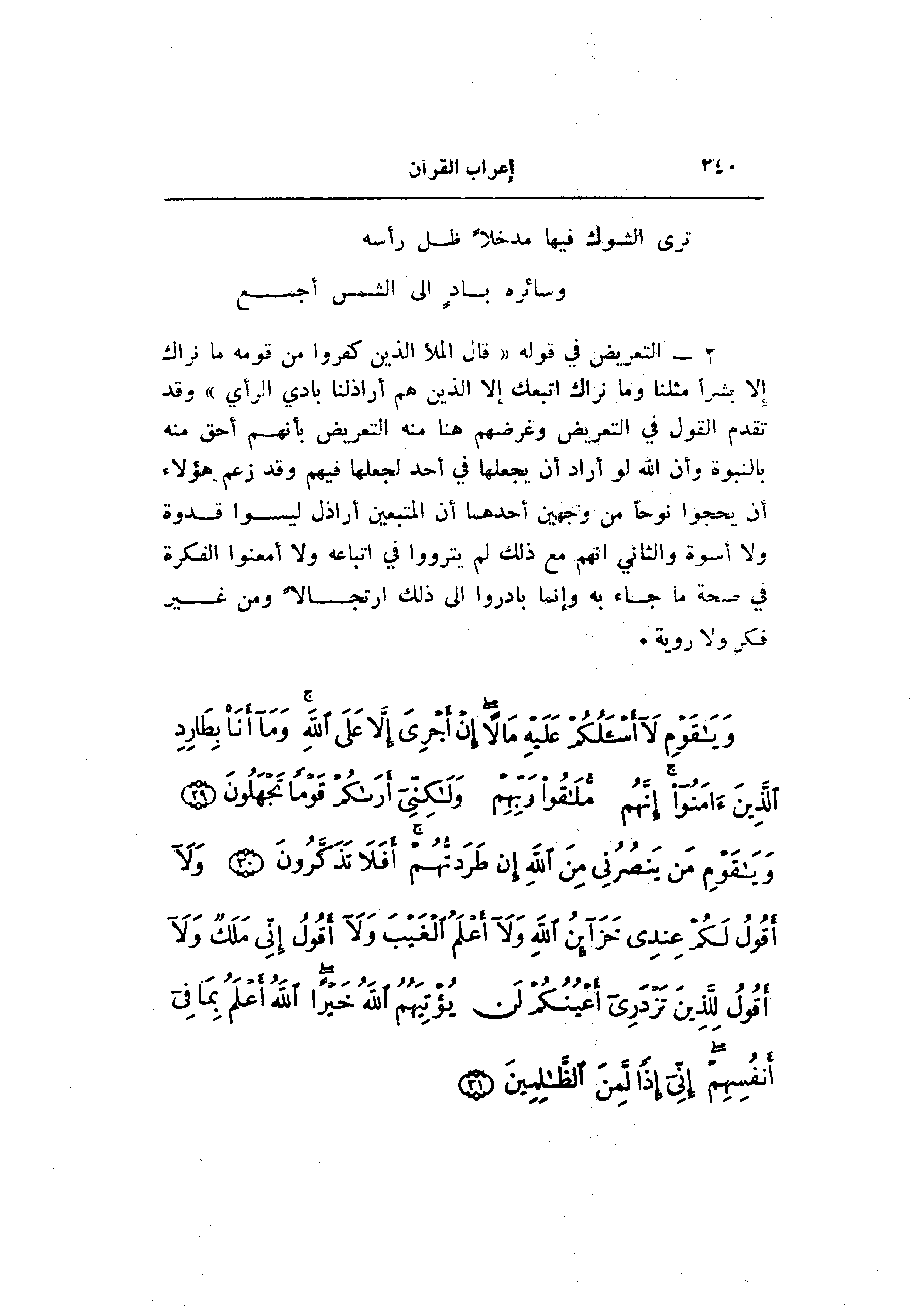 2- التعريض في قوله «قال الملأ الذين كفروا من قومه ما نراك إلا بشرا مثلنا وما نراك اتبعك إلا الذين هم أراذلنا بادي الرأي» وقد تقدم القول في التعريض وغرضهم هنا منه التعريض بأنهم أحق منه بالنبوة وأن الله لو أراد أن يجعلها في أحد لجعلها فيهم وقد زعم هؤلاء أن يحجوا نوحا من وجهين أحدهما أن المتبعين أراذل ليسوا قدوة ولا أسوة والثاني انهم مع ذلك لم يترووا في اتباعه ولا أمعنوا الفكرة في صحة ما جاء به وإنما بادروا الى ذلك ارتجالا ومن غير فكر ولا روية.