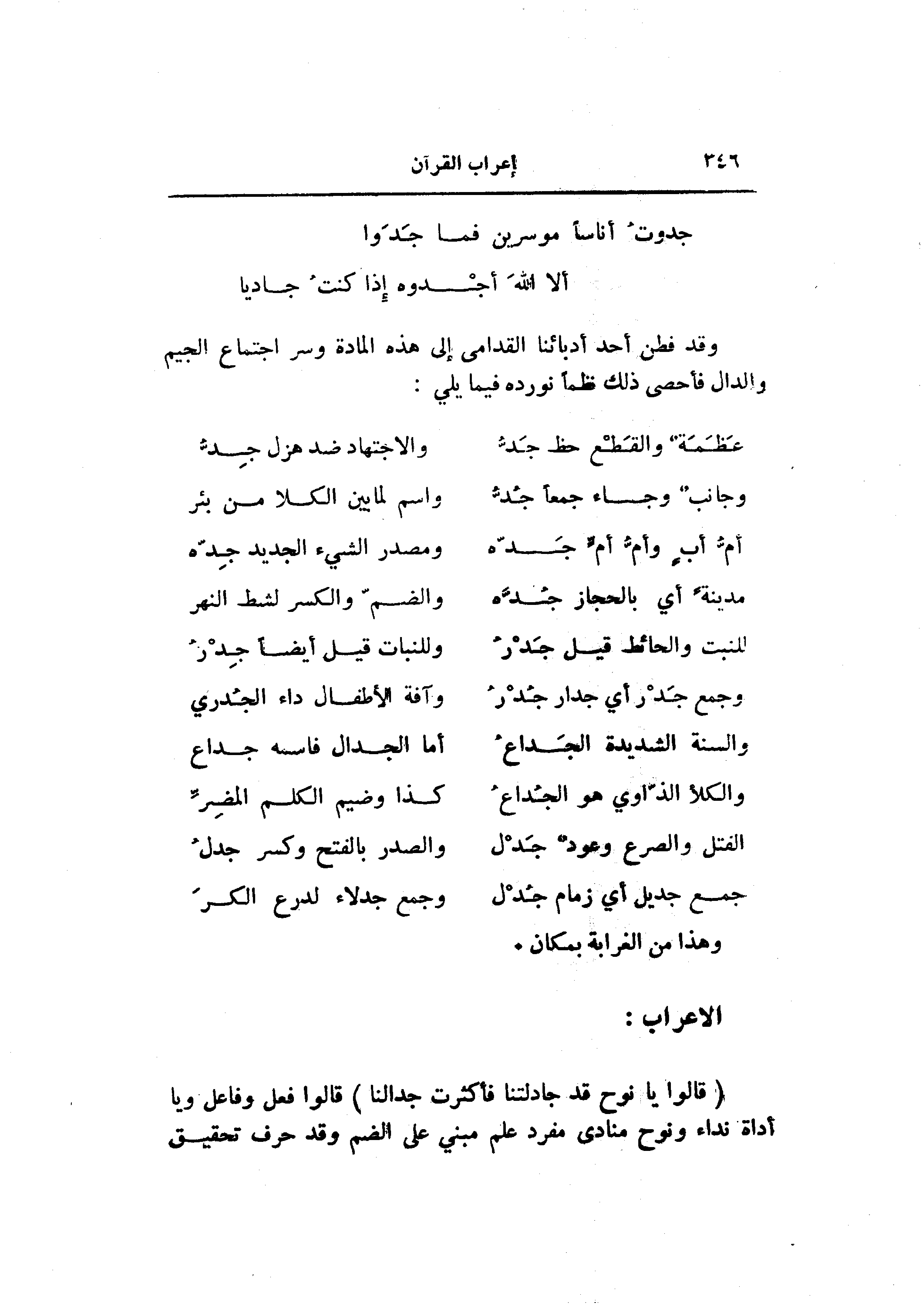 (قالُوا يا نُوحُ قَدْ جادَلْتَنا فَأَكْثَرْتَ جِدالَنا) قالوا فعل وفاعل ويا أداة نداء ونوح منادى مفرد علم مبني على الضم وقد حرف تحقيق