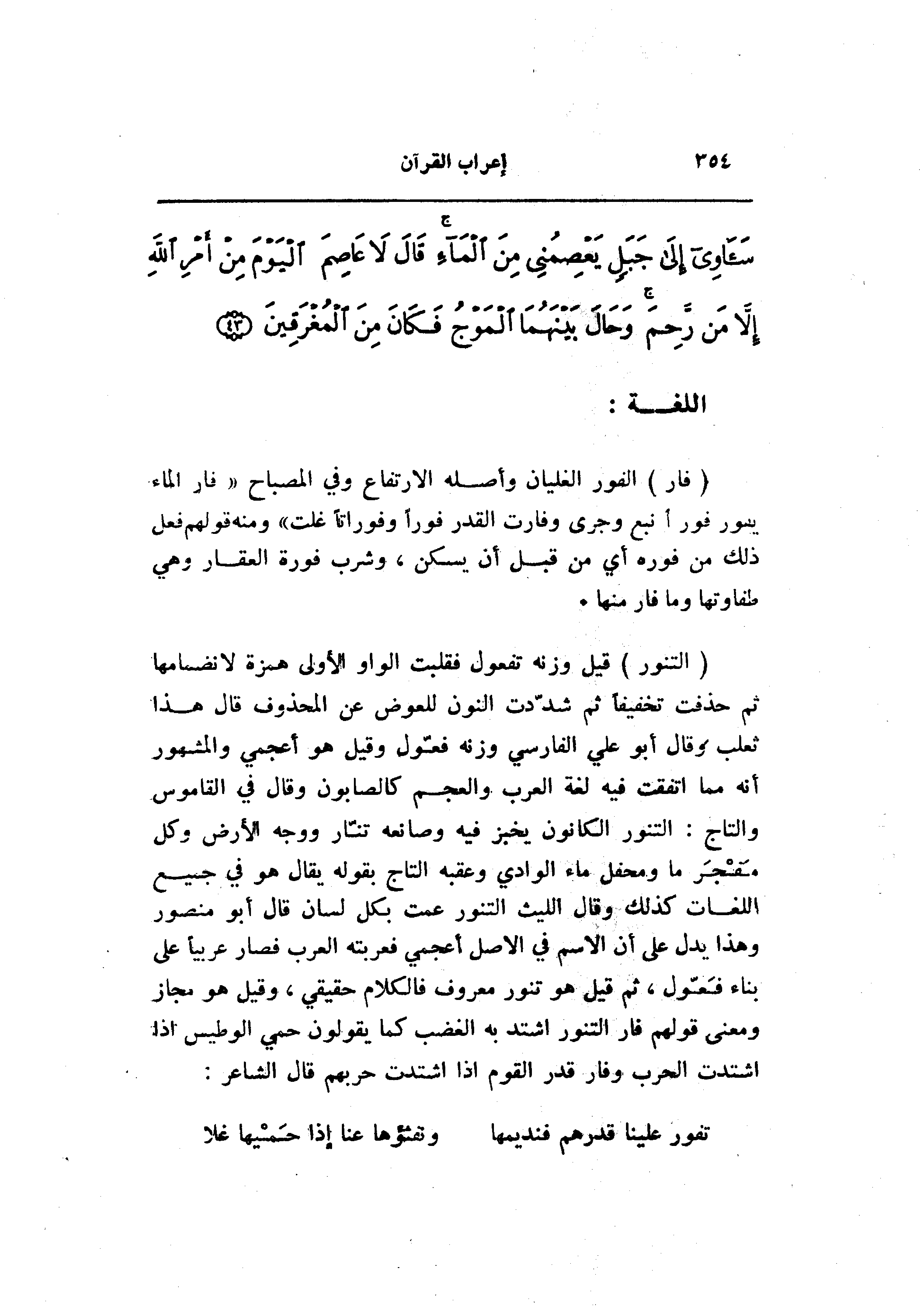 (التَّنُّورُ) قيل وزنه تفعول فقلبت الواو الأولى همزة لانضمامها ثم حذفت تخفيفا ثم شدّدت النون للعوض عن المحذوف قال هذا ثعلب وقال أبو علي الفارسي وزنه فعول وقيل هو أعجمي والمشهور أنه مما اتفقت فيه لغة العرب والعجم كالصابون وقال في القاموس والتاج: التنور الكانون يخبز فيه وصانعه تنّار ووجه الأرض وكل مفجر ما ومحفل ماء الوادي وعقبه التاج بقوله يقال هو في جميع اللغات كذلك وقال الليث التنور عمت بكل لسان قال أبو منصور وهذا يدل على أن الاسم في الأصل أعجمي فعربته العرب فصار عربيا على بناء فعول، ثم قيل هو تنور معروف فالكلام حقيقي، وقيل هو مجاز ومعنى قولهم فار التنور اشتد به الغضب كما يقولون حمي الوطيس إذا اشتدت الحرب وفار قدر القوم إذا اشتدت حربهم قال الشاعر: