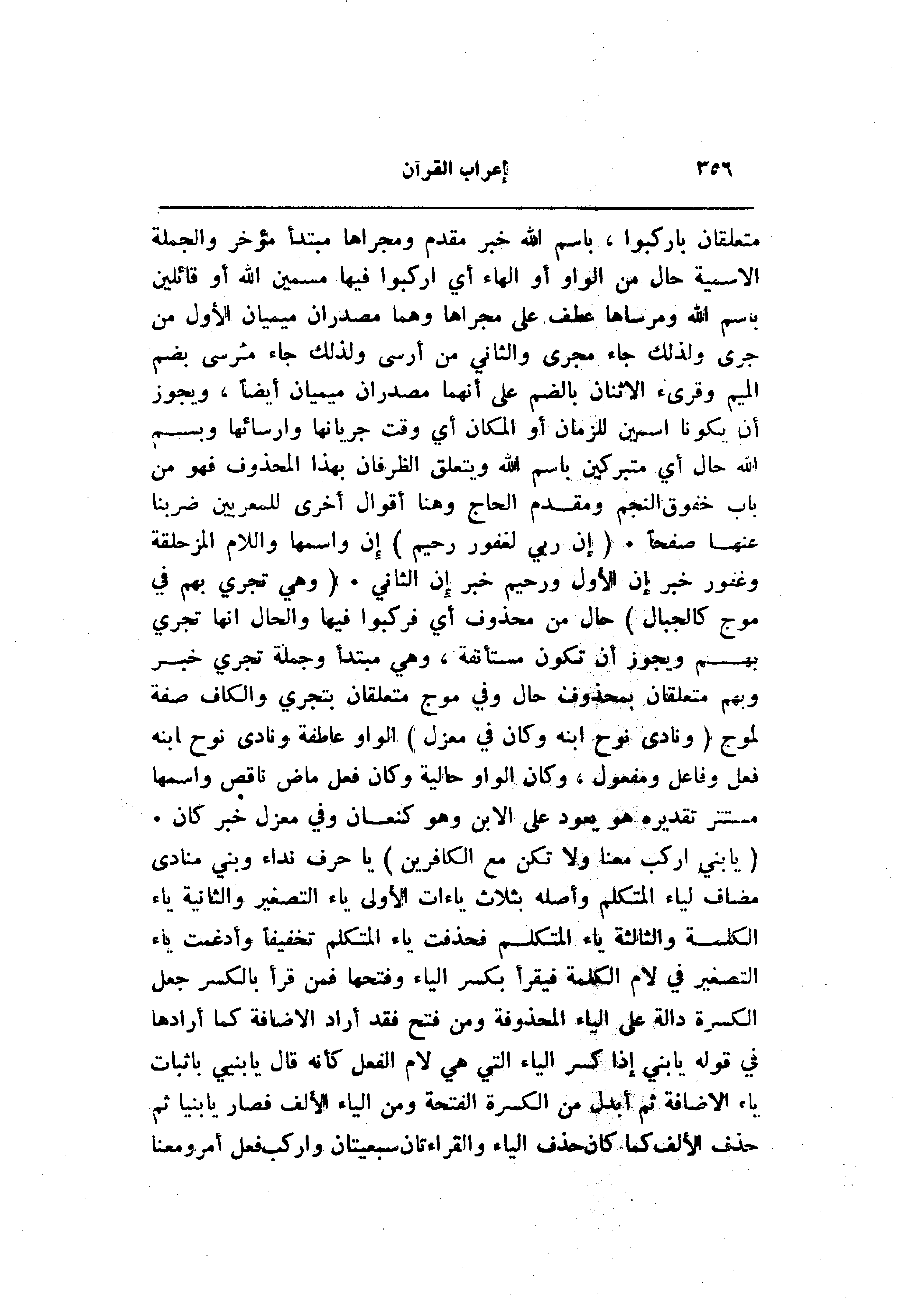 متعلقان باركبوا، باسم الله خبر مقدم ومجراها مبتدأ مؤخر والجملة الاسمية حال من الواو أو الهاء أي اركبوا فيها مسمين الله أو قائلين باسم الله ومرساها عطف على مجراها وهما مصدران ميميان الأول من جرى ولذلك جاء مجرى والثاني من أرسى ولذلك جاء مرسى بضم الميم وقرىء الاثنان بالضم على أنهما مصدران ميميان أيضا، ويجوز أن يكونا اسمين للزمان أو المكان أي وقت جريانها وارسائها وبسم الله حال أي متبركين باسم الله ويتعلق الظرفان بهذا المحذوف فهو من باب خفوق النجم ومقدم الحاج وهنا أقوال أخرى للمعربين ضربنا عنها صفحا. (إِنَّ رَبِّي لَغَفُورٌ رَحِيمٌ) إن واسمها واللام المزحلقة وغفور خبر إن الأول ورحيم خبر إن الثاني. (وَهِيَ تَجْرِي بِهِمْ فِي مَوْجٍ كَالْجِبالِ) حال من محذوف أي فركبوا فيها والحال انها تجري بهم ويجوز أن تكون مستأنفة، وهي مبتدأ وجملة تجري خبر وبهم متعلقان بمحذوف حال وفي موج متعلقان بتجري والكاف صفة لموج (وَنادى نُوحٌ ابْنَهُ وَكانَ فِي مَعْزِلٍ) الواو عاطفة ونادى نوح ابنه فعل وفاعل ومفعول، وكان الواو حالية وكان فعل ماض ناقص واسمها مستتر تقديره هو يعود على الابن وهو كنعان وفي معزل خبر كان.