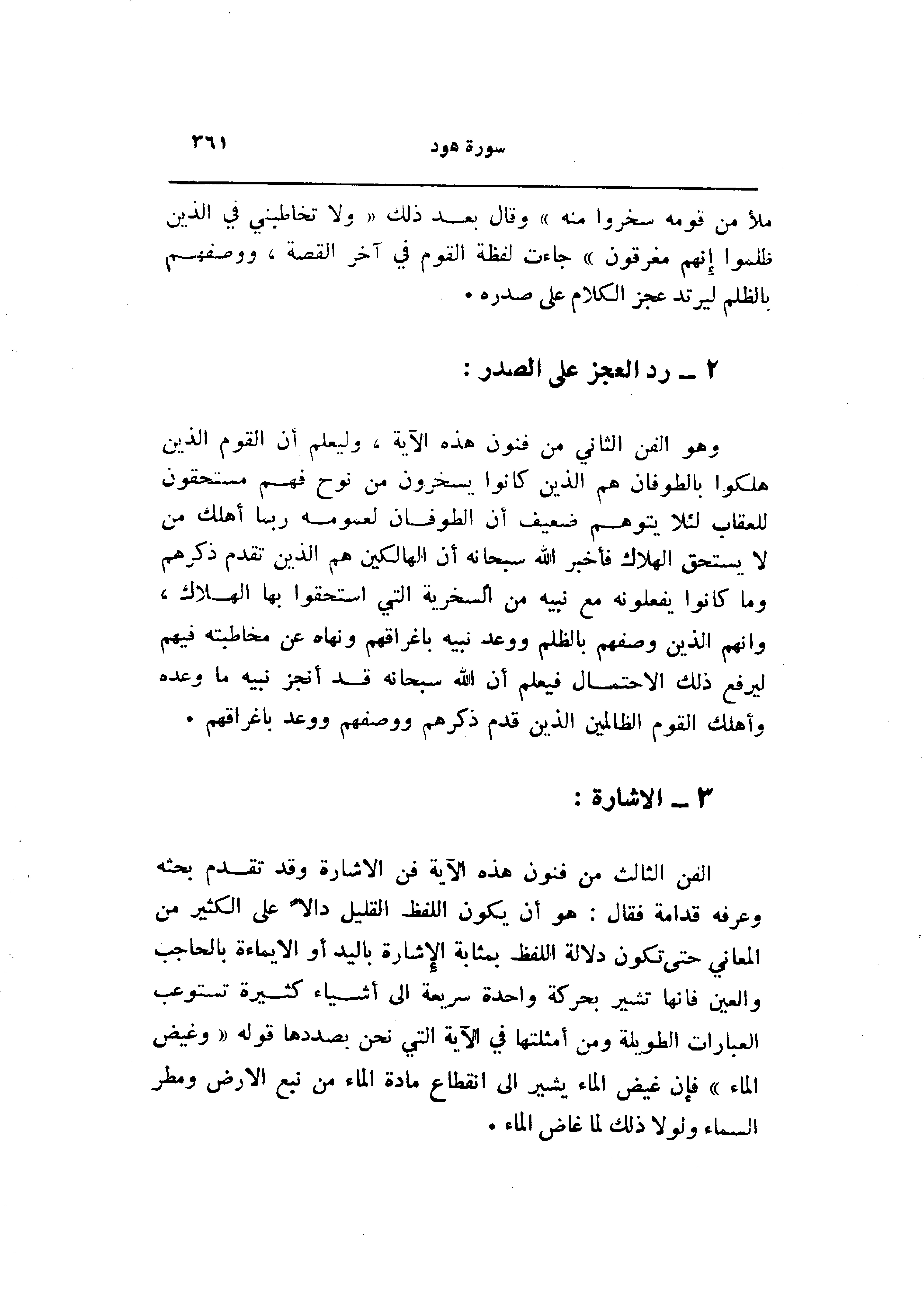 الفن الثالث من فنون هذه الآية فن الاشارة وقد تقدم بحثه وعرفه قدامة فقال: هو أن يكون اللفظ القليل دالا على الكثير من المعاني حتى تكون دلالة اللفظ بمثابة الإشارة باليد أو الايماءة بالحاجب والعين فانها تشير بحركة واحدة سريعة الى أشياء كثيرة تستوعب العبارات الطويلة ومن أمثلتها في الآية التي نحن بصددها قوله «وغيض الماء» فإن غيض الماء يشير الى انقطاع مادة الماء من نبع الأرض ومطر السماء ولولا ذلك لما غاض الماء.