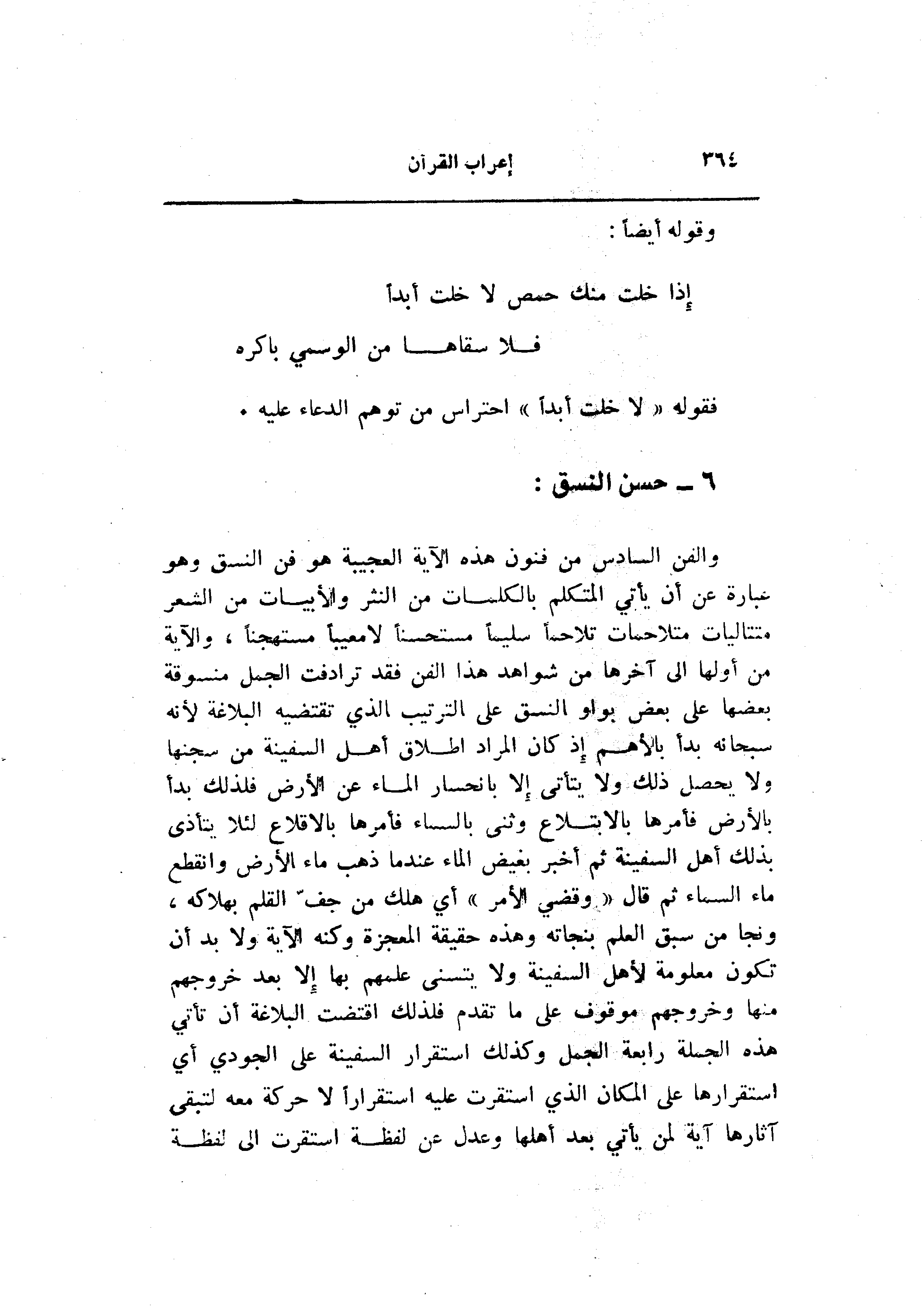 والفن السادس من فنون هذه الآية العجيبة هو فن النسق وهو عبارة عن أن يأتي المتكلم بالكلمات من النثر والأبيات من الشعر متتاليات متلاحمات تلاحما سليما مستحسنا لا معيبا مستهجنا، والآية من أولها الى آخرها من شواهد هذا الفن فقد ترادفت الجمل منسوقة بعضها على بعض بواو النسق على الترتيب الذي تقتضيه البلاغة لأنه سبحانه بدأ بالأهم إذ كان المراد اطلاق أهل السفينة من سجنها ولا يحصل ذلك ولا يتأتى إلا بانحسار الماء عن الأرض فلذلك بدأ بالأرض فأمرها بالابتلاع وثنى بالسماء فأمرها بالإقلاع لئلا يتأذى بذلك أهل السفينة ثم أخبر بغيض الماء عند ما ذهب ماء الأرض وانقطع ماء السماء ثم قال «وقضي الأمر» أي هلك من جفّ القلم بهلاكه، ونجا من سبق العلم بنجاته وهذه حقيقة المعجزة وكنه الآية ولا بد أن تكون معلومة لأهل السفينة ولا يتسنى علمهم بها إلا بعد خروجهم منها وخروجهم موقوف على ما تقدم فلذلك اقتضت البلاغة أن تأتي هذه الجملة رابعة الجمل وكذلك استقرار السفينة على الجودي أي استقرارها على المكان الذي استقرت عليه استقرارا لا حركة معه لتبقى آثارها آية لمن يأتي بعد أهلها وعدل عن لفظة استقرت الى لفظة