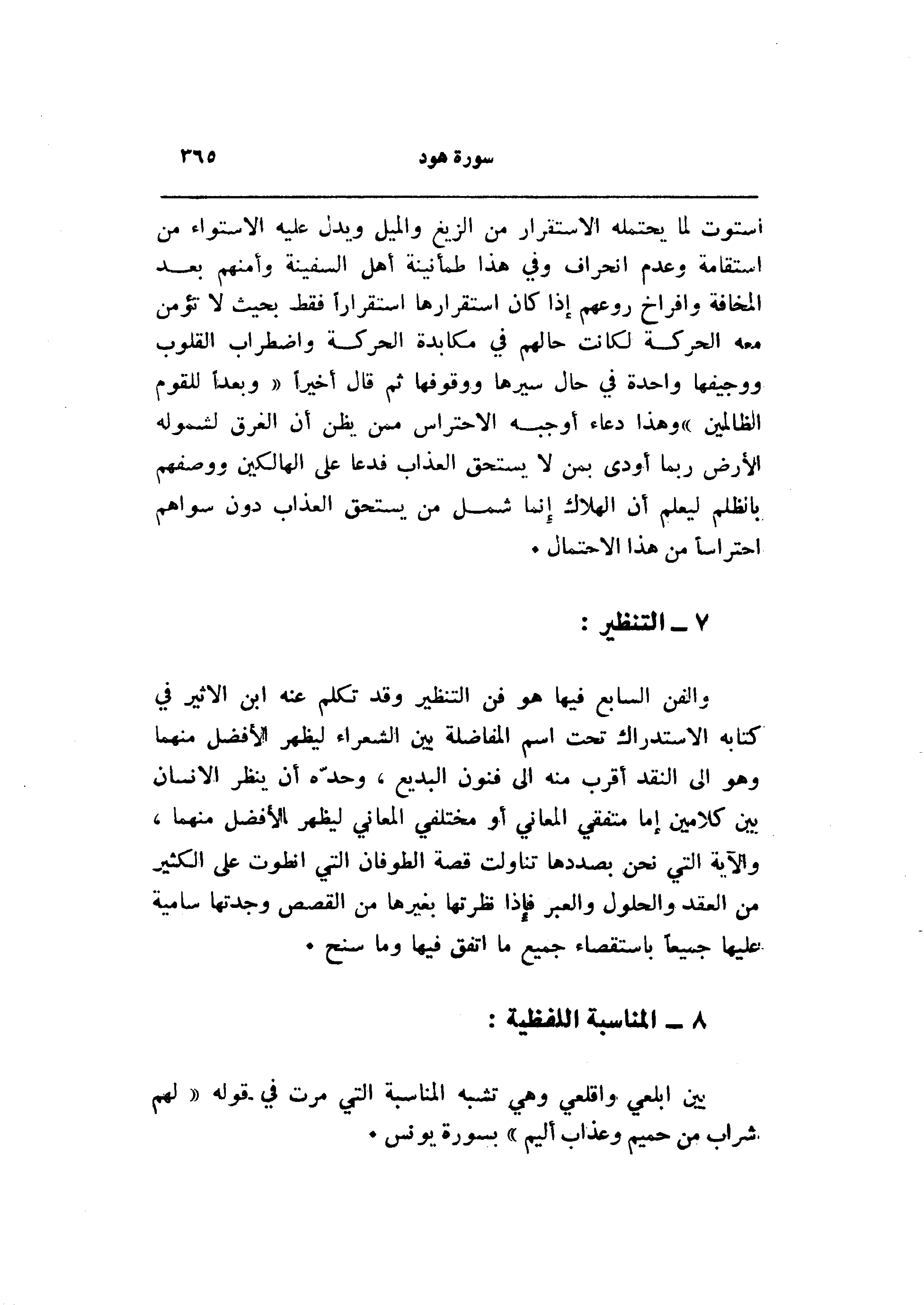 والفن السابع فيها هو فن التنظير وقد تكلم عنه ابن الأثير في كتابه الاستدراك تحت اسم المفاضلة بين الشعراء ليظهر الأفضل منهما وهو الى النقد أقرب منه الى فنون البديع، وحدّه أن ينظر الإنسان بين كلامين إما متفقي المعاني أو مختلفي المعاني ليظهر الأفضل منهما، والآية التي نحن بصددها تناولت قصة الطوفان التي انطوت على الكثير من العقد والحلول والعبر فإذا نظرتها بغيرها من القصص وجدتها سامية عليها جميعا باستقصاء جميع ما اتفق فيها وما سنح.