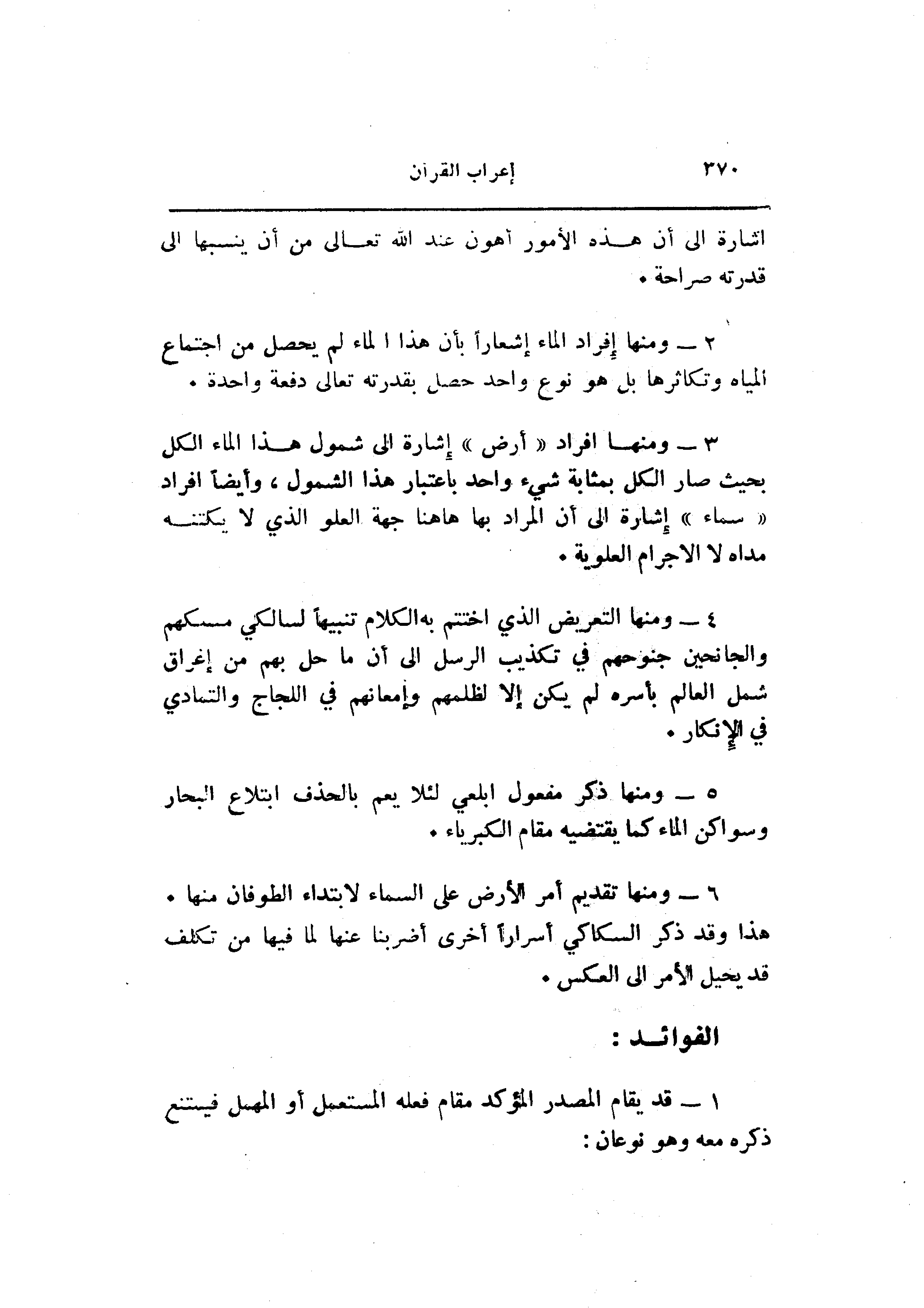 2- ومنها إفراد الماء إشعارا بأن هذا الماء لم يحصل من اجتماع المياه وتكاثرها بل هو نوع واحد حصل بقدرته تعالى دفعة واحدة.