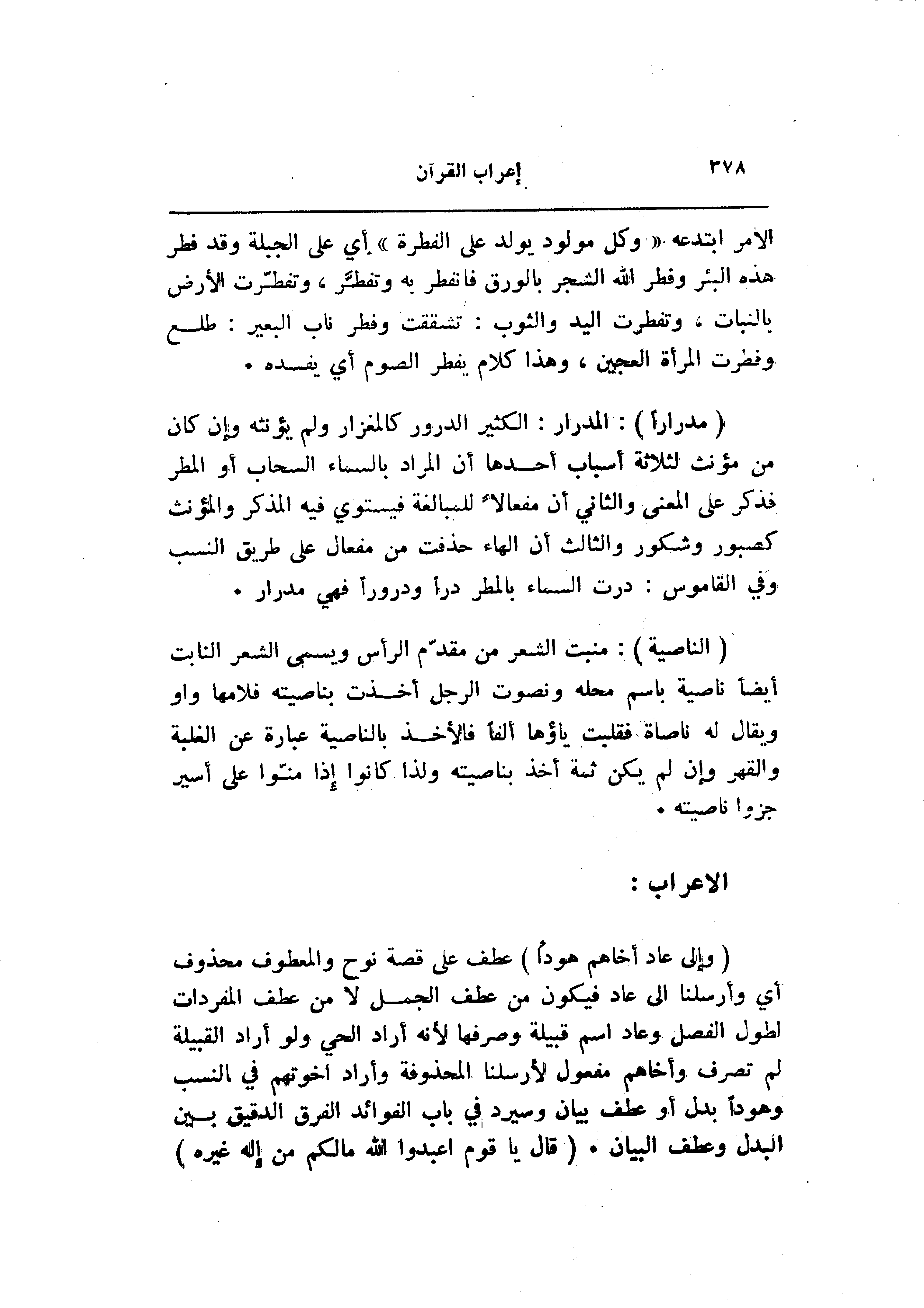 (مِدْراراً) : المدرار: الكثير الدرور كالمغزار ولم يؤنثه وإن كان من مؤنث لثلاثة أسباب أحدها أن المراد بالسماء السحاب أو المطر فذكر على المعنى والثاني أن مفعالا للمبالغة فيستوي فيه المذكر والمؤنث كصبور وشكور والثالث أن الهاء حذفت من مفعال على طريق النسب وفي القاموس: درت السماء بالمطر درا ودرورا فهي مدرار.