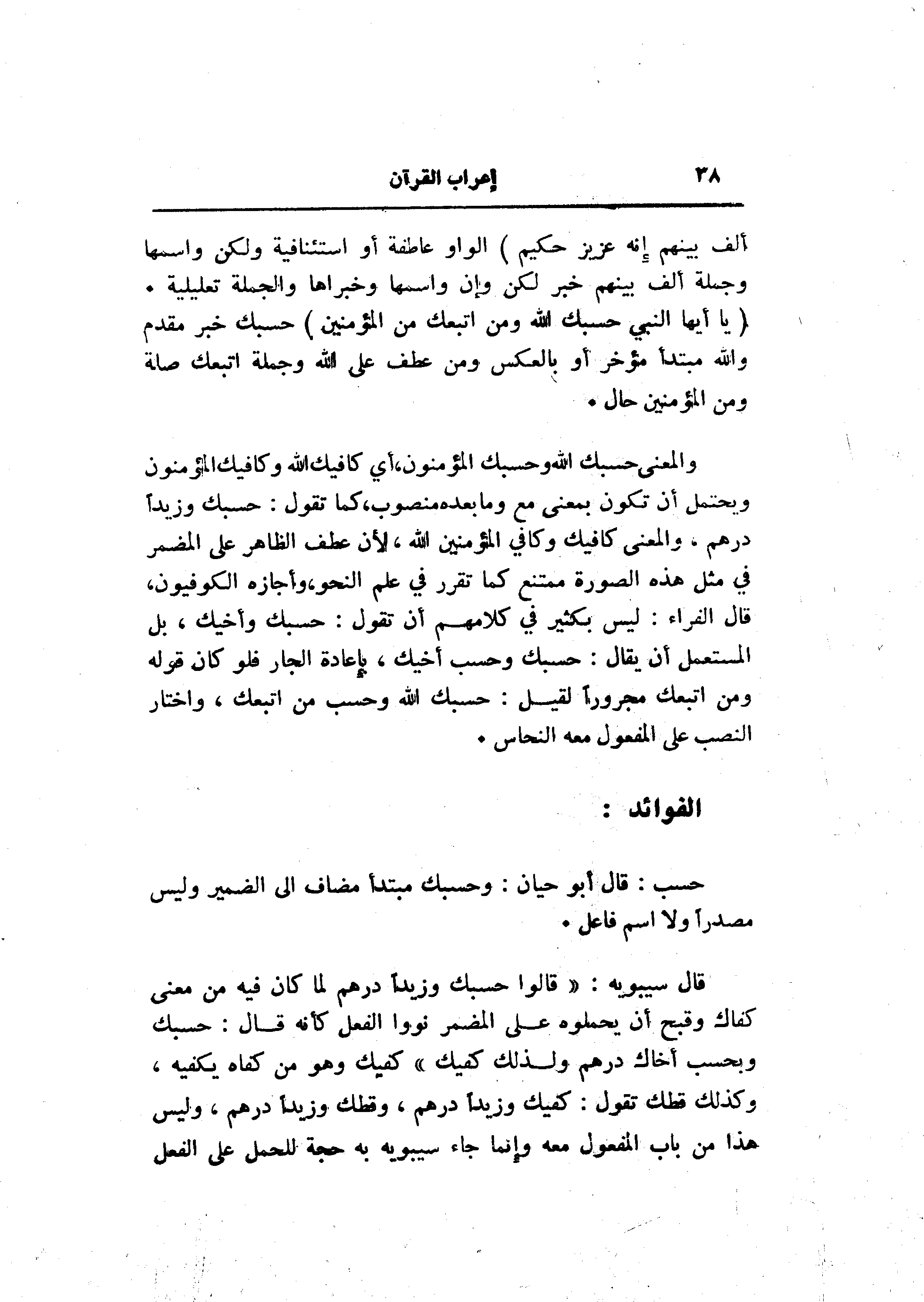 حسب: قال أبو حيان: وحسبك مبتدأ مضاف الى الضمير وليس مصدرا ولا اسم فاعل.