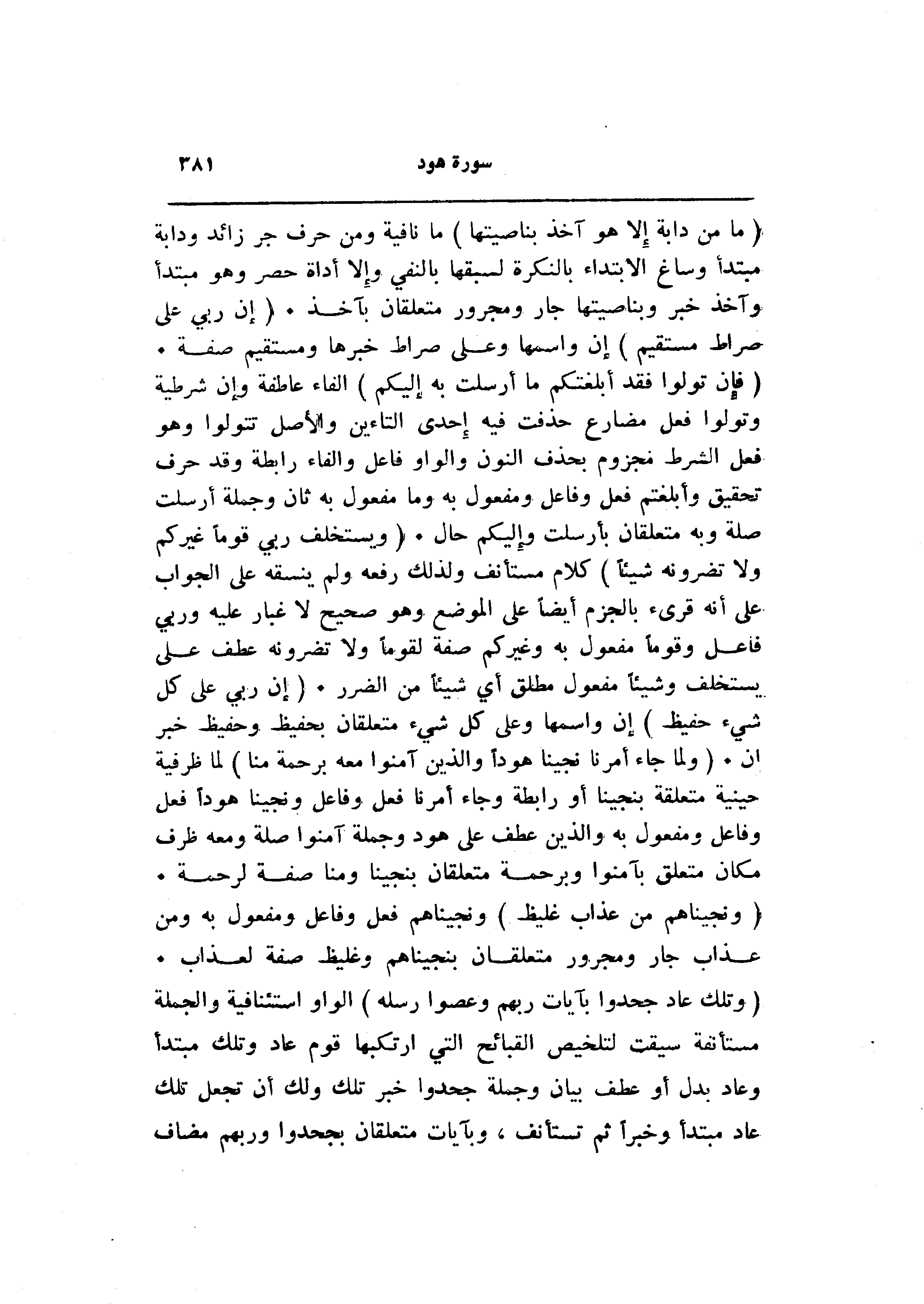 (فَإِنْ تَوَلَّوْا فَقَدْ أَبْلَغْتُكُمْ ما أُرْسِلْتُ بِهِ إِلَيْكُمْ) الفاء عاطفة وإن شرطية وتولوا فعل مضارع حذفت فيه إحدى التاءين والأصل تتولوا وهو فعل الشرط مجزوم بحذف النون والواو فاعل والفاء رابطة وقد حرف تحقيق وأبلغتم فعل وفاعل ومفعول به وما مفعول به ثان وجملة أرسلت صلة وبه متعلقان بأرسلت وإليكم حال. (وَيَسْتَخْلِفُ رَبِّي قَوْماً غَيْرَكُمْ وَلا تَضُرُّونَهُ شَيْئاً) كلام مستأنف ولذلك رفعه ولم ينسقه على الجواب على أنه قرىء بالجزم أيضا على الموضع وهو صحيح لا غبار عليه وربي فاعل وقوما مفعول به وغيركم صفة لقوما ولا تضرونه عطف على يستخلف وشيئا مفعول مطلق أي شيئا من الضرر. (إِنَّ رَبِّي عَلى كُلِّ شَيْءٍ حَفِيظٌ) إن واسمها وعلى كل شيء متعلقان بحفيظ وحفيظ خبر إن. (وَلَمَّا جاءَ أَمْرُنا نَجَّيْنا هُوداً وَالَّذِينَ آمَنُوا مَعَهُ بِرَحْمَةٍ مِنَّا) لما ظرفية حينية متعلقة بنجينا أو رابطة وجاء أمرنا فعل وفاعل ونجينا هودا فعل وفاعل ومفعول به والذين عطف على هود وجملة آمنوا صلة ومعه ظرف مكان متعلق بآمنوا وبرحمة متعلقان بنجينا ومنا صفة لرحمة.