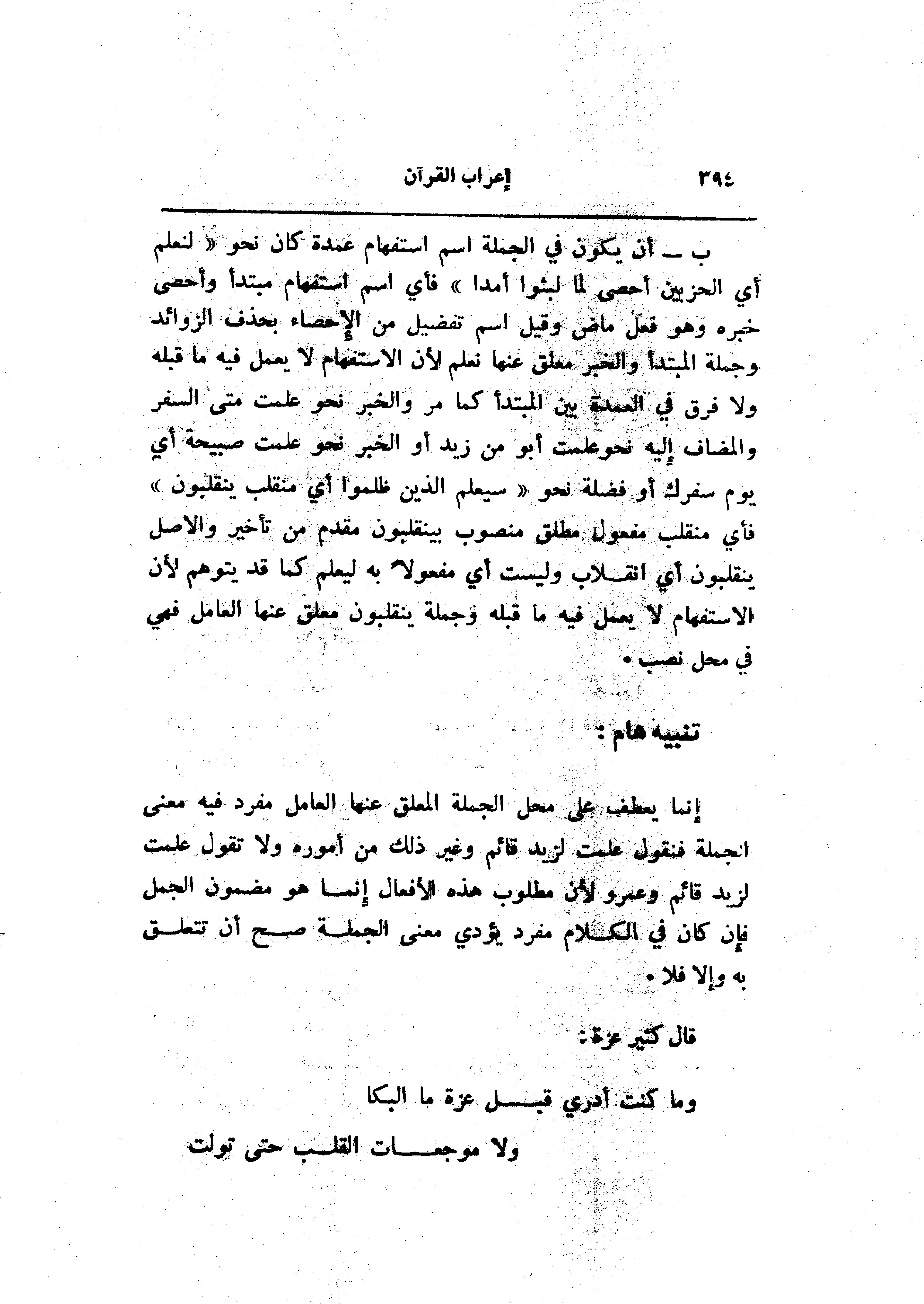 ب- أن يكون في الجملة اسم استفهام عمدة كان نحو «لنعلم أي الحزبين أحصى لما لبثوا أمدا» فأي اسم استفهام مبتدأ وأحصى خبره وهو فعل ماض وقيل اسم تفضيل من الإحصاء بحذف الزوائد وجملة المبتدأ والخبر معلق عنها نعلم لأن الاستفهام لا يعمل فيه ما قبله ولا فرق في العمدة بين المبتدأ كما مر والخبر نحو علمت متى السفر والمضاف إليه نحو علمت أبو من زيد أو الخبر نحو علمت صبيحة أي يوم سفرك أو فضلة نحو «سيعلم الذين ظلموا أي منقلب ينقلبون» فأي منقلب مفعول مطلق منصوب بينقلبون مقدم من تأخير والأصل ينقلبون أي انقلاب وليست أي مفعولا به ليعلم كما قد يتوهم لأن الاستفهام لا يعمل فيه ما قبله وجملة ينقلبون معلق عنها العامل فهي في محل نصب.
