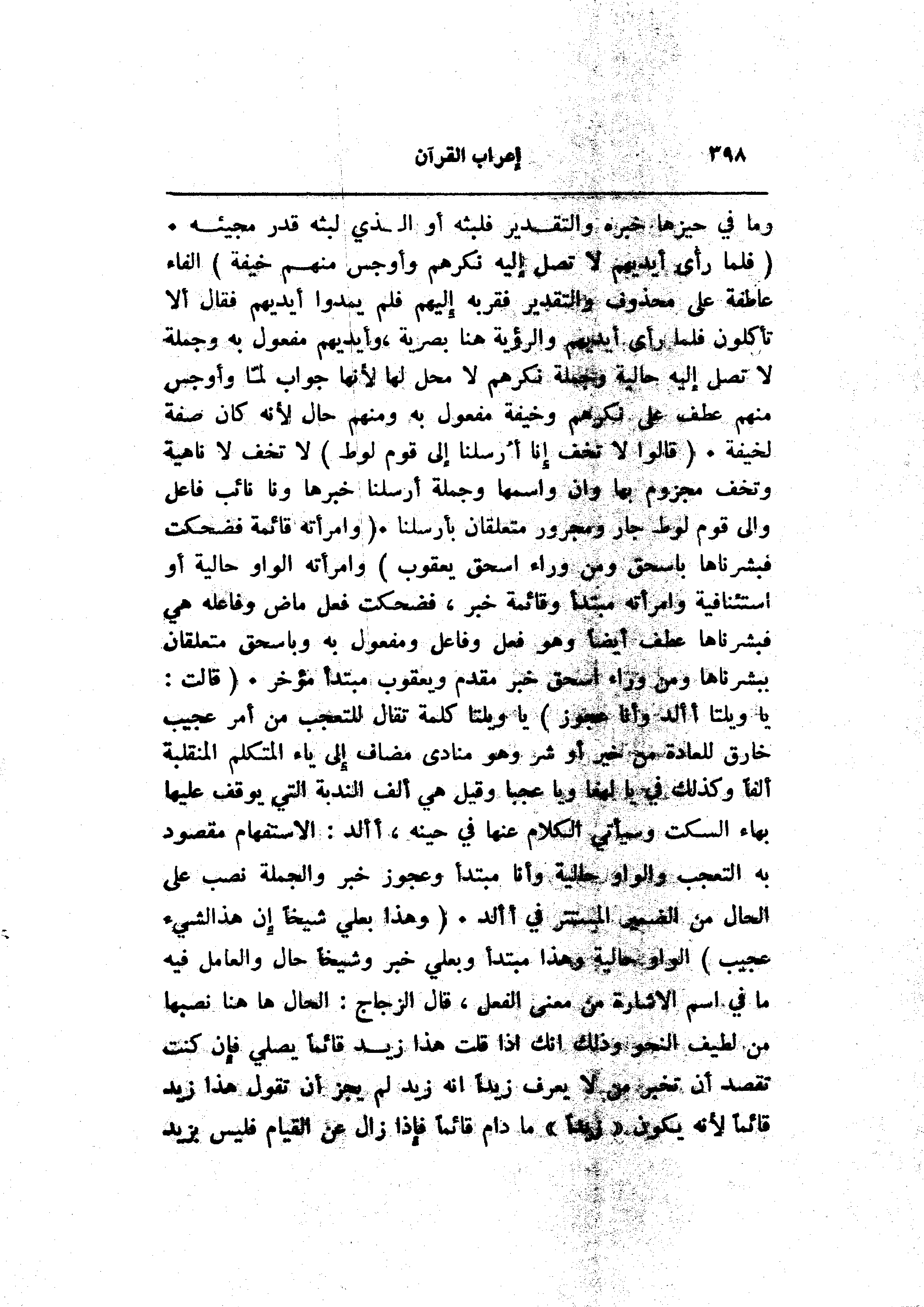 (فَلَمَّا رَأى أَيْدِيَهُمْ لا تَصِلُ إِلَيْهِ نَكِرَهُمْ وَأَوْجَسَ مِنْهُمْ خِيفَةً) الفاء عاطفة على محذوف والتقدير فقربه إليهم فلم يمدوا أيديهم فقال ألا تأكلون فلما رأى أيديهم والرؤية هنا بصرية، وأيديهم مفعول به وجملة لا تصل إليه حالية وجملة نكرهم لا محل لها لأنها جواب لمّا وأوجس منهم عطف على نكرهم وخيفة مفعول به ومنهم حال لأنه كان صفة لخيفة. (قالُوا لا تَخَفْ إِنَّا أُرْسِلْنا إِلى قَوْمِ لُوطٍ) لا تخف لا ناهية وتخف مجزوم بها وان واسمها وجملة أرسلنا خبرها ونا نائب فاعل والى قوم لوط جار ومجرور متعلقان بأرسلنا. (وَامْرَأَتُهُ قائِمَةٌ فَضَحِكَتْ فَبَشَّرْناها بِإِسْحاقَ وَمِنْ وَراءِ إِسْحاقَ يَعْقُوبَ) وامرأته الواو حالية أو استئنافية وامرأته مبتدأ وقائمة خبر، فضحكت فعل ماض وفاعله هي فبشرناها عطف أيضا وهو فعل وفاعل ومفعول به وبإسحاق متعلقان ببشرناها ومن وراء اسحق خبر مقدم ويعقوب مبتدأ مؤخر. (قالَتْ: يا وَيْلَتى أَأَلِدُ وَأَنَا عَجُوزٌ) يا ويلتا كلمة تقال للتعجب من أمر عجيب خارق للعادة من خير أو شر وهو منادى مضاف إلى ياء المتكلم المنقلبة ألفا وكذلك في يا لهفا ويا عجبا وقيل هي ألف الندبة التي يوقف عليها بهاء السكت وسيأتي الكلام عنها في حينه، أألد: الاستفهام مقصود به التعجب والواو حالية وأنا مبتدأ وعجوز خبر والجملة نصب على الحال من الضمير المستتر في أألد. (وَهذا بَعْلِي شَيْخاً إِنَّ هذا لَشَيْءٌ عَجِيبٌ) الواو حالية وهذا مبتدأ وبعلي خبر وشيخا حال والعامل فيه ما في اسم الاشارة من معنى الفعل، قال الزجاج: الحال هاهنا نصبها من لطيف النحو وذلك انك إذا قلت هذا زيد قائما يصلي فإن كنت تقصد أن تخبر من لا يعرف زيدا انه زيد لم يجز أن تقول هذا زيد قائما لأنه يكون «زيدا» ما دام قائما فإذا زال عن القيام فليس بزيد