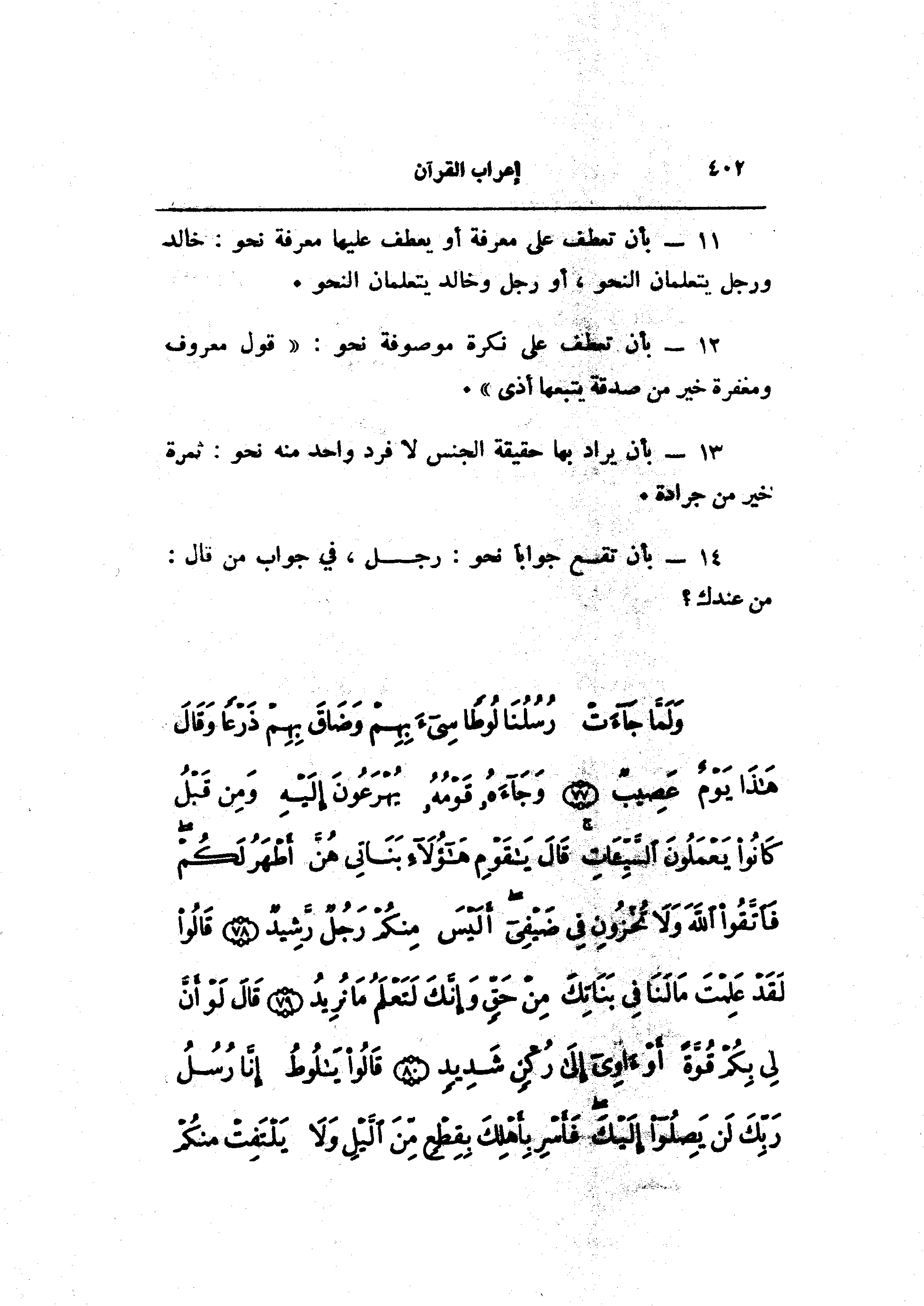 وَلَمَّا جاءَتْ رُسُلُنا لُوطاً سِيءَ بِهِمْ وَضاقَ بِهِمْ ذَرْعاً وَقالَ هذا يَوْمٌ عَصِيبٌ (77) وَجاءَهُ قَوْمُهُ يُهْرَعُونَ إِلَيْهِ وَمِنْ قَبْلُ كانُوا يَعْمَلُونَ السَّيِّئاتِ قالَ يا قَوْمِ هؤُلاءِ بَناتِي هُنَّ أَطْهَرُ لَكُمْ فَاتَّقُوا اللَّهَ وَلا تُخْزُونِ فِي ضَيْفِي أَلَيْسَ مِنْكُمْ رَجُلٌ رَشِيدٌ (78) قالُوا لَقَدْ عَلِمْتَ ما لَنا فِي بَناتِكَ مِنْ حَقٍّ وَإِنَّكَ لَتَعْلَمُ ما نُرِيدُ (79) قالَ لَوْ أَنَّ لِي بِكُمْ قُوَّةً أَوْ آوِي إِلى رُكْنٍ شَدِيدٍ (80) قالُوا يا لُوطُ إِنَّا رُسُلُ رَبِّكَ لَنْ يَصِلُوا إِلَيْكَ فَأَسْرِ بِأَهْلِكَ بِقِطْعٍ مِنَ اللَّيْلِ وَلا يَلْتَفِتْ مِنْكُمْ أَحَدٌ إِلاَّ امْرَأَتَكَ إِنَّهُ مُصِيبُها ما أَصابَهُمْ إِنَّ مَوْعِدَهُمُ الصُّبْحُ أَلَيْسَ الصُّبْحُ بِقَرِيبٍ (81)