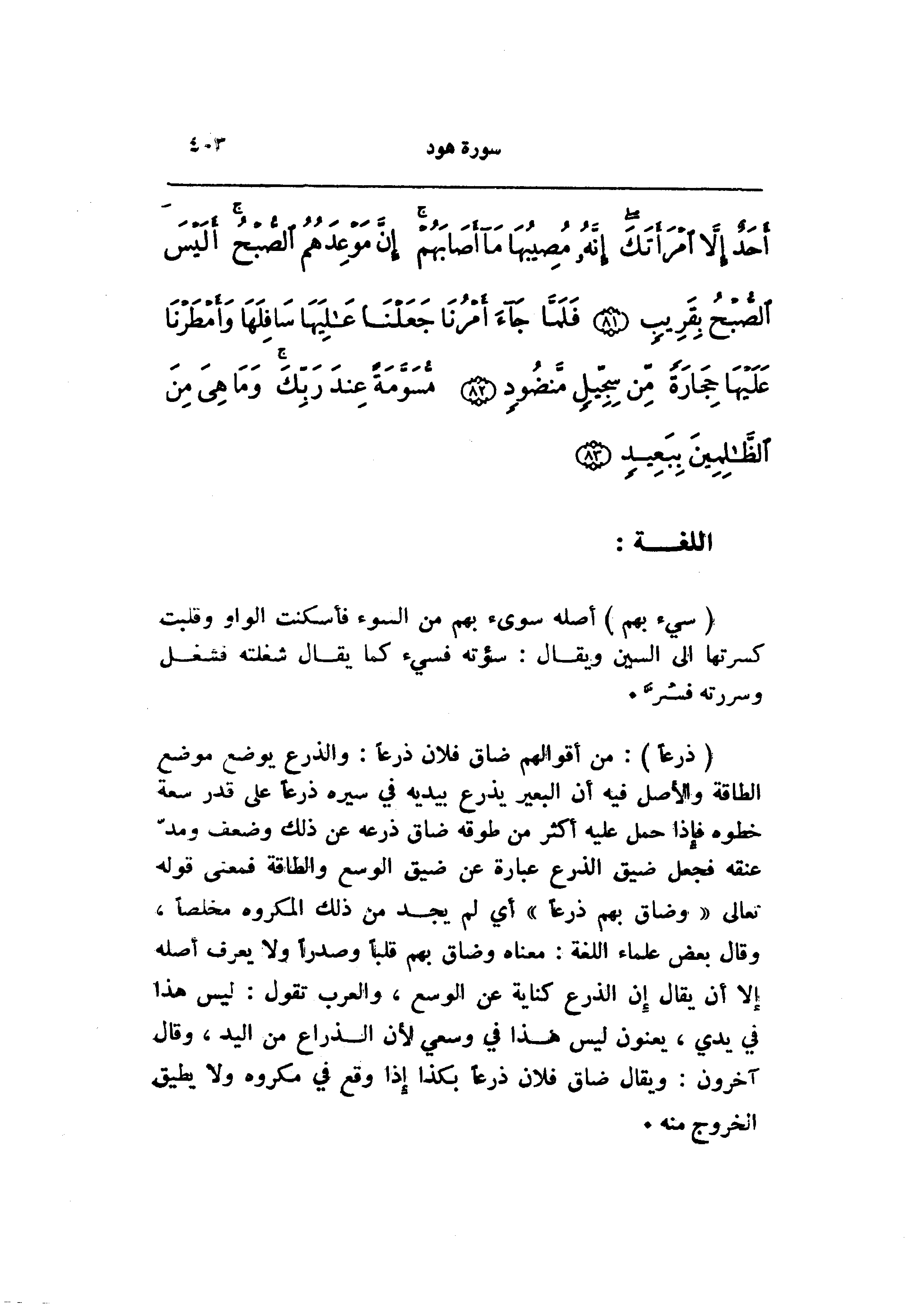 (ذَرْعاً) : من أقوالهم ضاق فلان ذرعا: والذرع يوضع موضع الطاقة والأصل فيه أن البعير يذرع بيديه في سيره ذرعا على قدر سعة خطوه فإذا حمل عليه أكثر من طوقه ضاق ذرعه عن ذلك وضعف ومدّ عنقه فجعل ضيق الذرع عبارة عن ضيق الوسع والطاقة فمعنى قوله تعالى «وضاق بهم ذرعا» أي لم يجد من ذلك المكروه مخلصا، وقال بعض علماء اللغة: معناه وضاق بهم قلبا وصدرا ولا يعرف أصله إلا أن يقال إن الذرع كناية عن الوسع، والعرب تقول: ليس هذا في يدي، يعنون ليس هذا في وسعي لأن الذراع من اليد، وقال آخرون: ويقال ضاق فلان ذرعا بكذا إذا وقع في مكروه ولا يطيق الخروج منه.