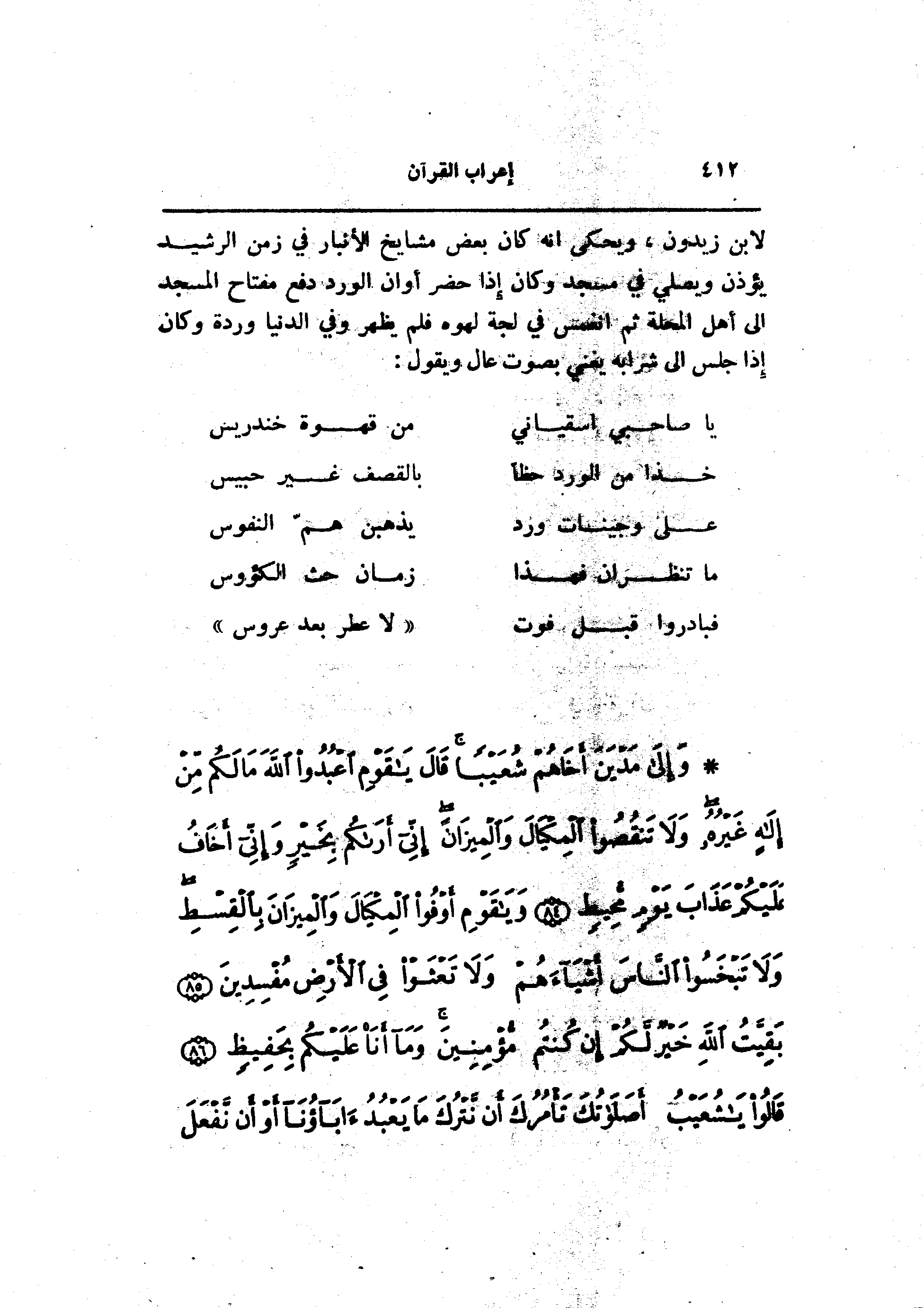 وَإِلى مَدْيَنَ أَخاهُمْ شُعَيْباً قالَ يا قَوْمِ اعْبُدُوا اللَّهَ ما لَكُمْ مِنْ إِلهٍ غَيْرُهُ وَلا تَنْقُصُوا الْمِكْيالَ وَالْمِيزانَ إِنِّي أَراكُمْ بِخَيْرٍ وَإِنِّي أَخافُ عَلَيْكُمْ عَذابَ يَوْمٍ مُحِيطٍ (84) وَيا قَوْمِ أَوْفُوا الْمِكْيالَ وَالْمِيزانَ بِالْقِسْطِ وَلا تَبْخَسُوا النَّاسَ أَشْياءَهُمْ وَلا تَعْثَوْا فِي الْأَرْضِ مُفْسِدِينَ (85) بَقِيَّتُ اللَّهِ خَيْرٌ لَكُمْ إِنْ كُنْتُمْ مُؤْمِنِينَ وَما أَنَا عَلَيْكُمْ بِحَفِيظٍ (86) قالُوا يا شُعَيْبُ أَصَلاتُكَ تَأْمُرُكَ أَنْ نَتْرُكَ ما يَعْبُدُ آباؤُنا أَوْ أَنْ نَفْعَلَ فِي أَمْوالِنا ما نَشؤُا إِنَّكَ لَأَنْتَ الْحَلِيمُ الرَّشِيدُ (87) قالَ يا قَوْمِ أَرَأَيْتُمْ إِنْ كُنْتُ عَلى بَيِّنَةٍ مِنْ رَبِّي وَرَزَقَنِي مِنْهُ رِزْقاً حَسَناً وَما أُرِيدُ أَنْ أُخالِفَكُمْ إِلى ما أَنْهاكُمْ عَنْهُ إِنْ أُرِيدُ إِلاَّ الْإِصْلاحَ مَا اسْتَطَعْتُ وَما تَوْفِيقِي إِلاَّ بِاللَّهِ عَلَيْهِ تَوَكَّلْتُ وَإِلَيْهِ أُنِيبُ (88)