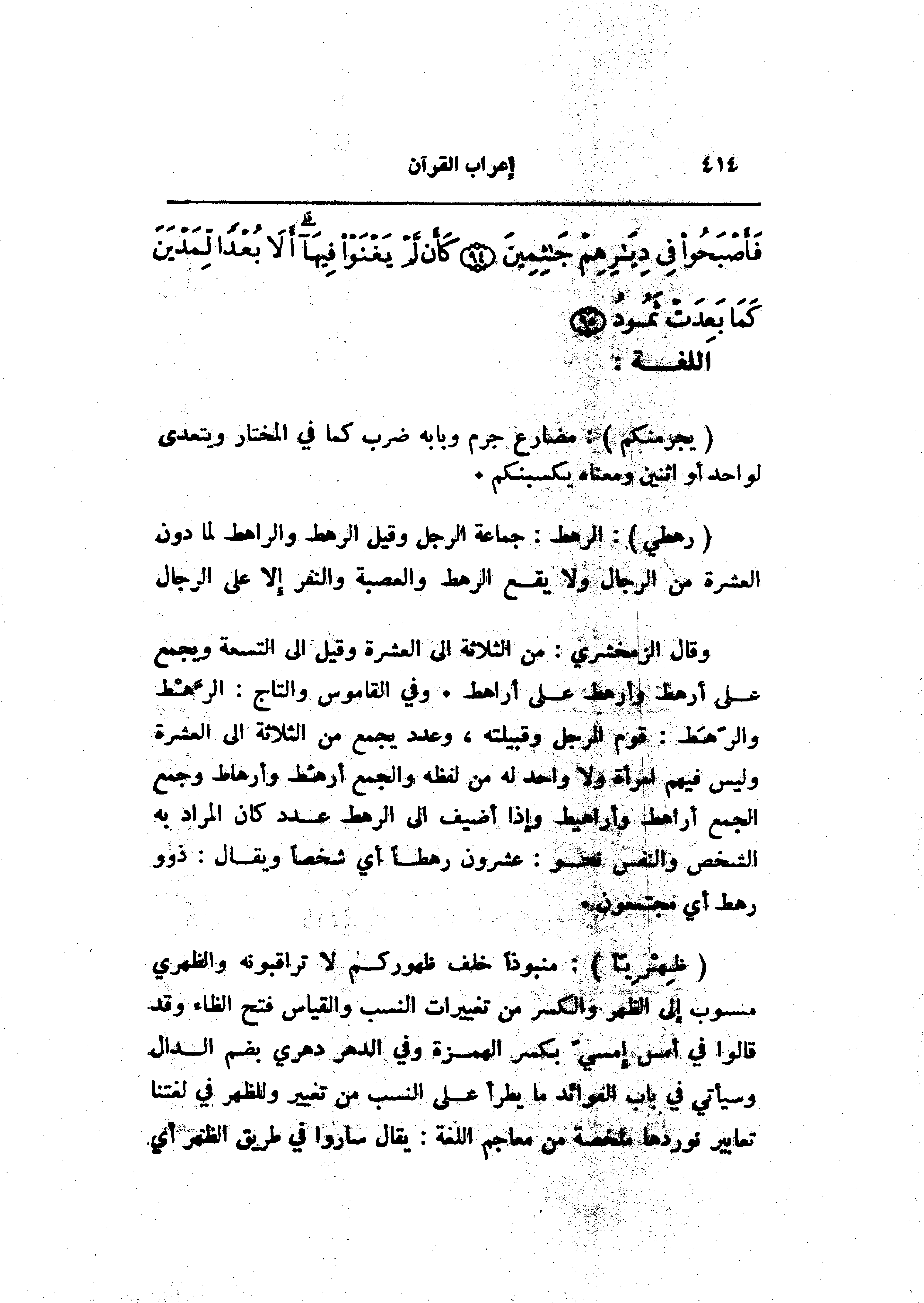 (رَهْطِي) : الرهط: جماعة الرجل وقيل الرهط والراهط لما دون العشرة من الرجال ولا يقع الرهط والعصبة والنفر إلا على الرجال وقال الزمخشري: من الثلاثة الى العشرة وقيل الى التسعة ويجمع على أرهط وأرهط على أراهط. وفي القاموس والتاج: الرّهط والرّهط: قوم الرجل وقبيلته، وعدد يجمع من الثلاثة الى العشرة وليس فيهم امرأة ولا واحد له من لفظه والجمع أرهط وأرهاط وجمع الجمع أراهط وأراهيط وإذا أضيف الى الرهط عدد كان المراد به الشخص والنفس نحو: عشرون رهطا أي شخصا ويقال: ذوو رهط أي مجتمعون.