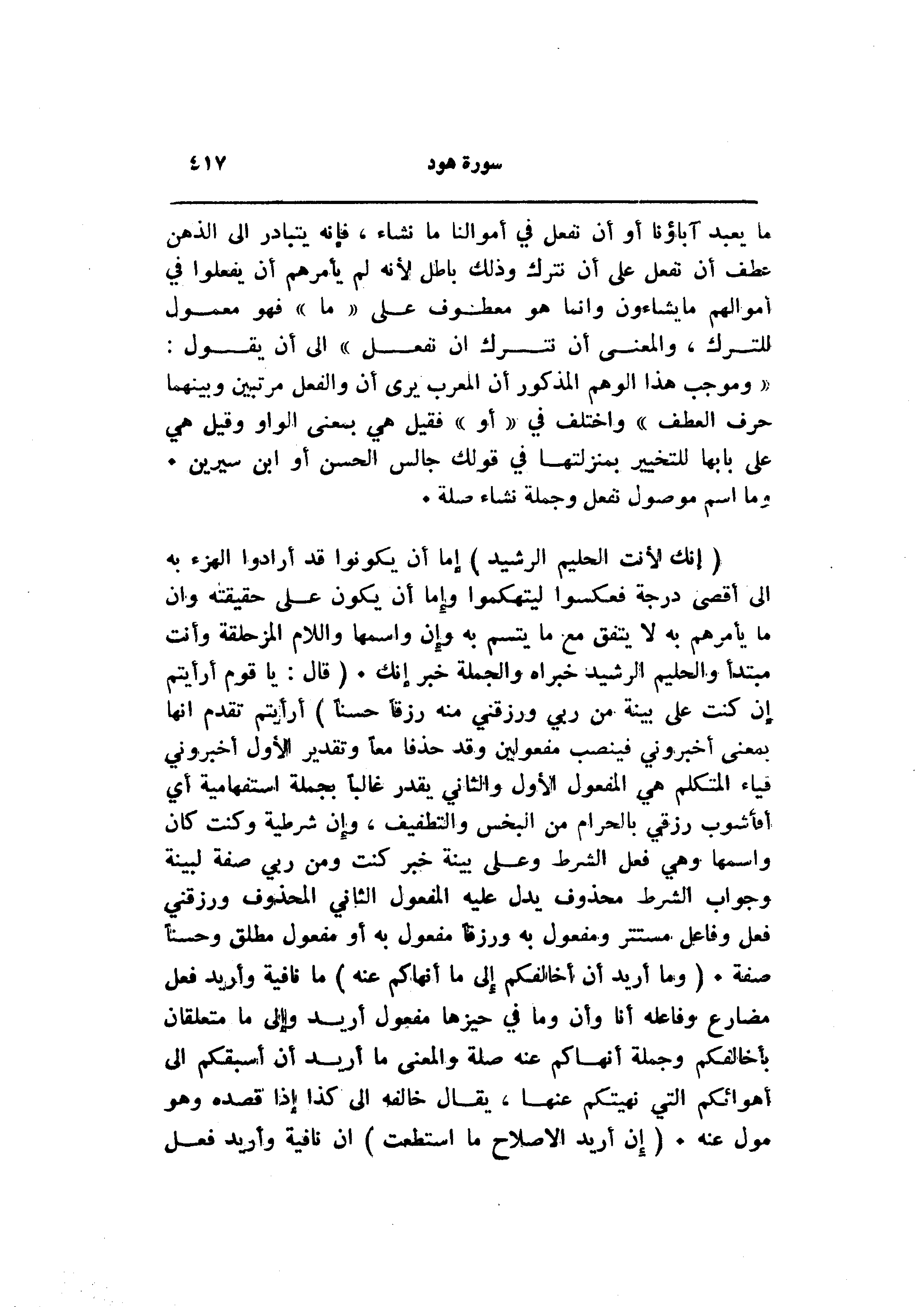 (إِنَّكَ لَأَنْتَ الْحَلِيمُ الرَّشِيدُ) إما أن يكونوا قد أرادوا الهزء به الى أقصى درجة فعكسوا ليتهكموا وإما أن يكون على حقيقته وان ما يأمرهم به لا يتفق مع ما يتسم به وإن واسمها واللام المزحلقة وأنت مبتدأ والحليم الرشيد خبراه والجملة خبر إنك. (قالَ: يا قَوْمِ أَرَأَيْتُمْ إِنْ كُنْتُ عَلى بَيِّنَةٍ مِنْ رَبِّي وَرَزَقَنِي مِنْهُ رِزْقاً حَسَناً) أرأيتم تقدم انها بمعنى أخبروني فينصب مفعولين وقد حذفا معا وتقدير الأول أخبروني فياء المتكلم هي المفعول الأول والثاني يقدر غالبا بجملة استفهامية أي أفأشوب رزقي بالحرام من البخس والتطفيف، وإن شرطية وكنت كان واسمها وهي فعل الشرط وعلى بينة خبر كنت ومن ربي صفة لبينة وجواب الشرط محذوف يدل عليه المفعول الثاني المحذوف ورزقني فعل وفاعل مستتر ومفعول به ورزقا مفعول به أو مفعول مطلق وحسنا صفة. (وَما أُرِيدُ أَنْ أُخالِفَكُمْ إِلى ما أَنْهاكُمْ عَنْهُ) ما نافية وأريد فعل مضارع وفاعله أنا وأن وما في حيزها مفعول أريد وإلى ما متعلقان بأخالفكم وجملة أنهاكم عنه صلة والمعنى ما أريد أن أسبقكم الى أهوائكم التي نهيتكم عنها، يقال خالفه الى كذا إذا قصده وهو مول عنه. (إِنْ أُرِيدُ إِلَّا الْإِصْلاحَ مَا اسْتَطَعْتُ) ان نافية وأريد فعل