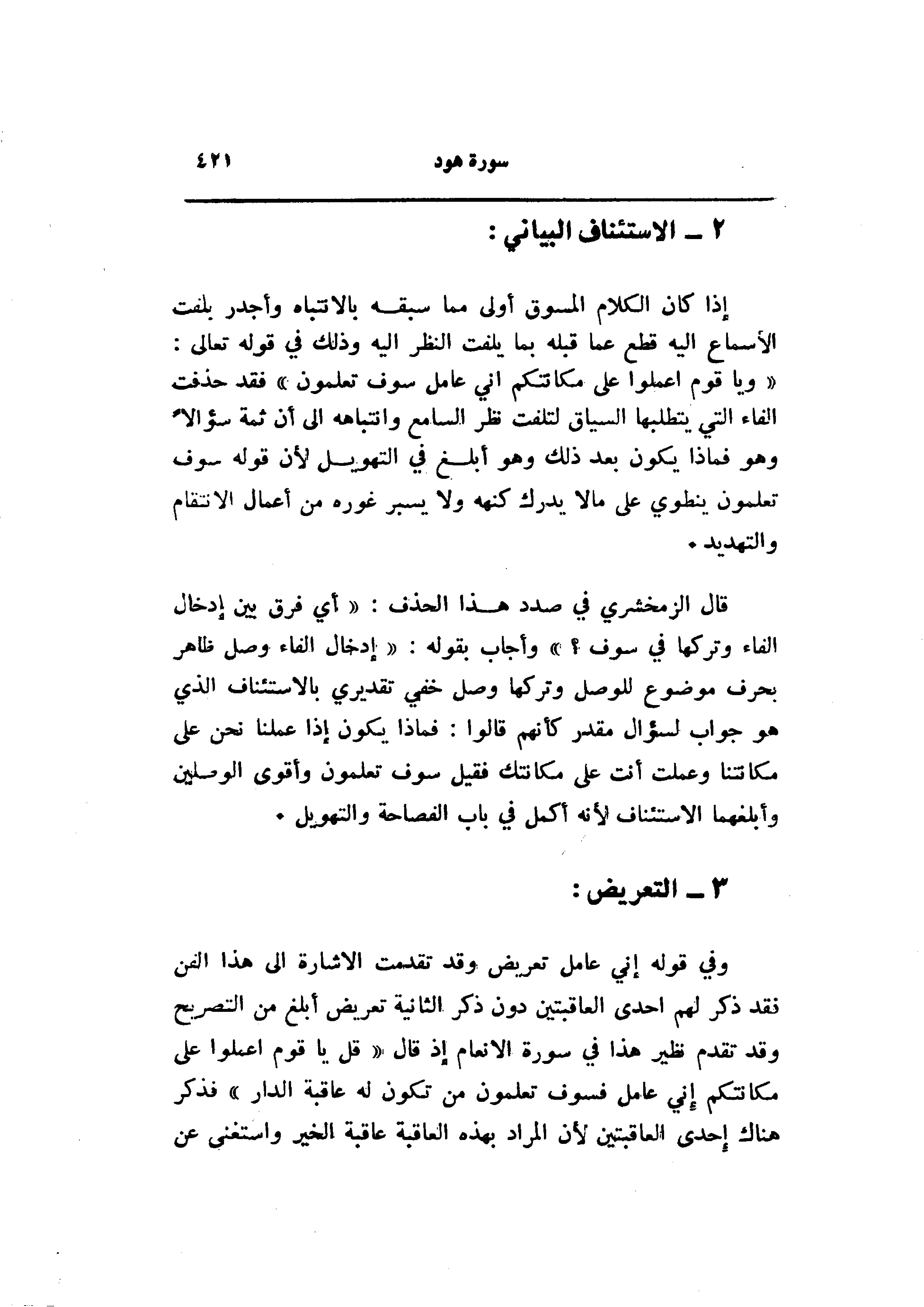 «ويا قوم اعلموا على مكانتكم اني عامل سوف تعلمون» فقد حذفت الفاء التي يتطلبها السياق لتلفت نظر السامع وانتباهه الى أن ثمة سؤالا وهو فماذا يكون بعد ذلك وهو أبلغ في التهويل لأن قوله سوف تعلمون ينطوي على ما لا يدرك كنهه ولا يسبر غوره من أعمال الانتقام والتهديد.