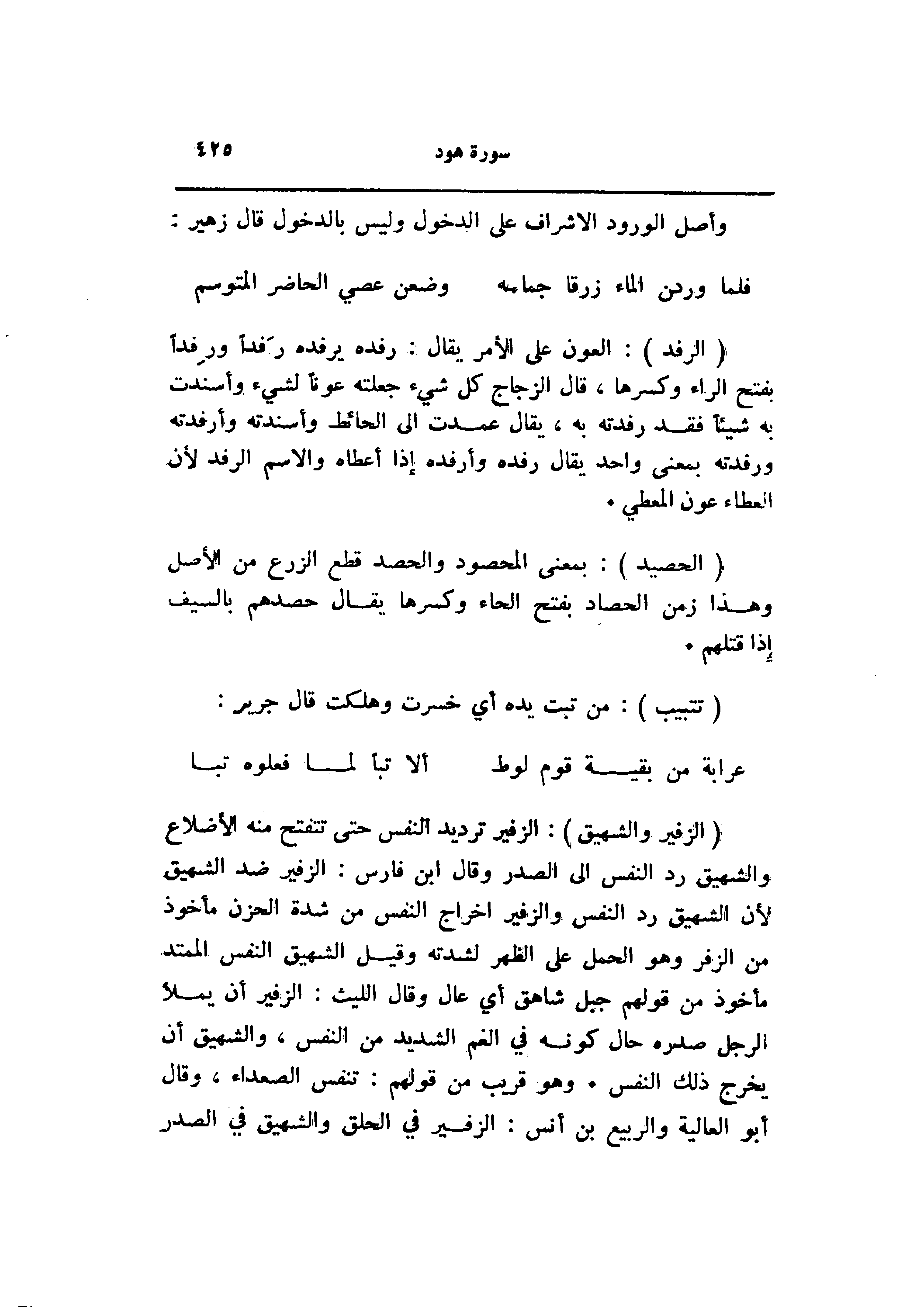 (الزفير والشهيق) : الزفير ترديد النفس حتى تتفتح منه الأضلاع والشهيق رد النفس الى الصدر وقال ابن فارس: الزفير ضد الشهيق لأن الشهيق رد النفس والزفير إخراج النفس من شدة الحزن مأخوذ من الزفر وهو الحمل على الظهر لشدته وقيل الشهيق النفس الممتد مأخوذ من قولهم جبل شاهق أي عال وقال الليث: الزفير أن يملأ الرجل صدره حال كونه في الغم الشديد من النفس، والشهيق أن يخرج ذلك النفس. وهو قريب من قولهم: تنفس الصعداء، وقال أبو العالية والربيع بن أنس: الزفير في الحلق والشهيق في الصدر