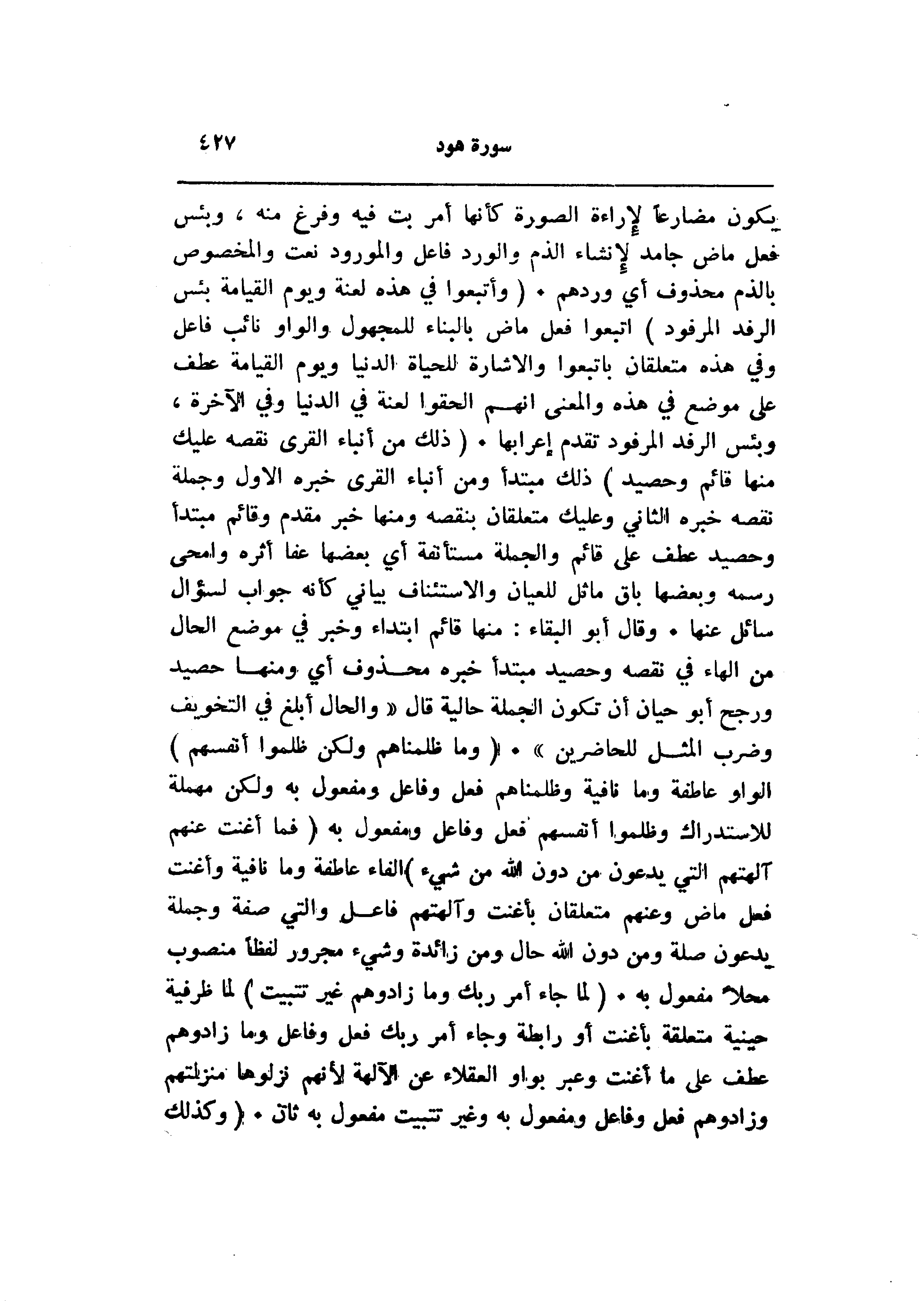 يكون مضارعا لإراءة الصورة كأنها أمر بت فيه وفرغ منه، وبئس فعل ماض جامد لإنشاء الذم والورد فاعل والمورود نعت والمخصوص بالذم محذوف أي وردهم. (وَأُتْبِعُوا فِي هذِهِ لَعْنَةً وَيَوْمَ الْقِيامَةِ بِئْسَ الرِّفْدُ الْمَرْفُودُ) اتبعوا فعل ماض بالبناء للمجهول والواو نائب فاعل وفي هذه متعلقان باتبعوا والاشارة للحياة الدنيا ويوم القيامة عطف على موضع في هذه والمعنى انهم الحقوا لعنة في الدنيا وفي الآخرة، وبئس الرفد المرفود تقدم إعرابها. (ذلِكَ مِنْ أَنْباءِ الْقُرى نَقُصُّهُ عَلَيْكَ مِنْها قائِمٌ وَحَصِيدٌ) ذلك مبتدأ ومن أنباء القرى خبره الاول وجملة نقصه خبره الثاني وعليك متعلقان بنقصه ومنها خبر مقدم وقائم مبتدأ وحصيد عطف على قائم والجملة مستأنفة أي بعضها عفا أثره وامحى رسمه وبعضها باق ماثل للعيان والاستئناف بياني كأنه جواب لسؤال سائل عنها. وقال أبو البقاء: منها قائم ابتداء وخبر في موضع الحال من الهاء في نقصه وحصيد مبتدأ خبره محذوف أي ومنها حصيد ورجح أبو حيان أن تكون الجملة حالية قال «والحال أبلغ في التخويف وضرب المثل للحاضرين» . (وَما ظَلَمْناهُمْ وَلكِنْ ظَلَمُوا أَنْفُسَهُمْ) الواو عاطفة وما نافية وظلمناهم فعل وفاعل ومفعول به ولكن مهملة للاستدراك وظلموا أنفسهم فعل وفاعل ومفعول به (فَما أَغْنَتْ عَنْهُمْ آلِهَتُهُمُ الَّتِي يَدْعُونَ مِنْ دُونِ اللَّهِ مِنْ شَيْءٍ) الفاء عاطفة وما نافية وأغنت فعل ماض وعنهم متعلقان بأغنت وآلهتهم فاعل والتي صفة وجملة يدعون صلة ومن دون الله حال ومن زائدة وشيء مجرور لفظا منصوب محلا مفعول به. (لَمَّا جاءَ أَمْرُ رَبِّكَ وَما زادُوهُمْ غَيْرَ تَتْبِيبٍ) لما ظرفية حينية متعلقة بأغنت أو رابطة وجاء أمر ربك فعل وفاعل وما زادوهم عطف على ما أغنت وعبر بواو العقلاء عن الآلهة لأنهم نزلوها منزلتهم وزادوهم فعل وفاعل ومفعول به وغير تتبيت مفعول به ثان. (وَكَذلِكَ