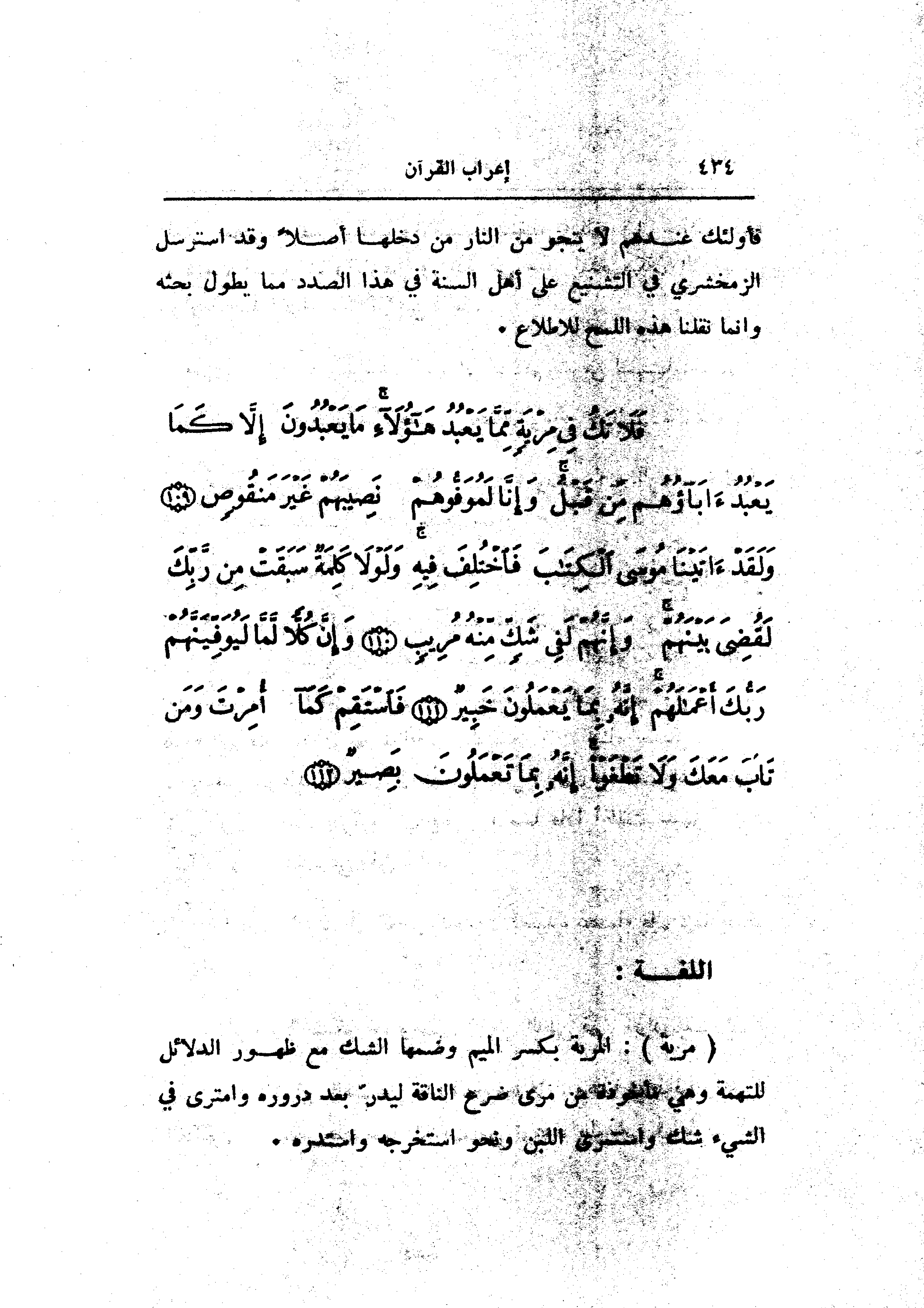 فَلا تَكُ فِي مِرْيَةٍ مِمَّا يَعْبُدُ هؤُلاءِ ما يَعْبُدُونَ إِلاَّ كَما يَعْبُدُ آباؤُهُمْ مِنْ قَبْلُ وَإِنَّا لَمُوَفُّوهُمْ نَصِيبَهُمْ غَيْرَ مَنْقُوصٍ (109) وَلَقَدْ آتَيْنا مُوسَى الْكِتابَ فَاخْتُلِفَ فِيهِ وَلَوْلا كَلِمَةٌ سَبَقَتْ مِنْ رَبِّكَ لَقُضِيَ بَيْنَهُمْ وَإِنَّهُمْ لَفِي شَكٍّ مِنْهُ مُرِيبٍ (110) وَإِنَّ كُلاًّ لَمَّا لَيُوَفِّيَنَّهُمْ رَبُّكَ أَعْمالَهُمْ إِنَّهُ بِما يَعْمَلُونَ خَبِيرٌ (111) فَاسْتَقِمْ كَما أُمِرْتَ وَمَنْ تابَ مَعَكَ وَلا تَطْغَوْا إِنَّهُ بِما تَعْمَلُونَ بَصِيرٌ (112)