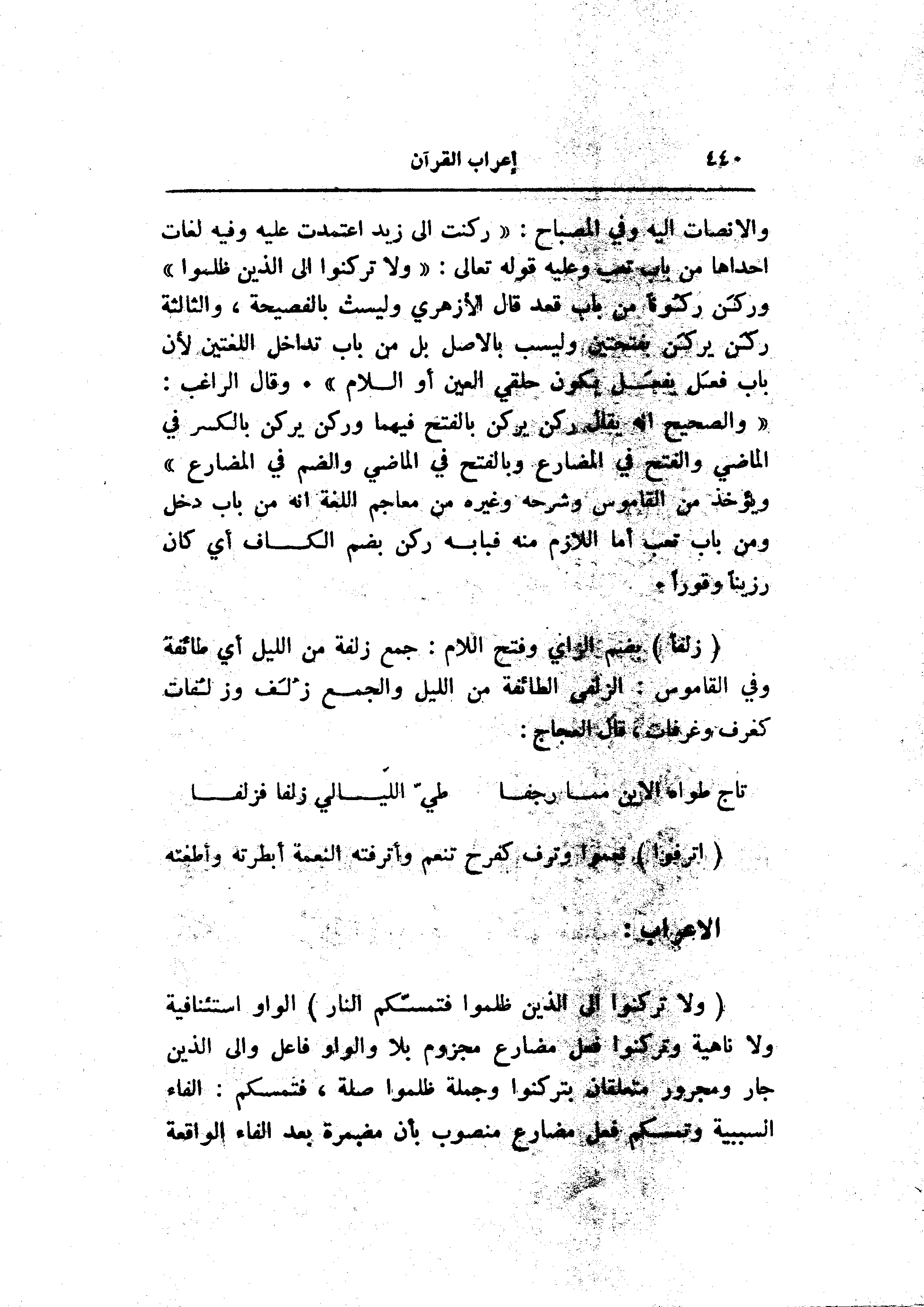 (وَلا تَرْكَنُوا إِلَى الَّذِينَ ظَلَمُوا فَتَمَسَّكُمُ النَّارُ) الواو استئنافية ولا ناهية وتركنوا فعل مضارع مجزوم بلا والواو فاعل والى الذين جار ومجرور متعلقان بتركنوا وجملة ظلموا صلة، فتمسكم: الفاء السببية وتمسكم فعل مضارع منصوب بأن مضمرة بعد الفاء الواقعة