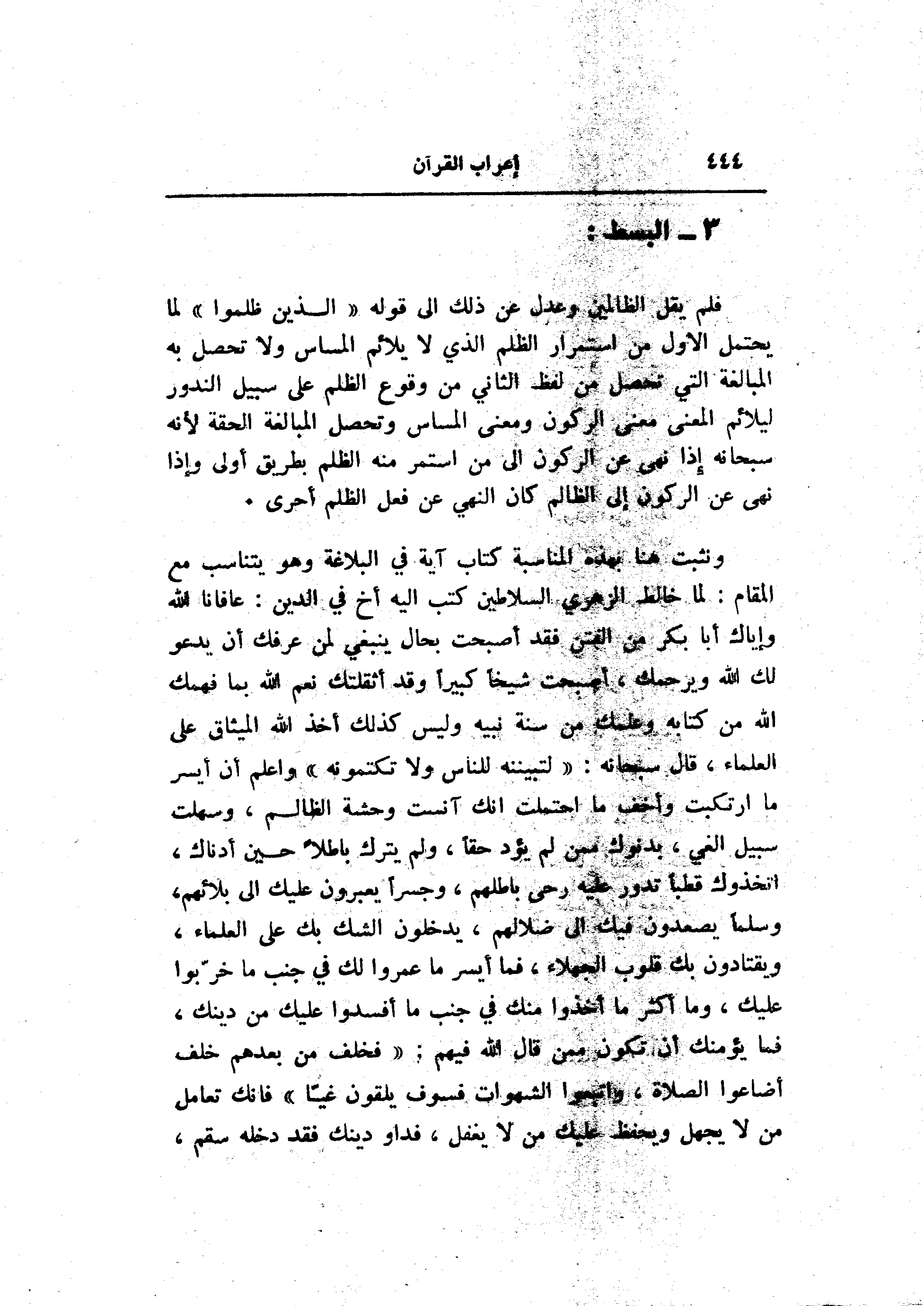 ونثبت هنا بهذه المناسبة كتاب آية في البلاغة وهو يتناسب مع المقام: لما خالط الزهري السلاطين كتب اليه أخ في الدين: عافانا الله وإياك أبا بكر من الفتن فقد أصبحت بحال ينبغي لمن عرفك أن يدعو لك الله ويرحمك، أصبحت شيخا كبيرا وقد أثقلتك نعم الله بما فهمك الله من كتابه وعلمك من سنة نبيه وليس كذلك أخذ الله الميثاق على العلماء، قال سبحانه: «لتبيننه للناس ولا تكتمونه» واعلم أن أيسر ما ارتكبت وأخف ما احتملت انك آنست وحشة الظالم، وسهلت سبيل الغي، بدنوك ممن لم يؤد حقا، ولم يترك باطلا حين أدناك، اتخذوك قطبا تدور عليه رحى باطلهم، وجسرا يعبرون عليك الى بلائهم، وسلما يصعدون فيك الى ضلالهم، يدخلون الشك بك على العلماء، ويقتادون بك قلوب الجهلاء، فما أيسر ما عمروا لك في جنب ما خرّبوا عليك، وما أكثر ما أخذوا منك في جنب ما أفسدوا عليك من دينك، فما يؤمنك أن تكون ممن قال الله فيهم: «فخلف من بعدهم خلف أضاعوا الصلاة، واتبعوا الشهوات فسوف يلقون غيّا» فانك تعامل من لا يجهل ويحفظ عليك من لا يغفل، فدا ودينك فقد دخله سقم،