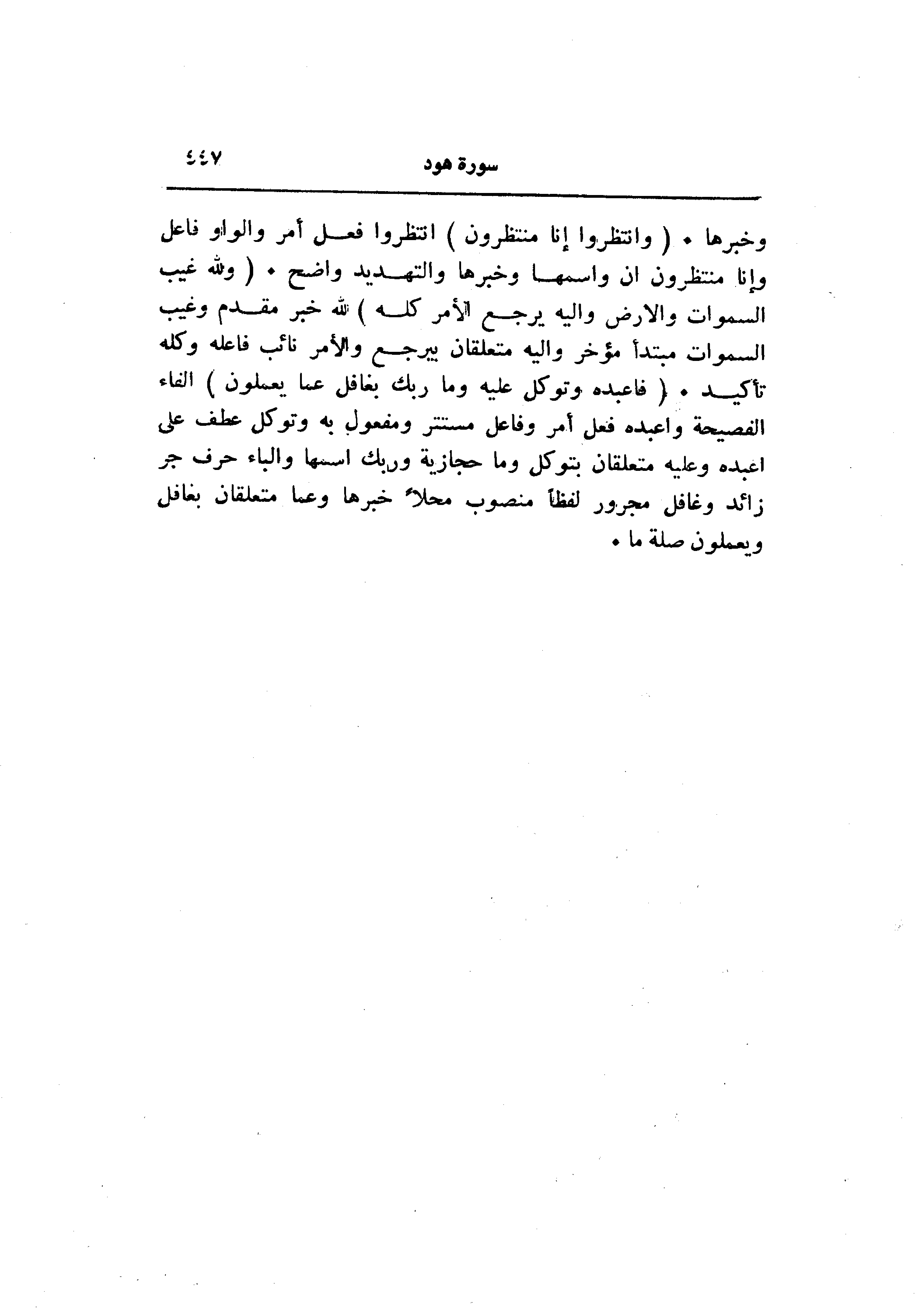 وخبرها. (وَانْتَظِرُوا إِنَّا مُنْتَظِرُونَ) انتظروا فعل أمر والواو فاعل وإنا منتظرون ان واسمها وخبرها والتهديد واضح. (وَلِلَّهِ غَيْبُ السَّماواتِ وَالْأَرْضِ وَإِلَيْهِ يُرْجَعُ الْأَمْرُ كُلُّهُ) لله خبر مقدم وغيب السموات مبتدأ مؤخر واليه متعلقان بيرجع والأمر نائب فاعله وكله تأكيد. (فَاعْبُدْهُ وَتَوَكَّلْ عَلَيْهِ وَما رَبُّكَ بِغافِلٍ عَمَّا تَعْمَلُونَ) الفاء الفصيحة واعبده فعل أمر وفاعل مستتر ومفعول به وتوكل عطف على اعبده وعليه متعلقان بتوكل وما حجازية وربك اسمها والباء حرف جر زائد وغافل مجرور لفظا منصوب محلا خبرها وعما متعلقان بغافل ويعملون صلة ما.