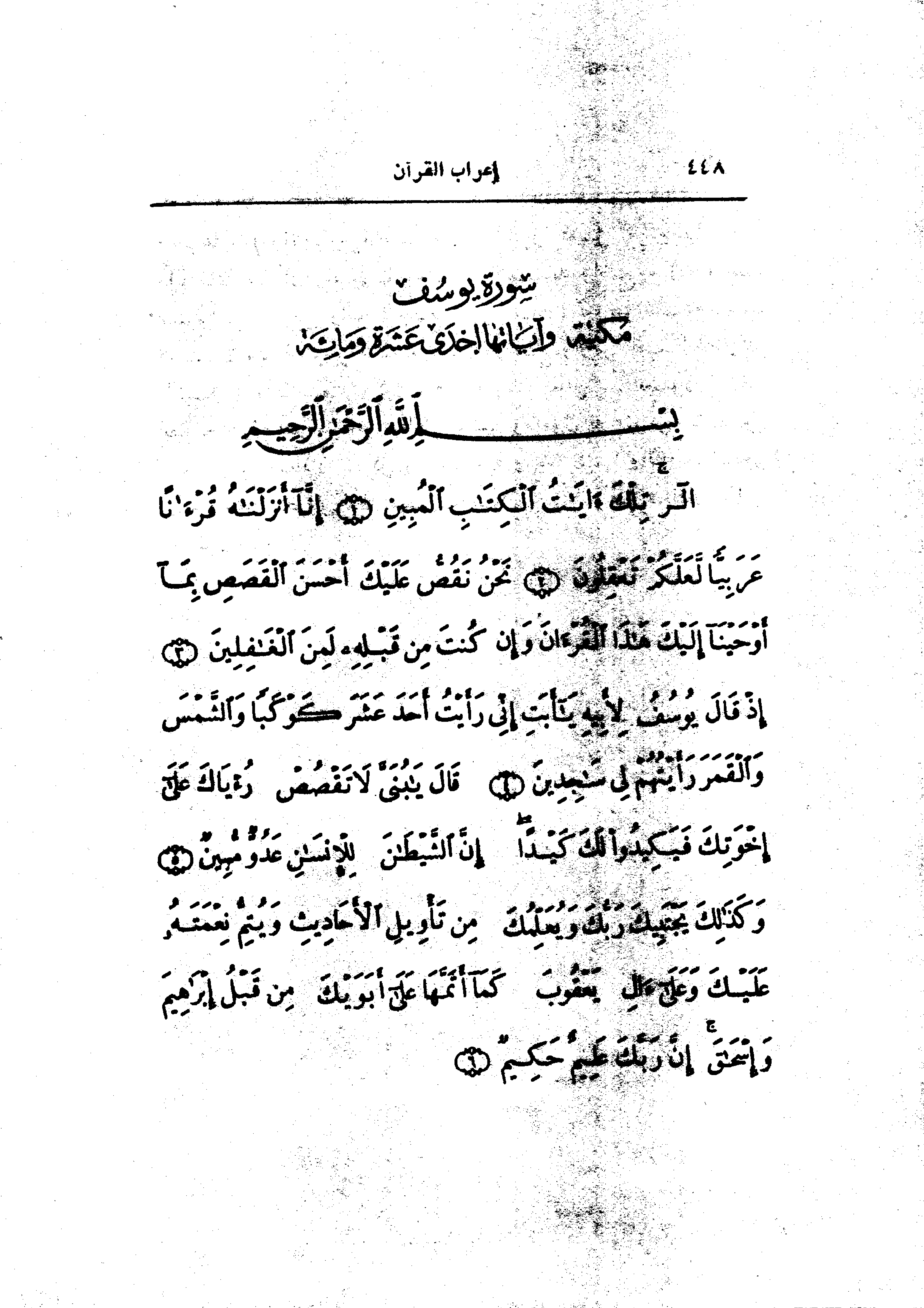 الر تِلْكَ آياتُ الْكِتابِ الْمُبِينِ (1) إِنَّا أَنْزَلْناهُ قُرْآناً عَرَبِيًّا لَعَلَّكُمْ تَعْقِلُونَ (2) نَحْنُ نَقُصُّ عَلَيْكَ أَحْسَنَ الْقَصَصِ بِما أَوْحَيْنا إِلَيْكَ هذَا الْقُرْآنَ وَإِنْ كُنْتَ مِنْ قَبْلِهِ لَمِنَ الْغافِلِينَ (3) إِذْ قالَ يُوسُفُ لِأَبِيهِ يا أَبَتِ إِنِّي رَأَيْتُ أَحَدَ عَشَرَ كَوْكَباً وَالشَّمْسَ وَالْقَمَرَ رَأَيْتُهُمْ لِي ساجِدِينَ (4)