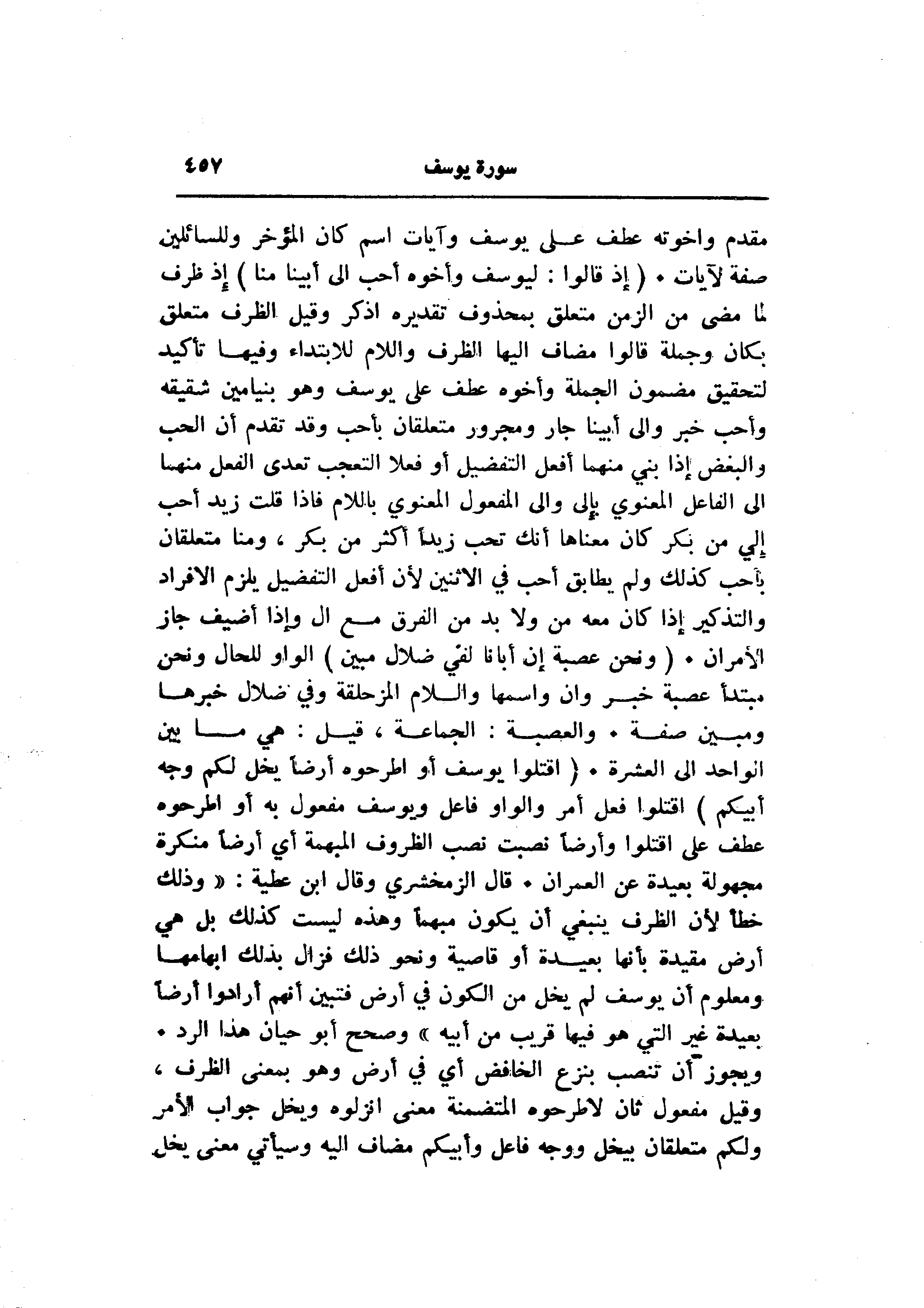مقدم واخوته عطف على يوسف وآيات اسم كان المؤخر وللسائلين صفة لآيات. (إِذْ قالُوا: لَيُوسُفُ وَأَخُوهُ أَحَبُّ إِلى أَبِينا مِنَّا) إذ ظرف لما مضى من الزمن متعلق بمحذوف تقديره اذكر وقيل الظرف متعلق بكان وجملة قالوا مضاف إليها الظرف واللام للابتداء وفيها تأكيد لتحقيق مضمون الجملة وأخوه عطف على يوسف وهو بنيامين شقيقه وأحب خبر والى أبينا جار ومجرور متعلقان بأحب وقد تقدم أن الحب والبغض إذا بني منهما أفعل التفضيل أو فعلا التعجب تعدى الفعل منهما الى الفاعل المعنوي بإلى والى المفعول المعنوي باللام فاذا قلت زيد أحب إلي من بكر كان معناها أنك تحب زيدا أكثر من بكر، ومنا متعلقان بأحب كذلك ولم يطابق أحب في الاثنين لأن أفعل التفضيل يلزم الافراد والتذكير إذا كان معه من ولا بد من الفرق مع ال وإذا أضيف جاز الأمران. (وَنَحْنُ عُصْبَةٌ إِنَّ أَبانا لَفِي ضَلالٍ مُبِينٍ) الواو للحال ونحن مبتدأ عصبة خبر وان واسمها واللام المزحلقة وفي ضلال خبرها ومبين صفة. والعصبة: الجماعة، قيل: هي ما بين الواحد الى العشرة. (اقْتُلُوا يُوسُفَ أَوِ اطْرَحُوهُ أَرْضاً يَخْلُ لَكُمْ وَجْهُ أَبِيكُمْ) اقتلوا فعل أمر والواو فاعل ويوسف مفعول به أو اطرحوه عطف على اقتلوا وأرضا نصبت نصب الظروف المبهمة أي أرضا منكرة مجهولة بعيدة عن العمران. قال الزمخشري وقال ابن عطية: «وذلك خطأ لأن الظرف ينبغي أن يكون مبهما وهذه ليست كذلك بل هي أرض مقيدة بأنها بعيدة أو قاصية ونحو ذلك فزال بذلك ابهامها ومعلوم أن يوسف لم يخل من الكون في أرض فتبين أنهم أرادوا أرضا بعيدة غير التي هو فيها قريب من أبيه» وصحح أبو حيان هذا الرد.