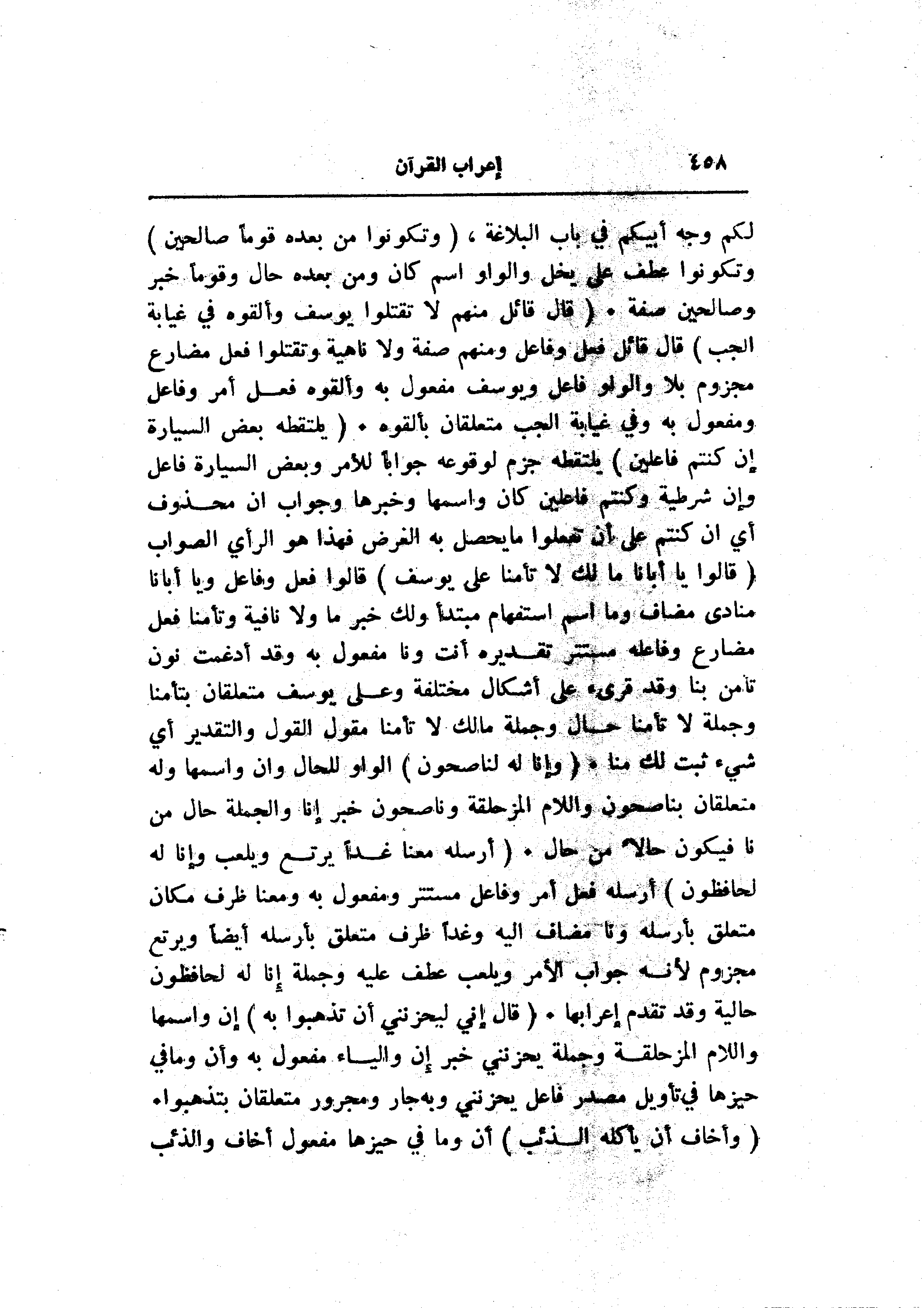 لكم وجه أبيكم في باب البلاغة، (وَتَكُونُوا مِنْ بَعْدِهِ قَوْماً صالِحِينَ) وتكونوا عطف على يخل والواو اسم كان ومن بعده حال وقوما خبر وصالحين صفة. (قالَ قائِلٌ مِنْهُمْ لا تَقْتُلُوا يُوسُفَ وَأَلْقُوهُ فِي غَيابَتِ الْجُبِّ) قال قائل فعل وفاعل ومنهم صفة ولا ناهية وتقتلوا فعل مضارع مجزوم بلا والواو فاعل ويوسف مفعول به وألقوه فعل أمر وفاعل ومفعول به وفي غيابة الجب متعلقان بألقوه. (يَلْتَقِطْهُ بَعْضُ السَّيَّارَةِ إِنْ كُنْتُمْ فاعِلِينَ) يلتقطه جزم لوقوعه جوابا للأمر وبعض السيارة فاعل وإن شرطية وكنتم فاعلين كان واسمها وخبرها وجواب ان محذوف أي ان كنتم على أن تفعلوا ما يحصل به الغرض فهذا هو الرأي الصواب (قالُوا يا أَبانا ما لَكَ لا تَأْمَنَّا عَلى يُوسُفَ) قالوا فعل وفاعل ويا أبانا منادى مضاف وما اسم استفهام مبتدأ ولك خبر ما ولا نافية وتأمنا فعل مضارع وفاعله مستتر تقديره أنت ونا مفعول به وقد أدغمت نون تأمن بنا وقد قرىء على أشكال مختلفة وعلى يوسف متعلقان بتأمنا وجملة لا تأمنا حال وجملة مالك لا تأمنا مقول القول والتقدير أي شيء ثبت لك منا. (وَإِنَّا لَهُ لَناصِحُونَ) الواو للحال وان واسمها وله متعلقان بناصحون واللام المزحلقة وناصحون خبر إنا والجملة حال من نا فيكون حالا من حال. (أَرْسِلْهُ مَعَنا غَداً يَرْتَعْ وَيَلْعَبْ وَإِنَّا لَهُ لَحافِظُونَ) أرسله فعل أمر وفاعل مستتر ومفعول به ومعنا ظرف مكان متعلق بأرسله ونا مضاف اليه وغدا ظرف متعلق بأرسله أيضا ويرتع مجزوم لأنه جواب الأمر ويلعب عطف عليه وجملة إنا له لحافظون حالية وقد تقدم إعرابها. (قالَ إِنِّي لَيَحْزُنُنِي أَنْ تَذْهَبُوا بِهِ) إن واسمها واللام المزحلقة وجملة يحزنني خبر إن والياء مفعول به وأن وما في حيزها في تأويل مصدر فاعل يحزنني وبه جار ومجرور متعلقان بتذهبوا.