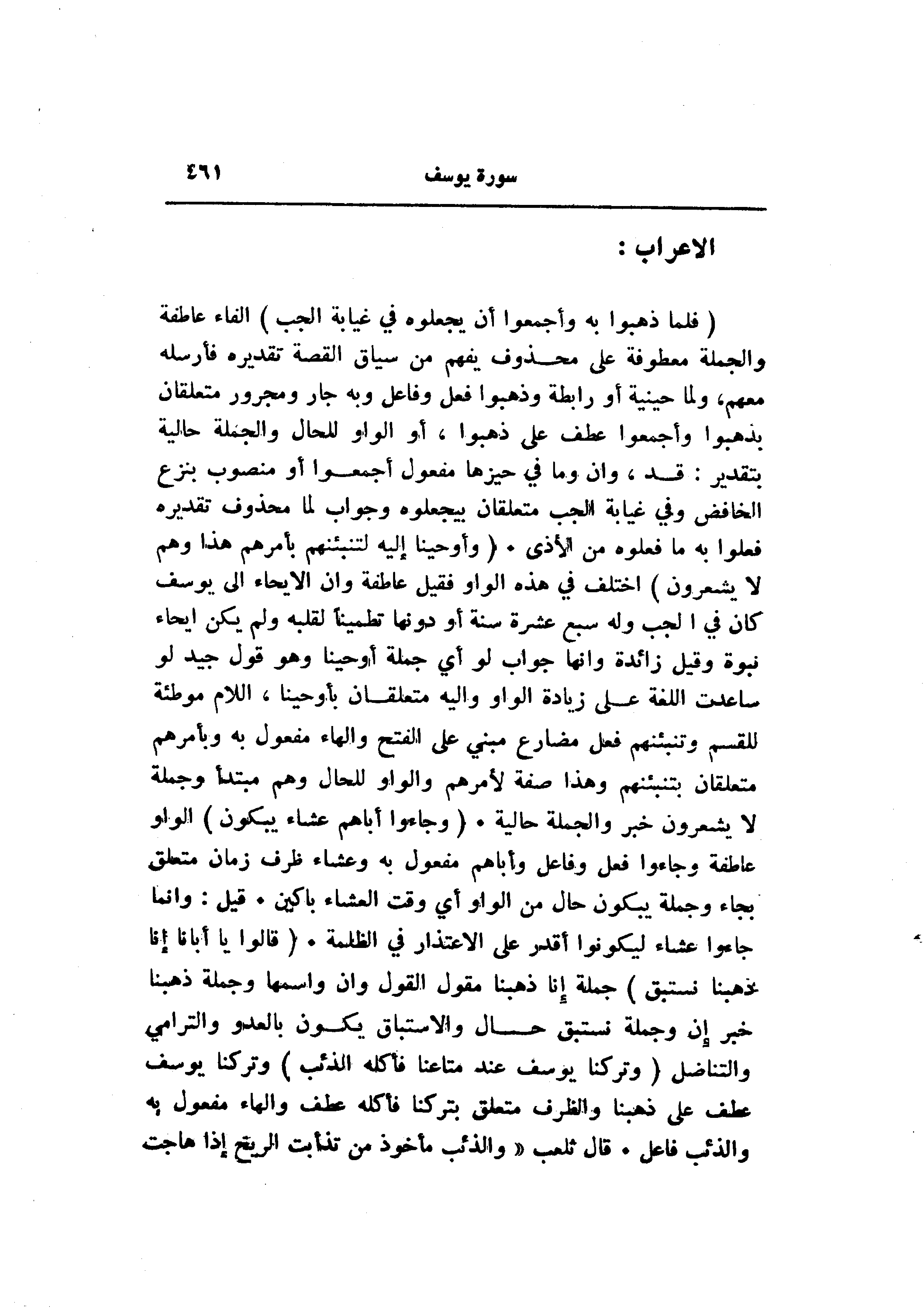 (فَلَمَّا ذَهَبُوا بِهِ وَأَجْمَعُوا أَنْ يَجْعَلُوهُ فِي غَيابَتِ الْجُبِّ) الفاء عاطفة والجملة معطوفة على محذوف يفهم من سياق القصة تقديره فأرسله معهم، ولما حينية أو رابطة وذهبوا فعل وفاعل وبه جار ومجرور متعلقان يذهبوا وأجمعوا عطف على ذهبوا، أو الواو للحال والجملة حالية بتقدير: قد، وان وما في حيزها مفعول أجمعوا أو منصوب بنزع الخافض وفي غيابة الجب متعلقان بيجعلوه وجواب لما محذوف تقديره فعلوا به ما فعلوه من الأذى. (وَأَوْحَيْنا إِلَيْهِ لَتُنَبِّئَنَّهُمْ بِأَمْرِهِمْ هذا وَهُمْ لا يَشْعُرُونَ) اختلف في هذه الواو فقيل عاطفة وان الإيحاء الى يوسف كان في الجب وله سبع عشرة سنة أو دونها تطمينا لقلبه ولم يكن ايحاء نبوة وقيل زائدة وانها جواب لو أي جملة أوحينا وهو قول جيد لو ساعدت اللغة على زيادة الواو واليه متعلقان بأوحينا، اللام موطئة للقسم وتنبئنهم فعل مضارع مبني على الفتح والهاء مفعول به وبأمرهم متعلقان بتنبئنهم وهذا صفة لأمرهم والواو للحال وهم مبتدأ وجملة لا يشعرون خبر والجملة حالية. (وَجاؤُ أَباهُمْ عِشاءً يَبْكُونَ) الواو عاطفة وجاءوا فعل وفاعل وأباهم مفعول به وعشاء ظرف زمان متعلق بجاء وجملة يبكون حال من الواو أي وقت العشاء باكين. قيل: وانما جاءوا عشاء ليكونوا أقدر على الاعتذار في الظلمة. (قالُوا يا أَبانا إِنَّا ذَهَبْنا نَسْتَبِقُ) جملة إنا ذهبنا مقول القول وان واسمها وجملة ذهبنا خبر إن وجملة نستبق حال والاستباق يكون بالعدو والترامي والتناضل (وَتَرَكْنا يُوسُفَ عِنْدَ مَتاعِنا فَأَكَلَهُ الذِّئْبُ) وتركنا يوسف عطف على ذهبنا والظرف متعلق بتركنا فأكله عطف والهاء مفعول به والذئب فاعل. قال ثعلب «والذئب مأخوذ من تذأبت الريح إذا هاجت