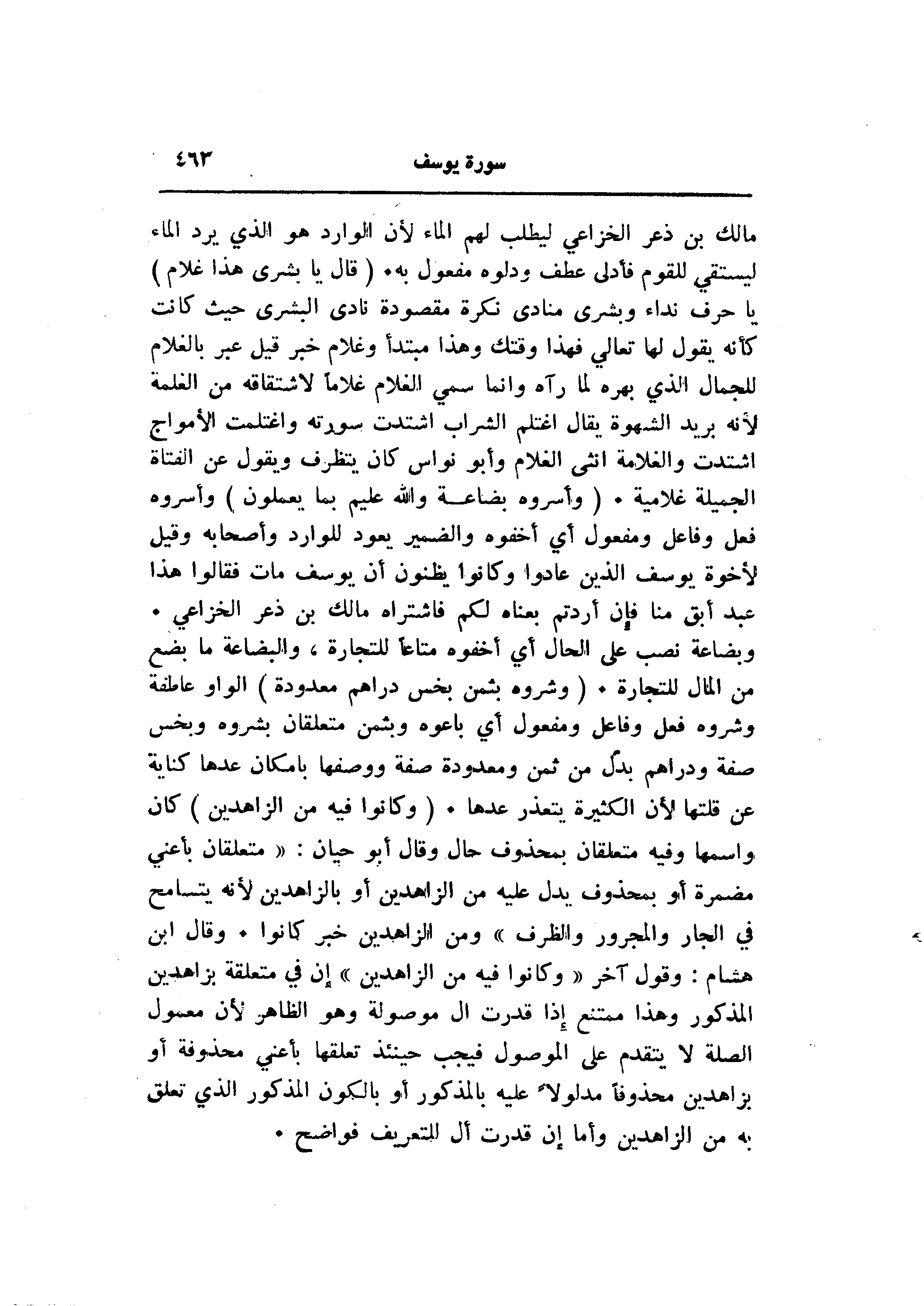 وبضاعة نصب على الحال أي أخفوه متاعا للتجارة، والبضاعة ما بضع من المال للتجارة. (وَشَرَوْهُ بِثَمَنٍ بَخْسٍ دَراهِمَ مَعْدُودَةٍ) الواو عاطفة وشروه فعل وفاعل ومفعول أي باعوه وبثمن متعلقان بشروه وبخس صفة ودراهم بدل من ثمن ومعدودة صفة ووصفها بامكان عدها كناية عن قلتها لأن الكثيرة يتعذر عدها. (وَكانُوا فِيهِ مِنَ الزَّاهِدِينَ) كان واسمها وفيه متعلقان بمحذوف حال وقال أبو حيان: «متعلقان بأعني مضمرة أو بمحذوف يدل عليه من الزاهدين أو بالزاهدين لأنه يتسامح في الجار والمجرور والظرف» ومن الزاهدين خبر كانوا. وقال ابن هشام: وقول آخر «وكانوا فيه من الزاهدين» إن في متعلقة بزاهدين المذكور وهذا ممتنع إذا قدرت ال موصولة وهو الظاهر لأن معمول الصلة لا يتقدم على الموصول فيجب حينئذ تعلقها بأعني محذوفة أو بزاهدين محذوفا مدلو لا عليه بالمذكور أو بالكون المذكور الذي تعلق به من الزاهدين وأما إن قدرت أل للتعريف فواضح.