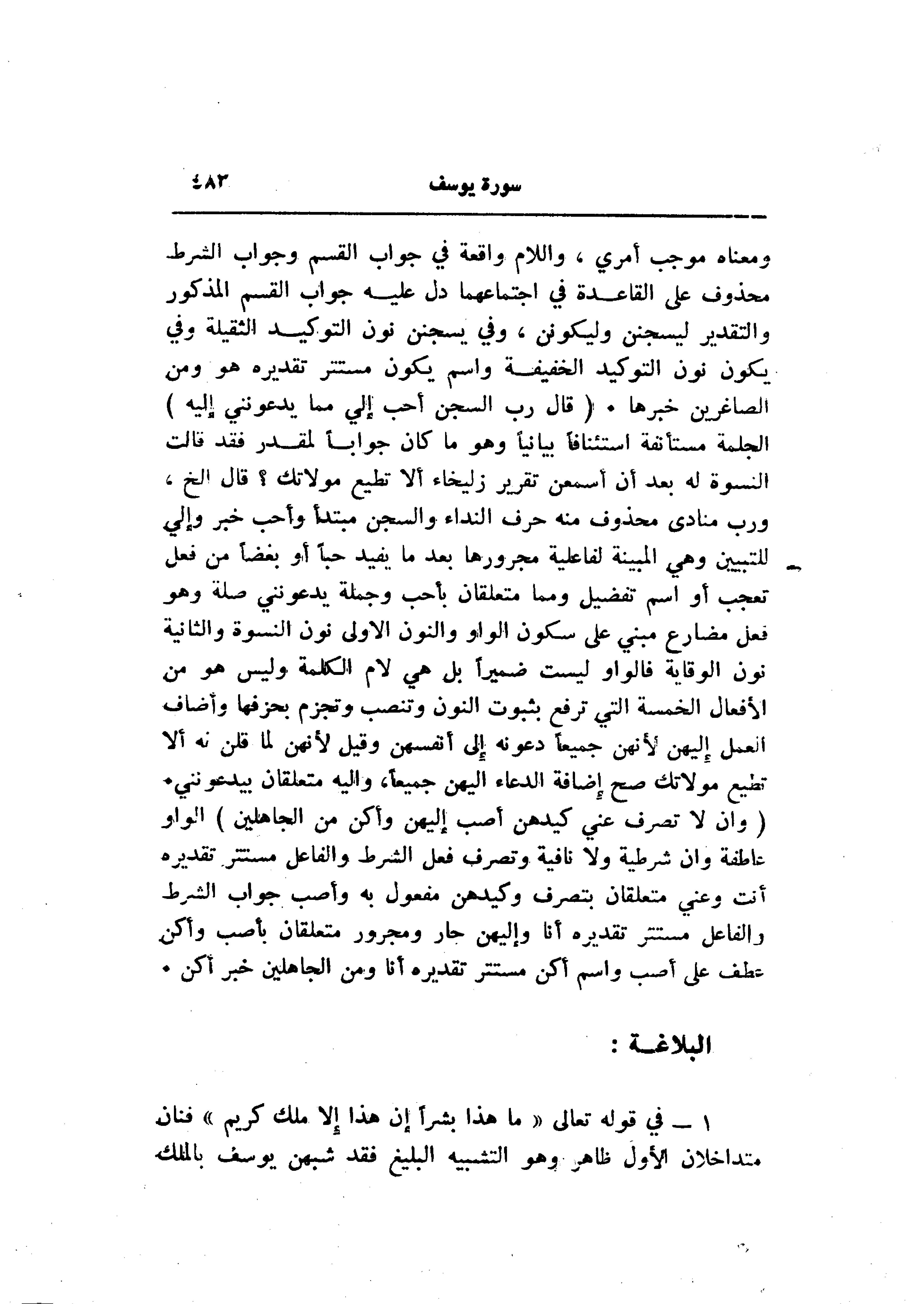 ومعناه موجب أمري، واللام واقعة في جواب القسم وجواب الشرط محذوف على القاعدة في اجتماعهما دل عليه جواب القسم المذكور والتقدير ليسجنن وليكونن، وفي يسجنن نون التوكيد الثقيلة وفي يكون نون التوكيد الخفيفة واسم يكون مستتر تقديره هو ومن الصاغرين خبرها. (قالَ رَبِّ السِّجْنُ أَحَبُّ إِلَيَّ مِمَّا يَدْعُونَنِي إِلَيْهِ) الجملة مستأنفة استئنافا بيانيا وهو ما كان جوابا لمقدر فقد قالت النسوة له بعد أن أسمعن تقرير زليخاء ألا تطيع مولاتك؟ قال إلخ، ورب منادى محذوف منه حرف النداء والسجن مبتدأ وأحب خبر وإلي للتبيين وهي المبينة لفاعلية مجرورها بعد ما يفيد حبا أو بغضا من فعل تعجب أو اسم تفضيل ومما متعلقان بأحب وجملة يدعونني صلة وهو فعل مضارع مبني على سكون الواو والنون الاولى نون النسوة والثانية نون الوقاية فالواو ليست ضميرا بل هي لام الكلمة وليس هو من الأفعال الخمسة التي ترفع بثبوت النون وتنصب وتجزم بحذفها وأضاف العمل إليهن لأنهن جميعا دعونه إلى أنفسهن وقيل لأنهن لما قلن له ألا تطيع مولاتك صح إضافة الدعاء إليهن جميعا، واليه متعلقان بيدعونني.