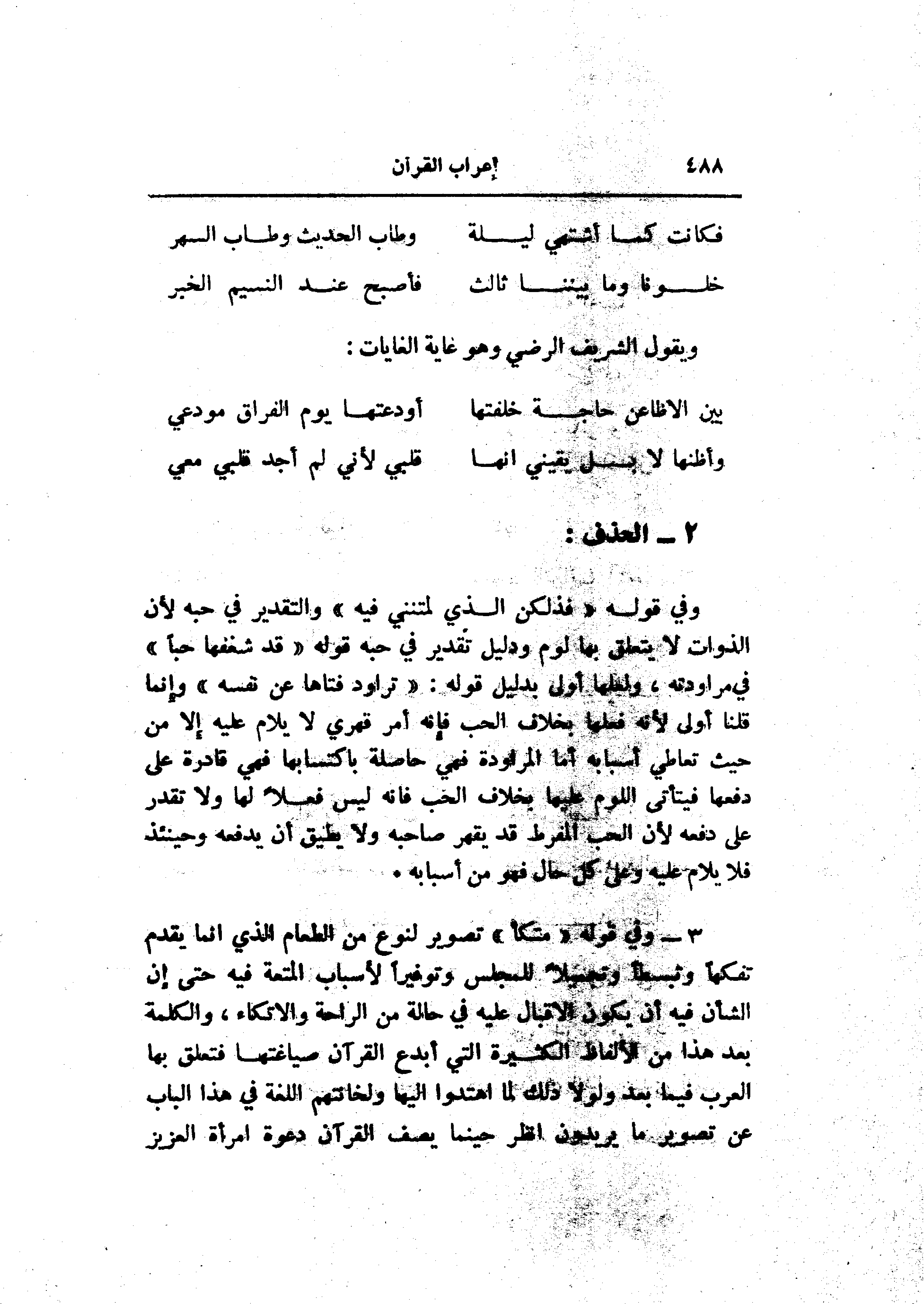 وفي قوله «فذلكن الذي لمتنني فيه» والتقدير في حبه لأن الذوات لا يتعلق بها لوم ودليل تقدير في حبه قوله «قد شغفها حبا» في مراودته، ولعلها أولى بدليل قوله: «تراود فتاها عن نفسه» وإنما قلنا أولى لأنه فعلها بخلاف الحب فإنه أمر قهري لا يلام عليه إلا من حيث تعاطي أسبابه أما المراودة فهي حاصلة باكتسابها فهي قادرة على دفعها فيتأتى اللوم عليها بخلاف الحب فانه ليس فعلا لها ولا تقدر على دفعه لأن الحب المفرط قد يقهر صاحبه ولا يطيق أن يدفعه وحينئذ فلا يلام عليه وعلى كل حال فهو من أسبابه.