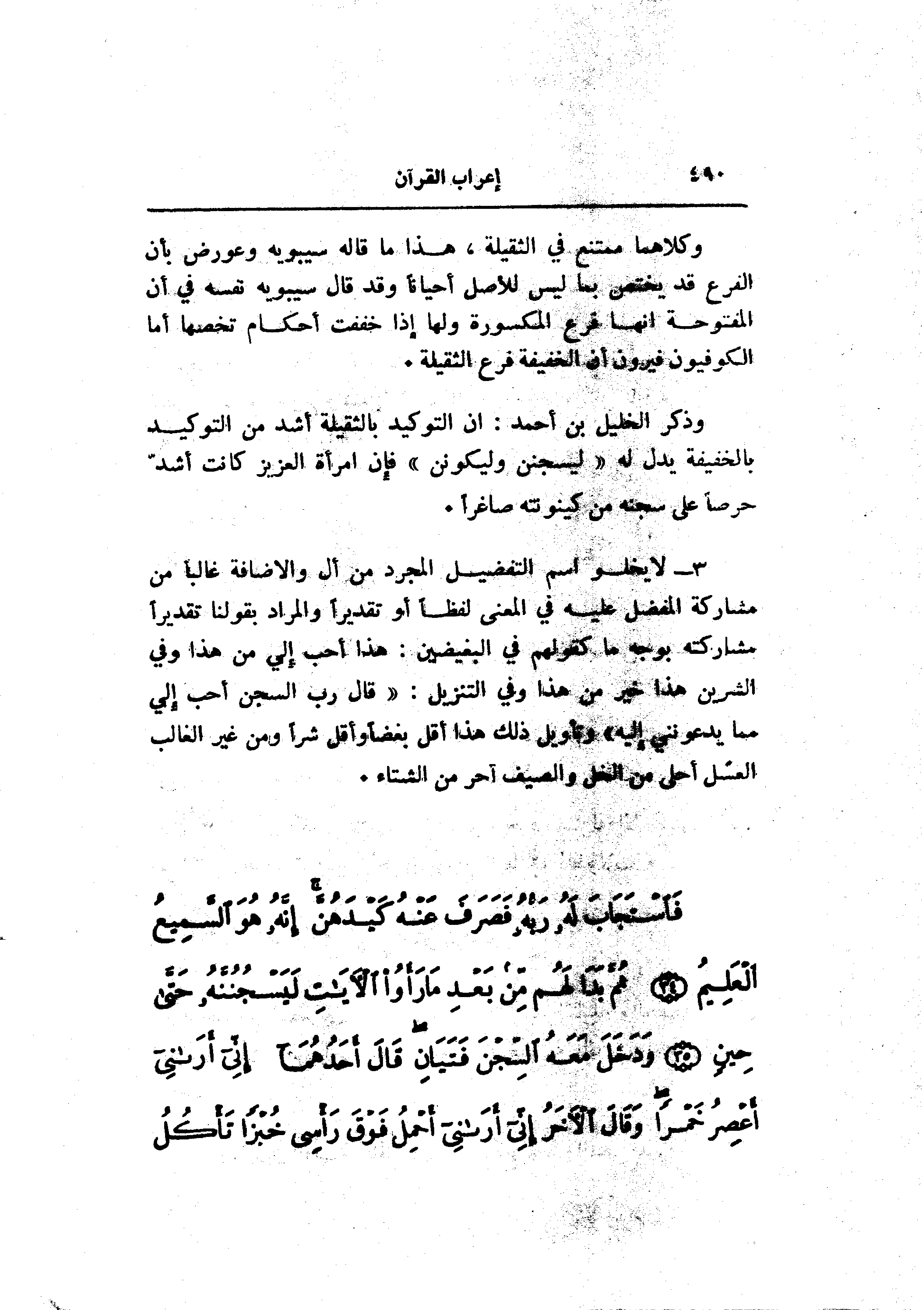 وذكر الخليل بن أحمد: ان التوكيد بالثقيلة أشد من التوكيد بالخفيفة يدل له «ليسجنن وليكونن» فإن امرأة العزيز كانت أشدّ حرصا على سجنه من كينونته صاغرا.