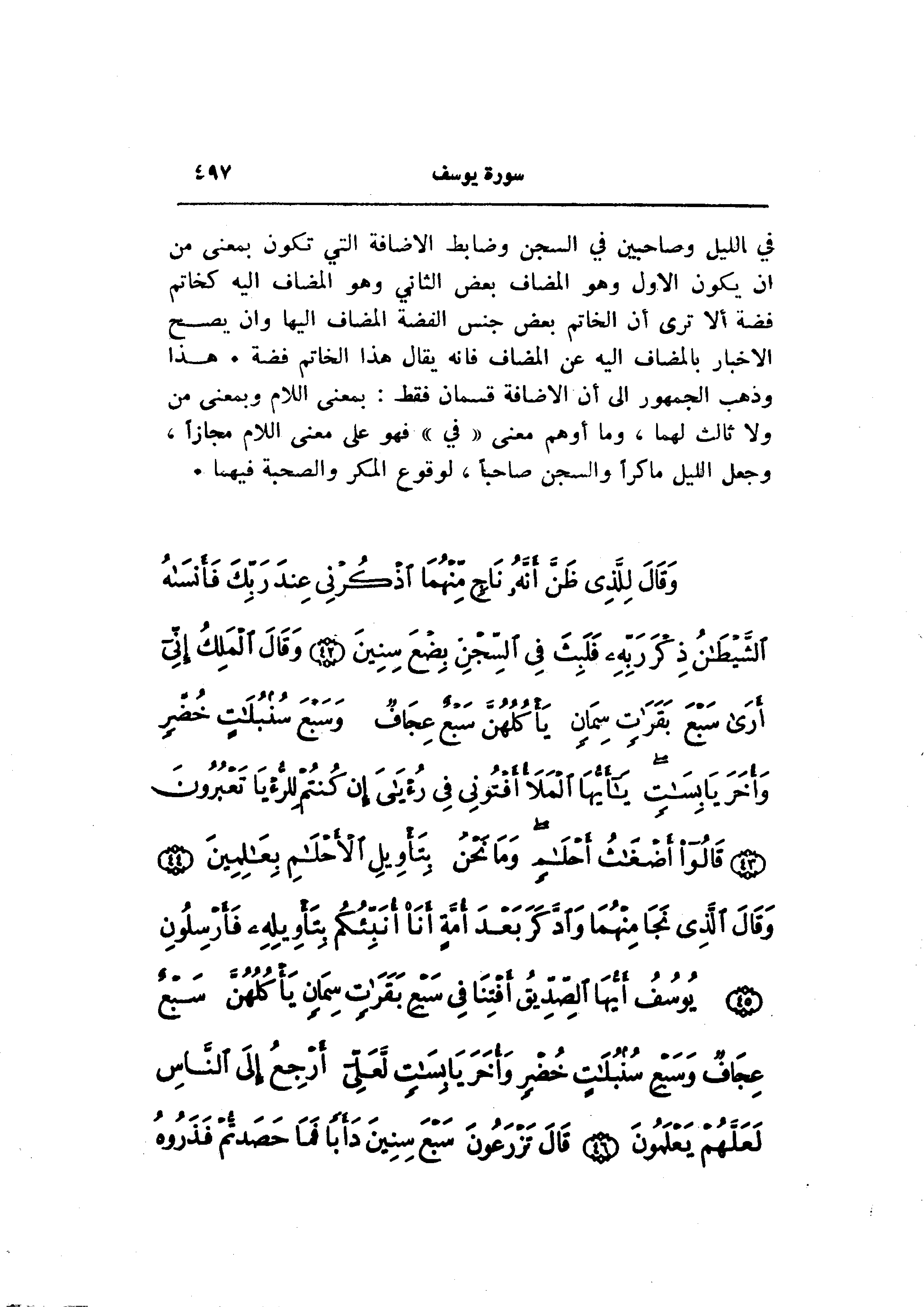 في الليل وصاحبين في السجن وضابط الاضافة التي تكون بمعنى من ان يكون الاول وهو المضاف بعض الثاني وهو المضاف اليه كخاتم فضة ألا ترى أن الخاتم بعض جنس الفضة المضاف إليها وان يصح الاخبار بالمضاف اليه عن المضاف فانه يقال هذا الخاتم فضة. هذا وذهب الجمهور الى أن الاضافة قسمان فقط: بمعنى اللام وبمعنى من ولا ثالث لهما، وما أوهم معنى «في» فهو على معنى اللام مجازا، وجعل الليل ماكرا والسجن صاحبا، لوقوع المكر والصحبة فيهما.