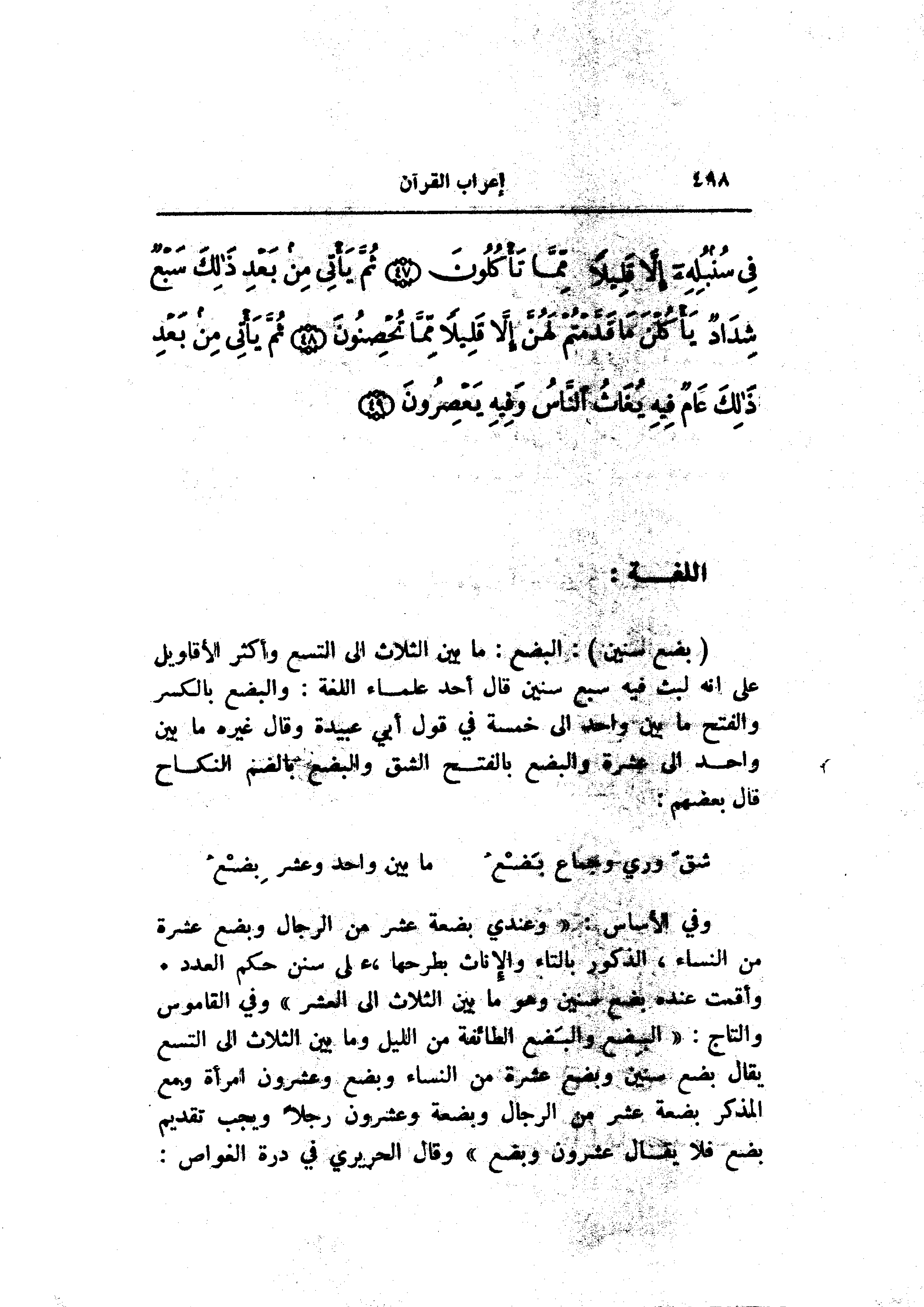 (بِضْعَ سِنِينَ) : البضع: ما بين الثلاث الى التسع وأكثر الأقاويل على انه لبث فيه سبع سنين قال أحد علماء اللغة: والبضع بالكسر والفتح ما بين واحد الى خمسة في قول أبي عبيدة وقال غيره ما بين واحد الى عشرة والبضع بالفتح الشق والبضع بالضم النكاح قال بعضهم: