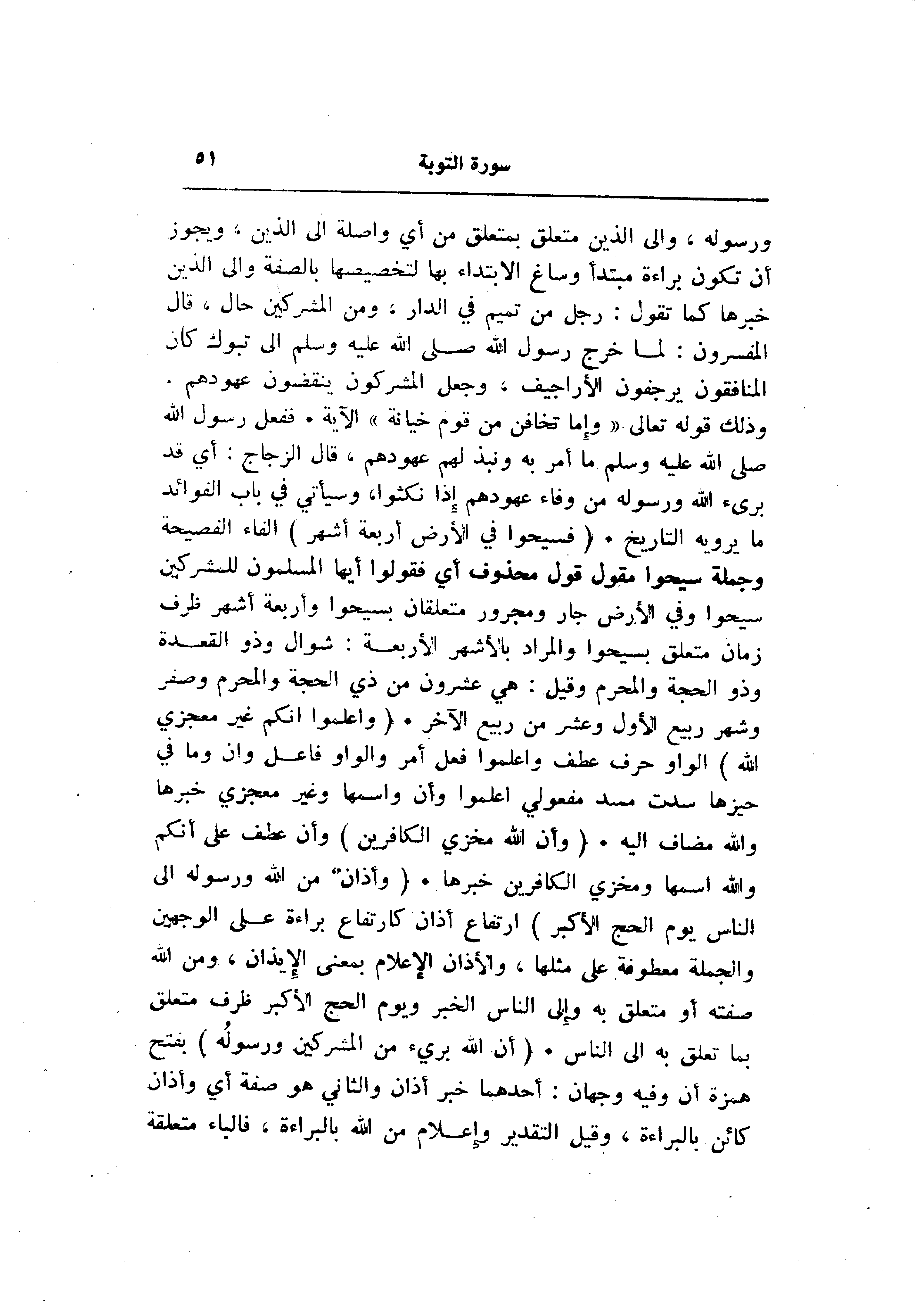 وذلك قوله تعالى «وإما تخافن من قوم خيانة» الآية. ففعل رسول الله صلى الله عليه وسلم ما أمر به ونبذ لهم عهودهم، قال الزجاج: أي قد برىء الله ورسوله من وفاء عهودهم إذا نكثوا، وسيأتي في باب الفوائد ما يرويه التاريخ. (فَسِيحُوا فِي الْأَرْضِ أَرْبَعَةَ أَشْهُرٍ) الفاء الفصيحة وجملة سيحوا مقول قول محذوف أي فقولوا أيها المسلمون للمشركين سيحوا وفي الأرض جار ومجرور متعلقان بسيحوا وأربعة أشهر ظرف زمان متعلق بسيحوا والمراد بالأشهر الأربعة: شوال وذو القعدة وذو الحجة والمحرم وقيل: هي عشرون من ذي الحجة والمحرم وصفر وشهر ربيع الأول وعشر من ربيع الآخر. (وَاعْلَمُوا أَنَّكُمْ غَيْرُ مُعْجِزِي اللَّهِ) الواو حرف عطف واعلموا فعل أمر والواو فاعل وان وما في حيزها سدت مسد مفعولي اعلموا وأن واسمها وغير معجزي خبرها والله مضاف اليه. (وَأَنَّ اللَّهَ مُخْزِي الْكافِرِينَ) وأن عطف على أنكم والله اسمها ومخزي الكافرين خبرها. (وَأَذانٌ مِنَ اللَّهِ وَرَسُولِهِ إِلَى النَّاسِ يَوْمَ الْحَجِّ الْأَكْبَرِ) ارتفاع أذان كارتفاع براءة على الوجهين والجملة معطوفة على مثلها، والأذان الإعلام بمعنى الإيذان، ومن الله صفته أو متعلق به وإلى الناس الخبر ويوم الحج الأكبر ظرف متعلق بما تعلق به الى الناس. (أَنَّ اللَّهَ بَرِيءٌ مِنَ الْمُشْرِكِينَ وَرَسُولُهُ) بفتح همزة أن وفيه وجهان: أحدهما خبر أذان والثاني هو صفة أي وأذان كائن بالبراءة، وقيل التقدير وإعلام من الله بالبراءة، فالباء متعلقة