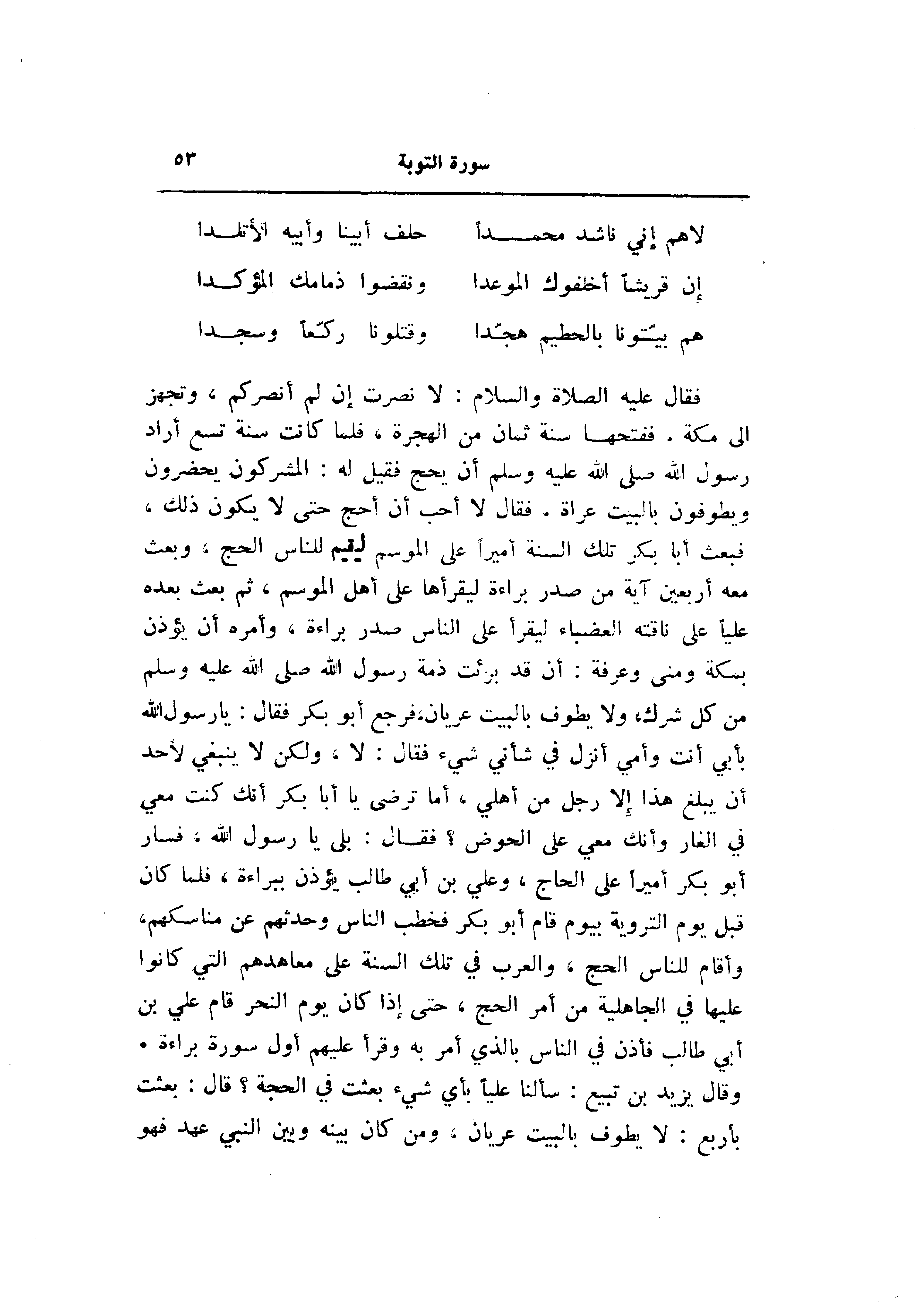 فقال عليه الصلاة والسلام: لا نصرت إن لم أنصركم، وتجهز الى مكة. ففتحها سنة ثمان من الهجرة، فلما كانت سنة تسع أراد رسول الله صلى الله عليه وسلم أن يحج فقيل له: المشركون يحضرون ويطوفون بالبيت عراة، فقال لا أحب أن أحج حتى لا يكون ذلك، فبعث أبا بكر تلك السنة أميرا على الموسم ليقيم للناس الحج، وبعث معه أربعين آية من صدر براءة ليقرأها على أهل الموسم، ثم بعث بعده عليا على ناقته العضباء ليقرأ على الناس صدر براءة، وأمره أن يؤذن بمكة ومنى وعرفة: أن قد برئت ذمة رسول الله صلى الله عليه وسلم من كل شرك، ولا يطوف بالبيت عريان، فرجع أبو بكر فقال: يا رسول الله بأبي أنت وأمي أنزل في شأني شيء فقال: لا، ولكن لا ينبغي لأحد أن يبلغ هذا إلا رجل من أهلي، أما ترضى يا أبا بكر أنك كنت معي في الغار وأنك معي على الحوض؟ فقال: بلى يا رسول الله، فسار أبو بكر أميرا على الحاج، وعلي بن أبي طالب يؤذن ببراءة، فلما كان قبل يوم التروية بيوم قام أبو بكر فخطب الناس وحدثهم عن مناسكهم، وأقام للناس الحج، والعرب في تلك السنة على معاهدهم التي كانوا عليها في الجاهلية من أمر الحج، حتى إذا كان يوم النحر قام علي بن أبي طالب فأذن في الناس بالذي أمر به وقرأ عليهم أول سورة براءة.