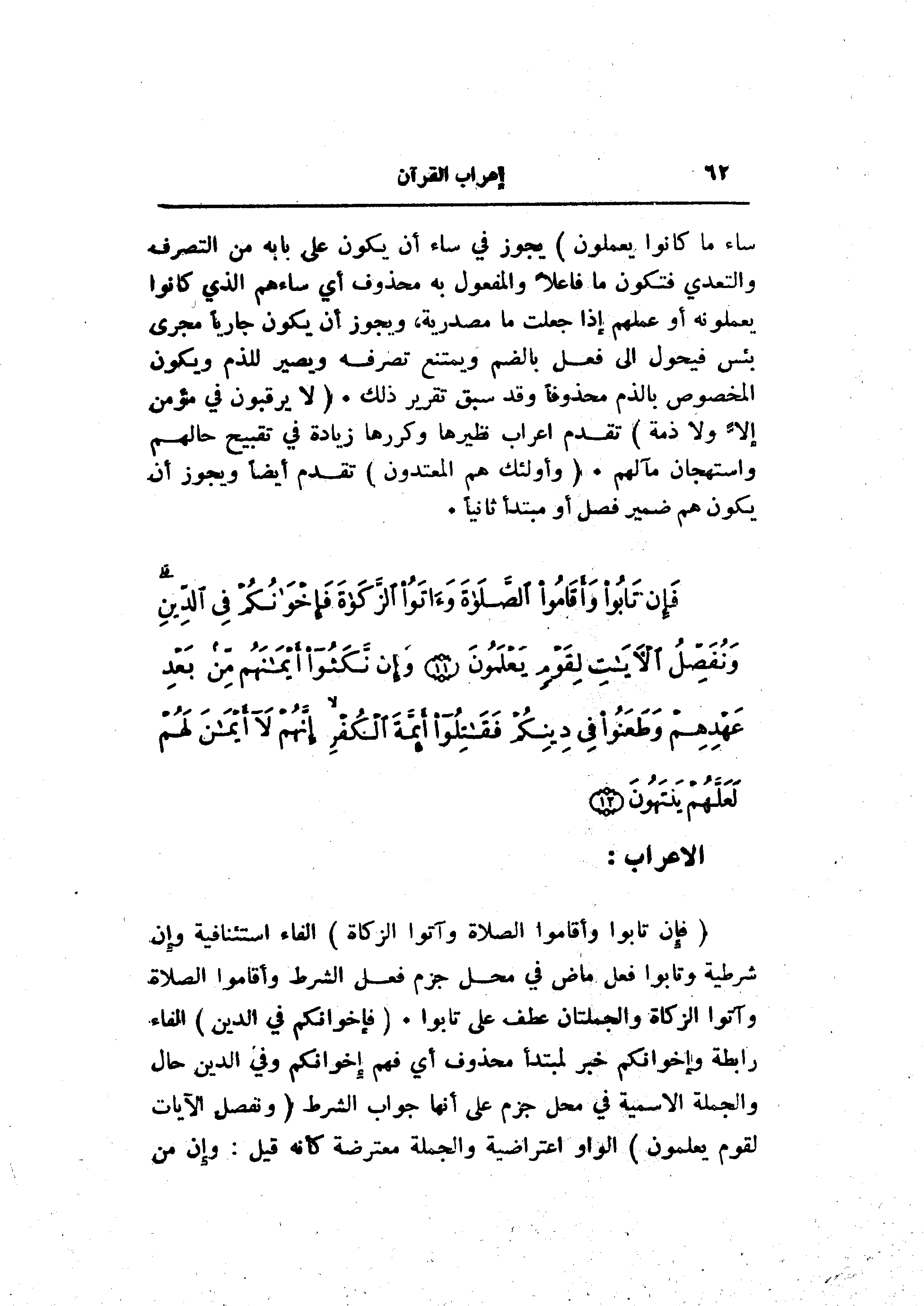 (فَإِنْ تابُوا وَأَقامُوا الصَّلاةَ وَآتَوُا الزَّكاةَ) الفاء استئنافية وإن شرطية وتابوا فعل ماض في محل جزم فعل الشرط وأقاموا الصلاة وآتوا الزكاة والجملتان عطف على تابوا. (فَإِخْوانُكُمْ فِي الدِّينِ) الفاء رابطة وإخوانكم خبر لمبتدأ محذوف أي فهم إخوانكم وفي الدين حال والجملة الاسمية في محل جزم على أنها جواب الشرط (وَنُفَصِّلُ الْآياتِ لِقَوْمٍ يَعْلَمُونَ) الواو اعتراضية والجملة معترضة كأنه قيل: وإن من