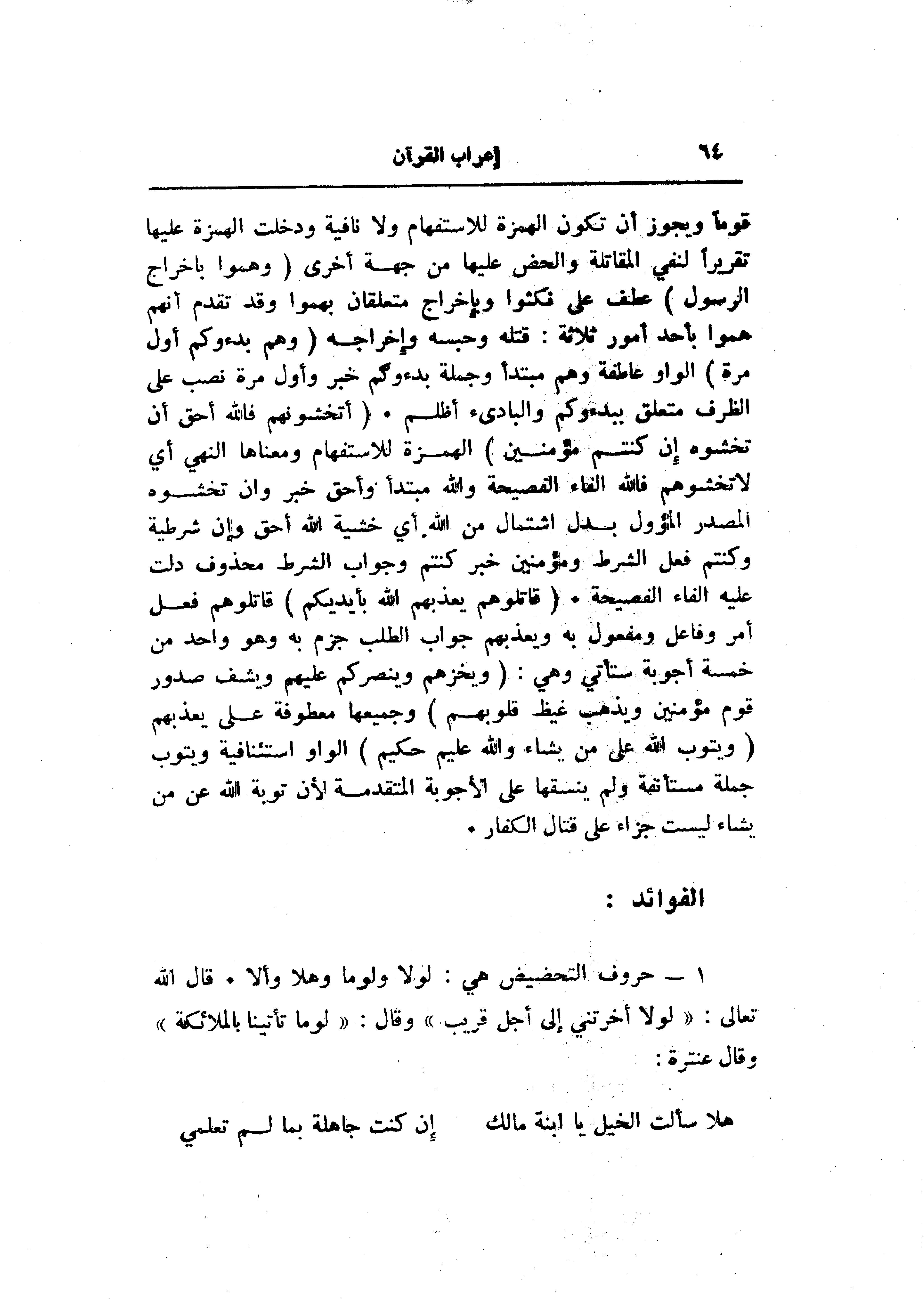 قوما ويجوز أن تكون الهمزة للاستفهام ولا نافية ودخلت الهمزة عليها تقريرا لنفي المقاتلة والحض عليها من جهة أخرى (وَهَمُّوا بِإِخْراجِ الرَّسُولِ) عطف على نكثوا وبإخراج متعلقان بهموا وقد تقدم أنهم هموا بأحد أمور ثلاثة: قتله وحبسه وإخراجه (وَهُمْ بَدَؤُكُمْ أَوَّلَ مَرَّةٍ) الواو عاطفة وهم مبتدأ وجملة بدءوكم خبر وأول مرة نصب على الظرف متعلق ببدءوكم والبادئ أظلم. (أَتَخْشَوْنَهُمْ فَاللَّهُ أَحَقُّ أَنْ تَخْشَوْهُ إِنْ كُنْتُمْ مُؤْمِنِينَ) الهمزة للاستفهام ومعناها النهي أي لا تخشوهم فالله الفاء الفصيحة والله مبتدأ وأحق خبر وان تخشوه المصدر المؤول بدل اشتمال من الله أي خشية الله أحق وإن شرطية وكنتم فعل الشرط ومؤمنين خبر كنتم وجواب الشرط محذوف دلت عليه الفاء الفصيحة. (قاتِلُوهُمْ يُعَذِّبْهُمُ اللَّهُ بِأَيْدِيكُمْ) قاتلوهم فعل أمر وفاعل ومفعول به ويعذبهم جواب الطلب جزم به وهو واحد من خمسة أجوبة ستأتي وهي: (وَيُخْزِهِمْ وَيَنْصُرْكُمْ عَلَيْهِمْ وَيَشْفِ صُدُورَ قَوْمٍ مُؤْمِنِينَ وَيُذْهِبْ غَيْظَ قُلُوبِهِمْ) وجميعا معطوفة على يعذبهم (وَيَتُوبُ اللَّهُ عَلى مَنْ يَشاءُ وَاللَّهُ عَلِيمٌ حَكِيمٌ) الواو استئنافية ويتوب جملة مستأنفة ولم ينسقها على الأجوبة المتقدمة لأن توبة الله عن من يشاء ليست جزاء على قتال الكفار.
