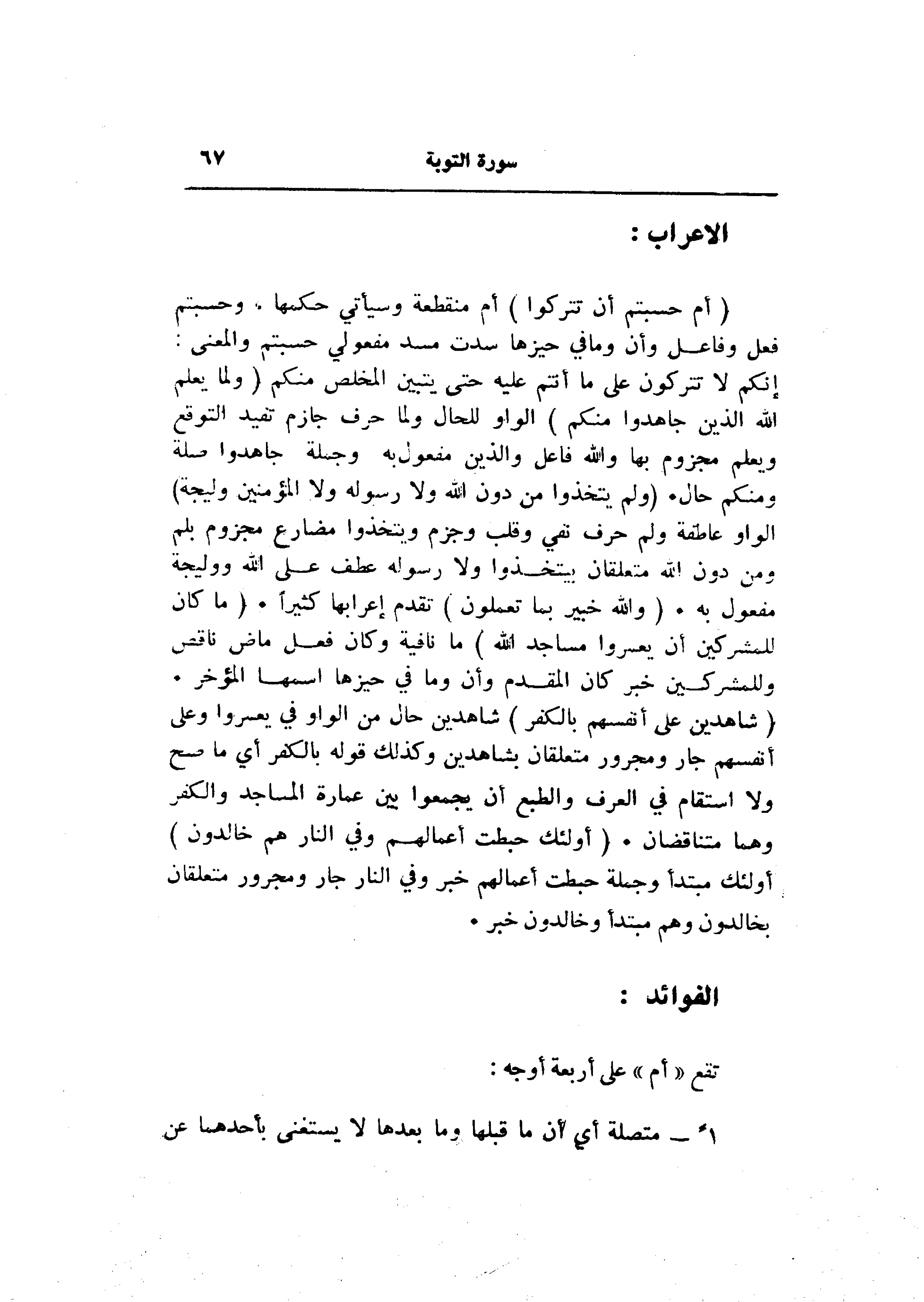 إنكم لا تتركون على ما أنتم عليه حتى يتبين المخلص منكم (وَلَمَّا يَعْلَمِ اللَّهُ الَّذِينَ جاهَدُوا مِنْكُمْ) الواو للحال ولما حرف جازم تفيد التوقع ويعلم مجزوم بها والله فاعل والذين مفعول به وجملة جاهدوا صلة ومنكم حال. (وَلَمْ يَتَّخِذُوا مِنْ دُونِ اللَّهِ وَلا رَسُولِهِ وَلَا الْمُؤْمِنِينَ وَلِيجَةً) الواو عاطفة ولم حرف نفي وقلب وجزم ويتخذوا مضارع مجزوم بلم ومن دون الله متعلقان بيتخذوا ولا رسوله عطف على الله ووليجة مفعول به. (وَاللَّهُ خَبِيرٌ بِما تَعْمَلُونَ) تقدم إعرابها كثيرا. (ما كانَ لِلْمُشْرِكِينَ أَنْ يَعْمُرُوا مَساجِدَ اللَّهِ) ما نافية وكان فعل ماض ناقص وللمشركين خبر كان المقدم وأن وما في حيزها اسمها المؤخر.