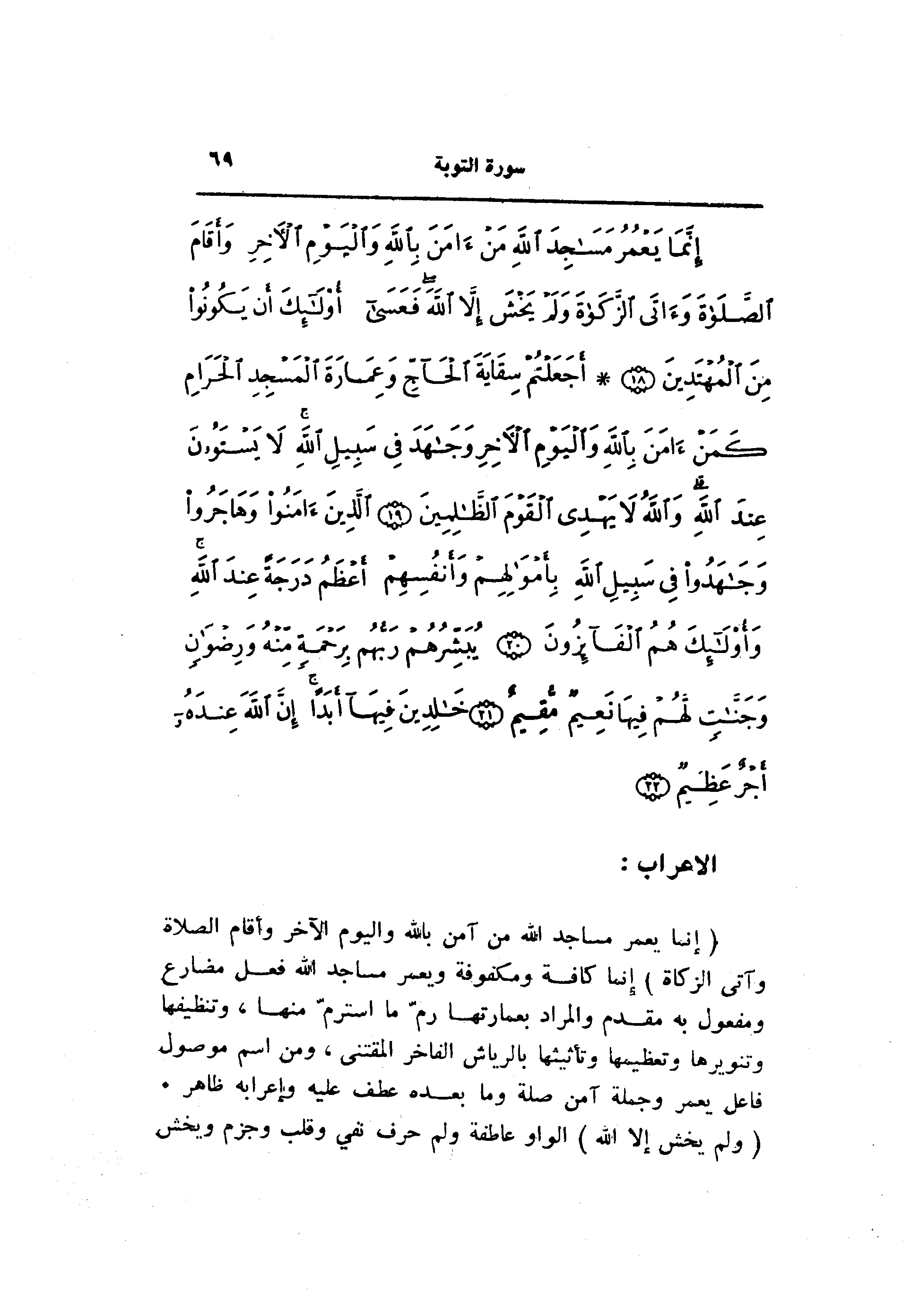 إِنَّما يَعْمُرُ مَساجِدَ اللَّهِ مَنْ آمَنَ بِاللَّهِ وَالْيَوْمِ الْآخِرِ وَأَقامَ الصَّلاةَ وَآتَى الزَّكاةَ وَلَمْ يَخْشَ إِلاَّ اللَّهَ فَعَسى أُولئِكَ أَنْ يَكُونُوا مِنَ الْمُهْتَدِينَ (18) أَجَعَلْتُمْ سِقايَةَ الْحاجِّ وَعِمارَةَ الْمَسْجِدِ الْحَرامِ كَمَنْ آمَنَ بِاللَّهِ وَالْيَوْمِ الْآخِرِ وَجاهَدَ فِي سَبِيلِ اللَّهِ لا يَسْتَوُونَ عِنْدَ اللَّهِ وَاللَّهُ لا يَهْدِي الْقَوْمَ الظَّالِمِينَ (19) الَّذِينَ آمَنُوا وَهاجَرُوا وَجاهَدُوا فِي سَبِيلِ اللَّهِ بِأَمْوالِهِمْ وَأَنْفُسِهِمْ أَعْظَمُ دَرَجَةً عِنْدَ اللَّهِ وَأُولئِكَ هُمُ الْفائِزُونَ (20) يُبَشِّرُهُمْ رَبُّهُمْ بِرَحْمَةٍ مِنْهُ وَرِضْوانٍ وَجَنَّاتٍ لَهُمْ فِيها نَعِيمٌ مُقِيمٌ (21) خالِدِينَ فِيها أَبَداً إِنَّ اللَّهَ عِنْدَهُ أَجْرٌ عَظِيمٌ (22)