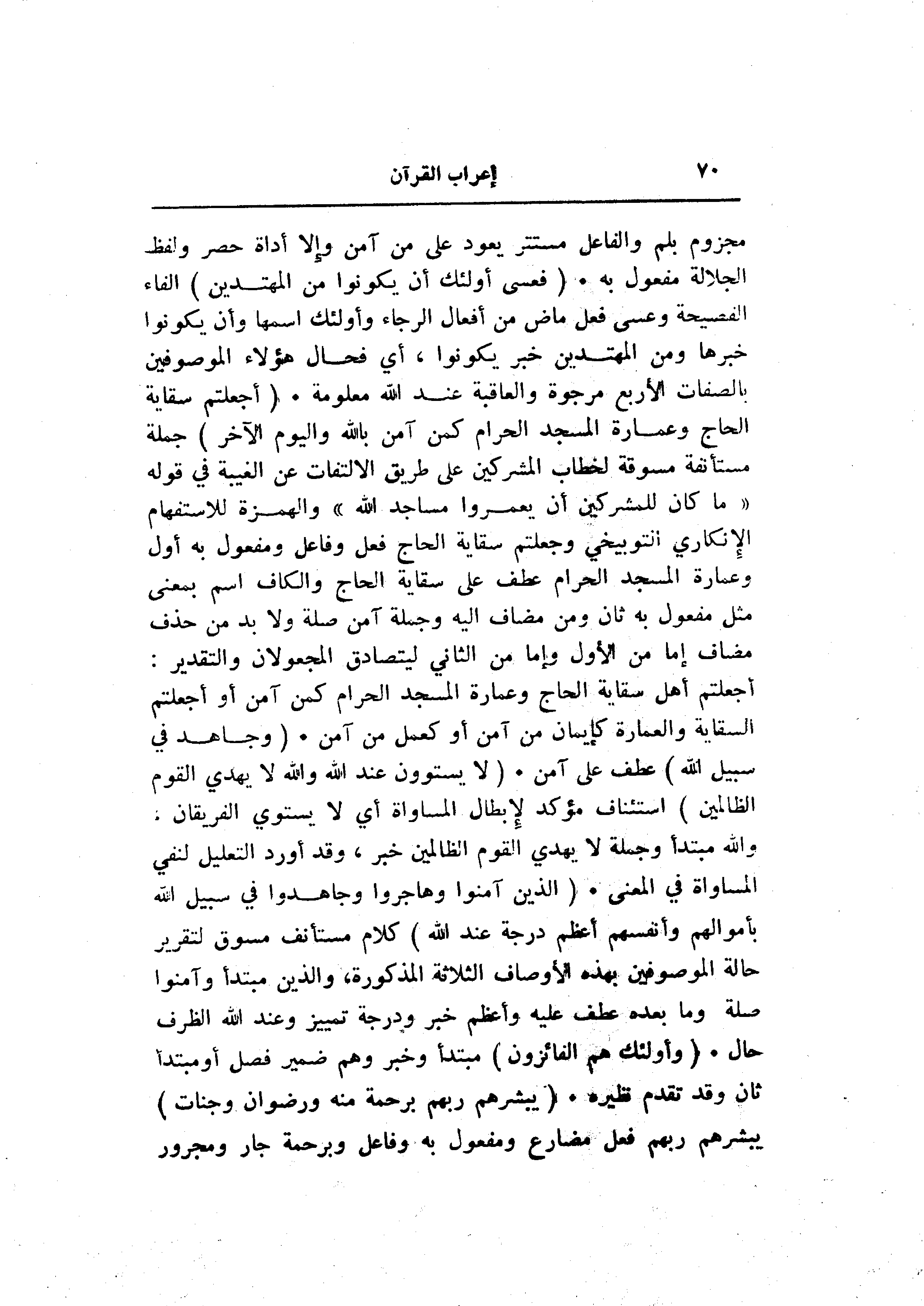 والله مبتدأ وجملة لا يهدي القوم الظالمين خبر، وقد أورد التعليل لنفي المساواة في المعنى. (الَّذِينَ آمَنُوا وَهاجَرُوا وَجاهَدُوا فِي سَبِيلِ اللَّهِ بِأَمْوالِهِمْ وَأَنْفُسِهِمْ أَعْظَمُ دَرَجَةً عِنْدَ اللَّهِ) كلام مستأنف مسوق لتقرير حالة الموصوفين بهذه الأوصاف الثلاثة المذكورة، والذين مبتدأ وآمنوا صلة وما بعده عطف عليه وأعظم خبر ودرجة تمييز وعند الله الظرف حال. (وَأُولئِكَ هُمُ الْفائِزُونَ) مبتدأ وخبر وهم ضمير فصل أو مبتدأ ثان وقد تقدم نظيره. (يُبَشِّرُهُمْ رَبُّهُمْ بِرَحْمَةٍ مِنْهُ وَرِضْوانٍ وَجَنَّاتٍ) يبشرهم ربهم فعل مضارع ومفعول به وفاعل وبرحمة جار ومجرور