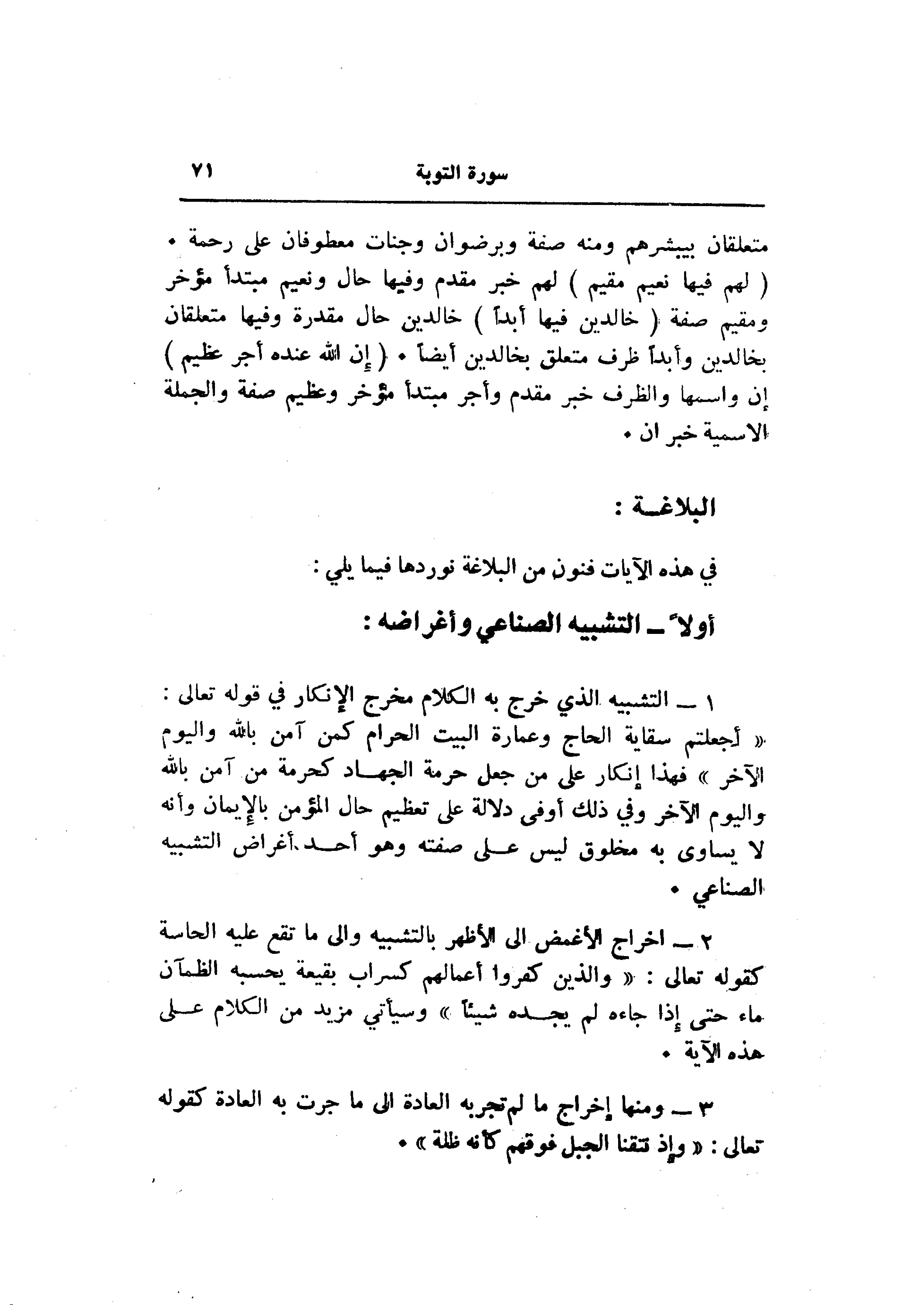 «أجعلتم سقاية الحاج وعمارة البيت الحرام كمن آمن بالله واليوم الآخر» فهذا إنكار على من جعل حرمة الجهاد كحرمة من آمن بالله واليوم الآخر وفي ذلك أوفى دلالة على تعظيم حال المؤمن بالإيمان وأنه لا يساوى به مخلوق ليس على صفته وهو أحد أغراض التشبيه الصناعي.
