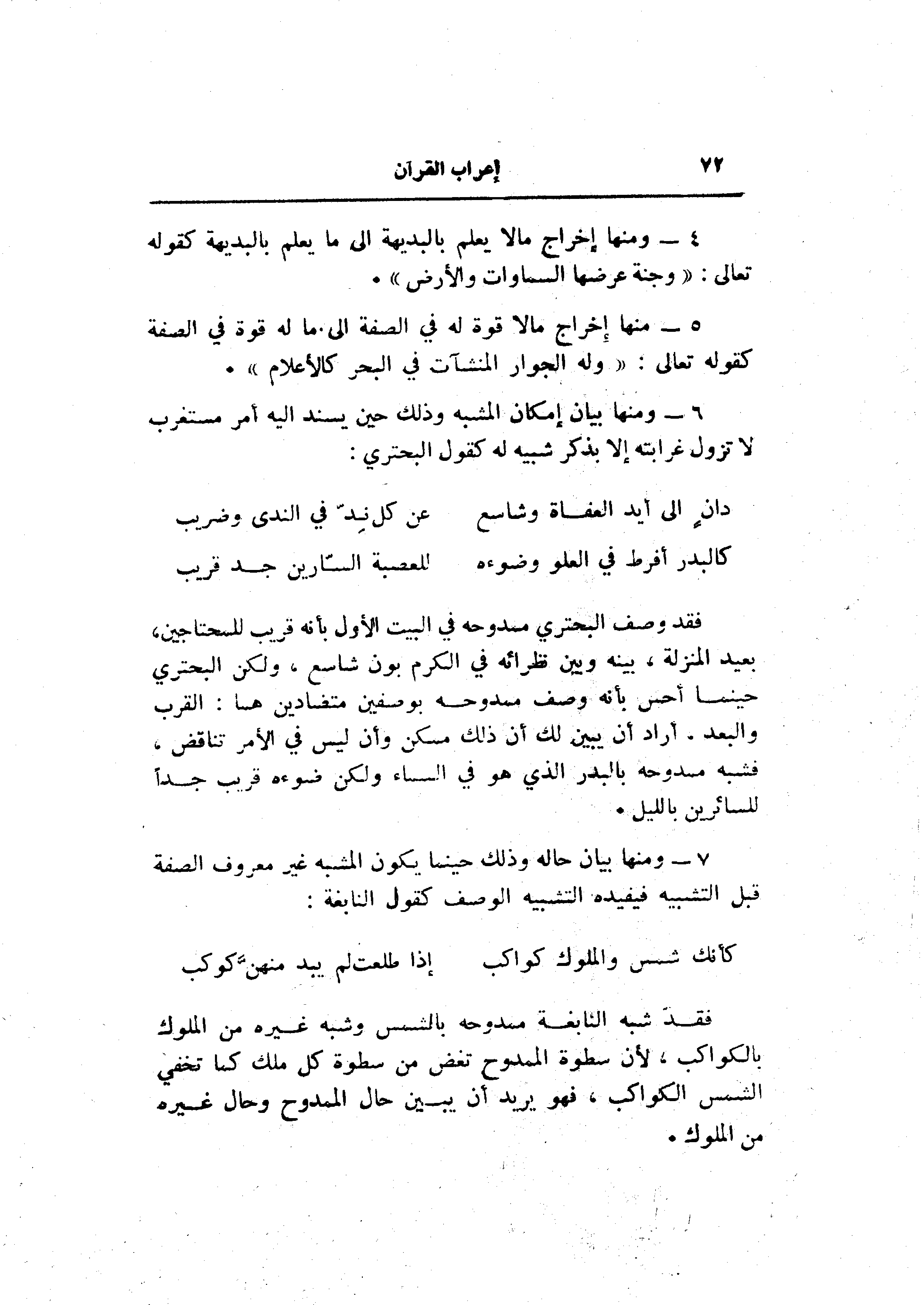 5- منها إخراج ما لا قوة له في الصفة الى ما له قوة في الصفة كقوله تعالى: «وله الجوار المنشآت في البحر كالأعلام» .