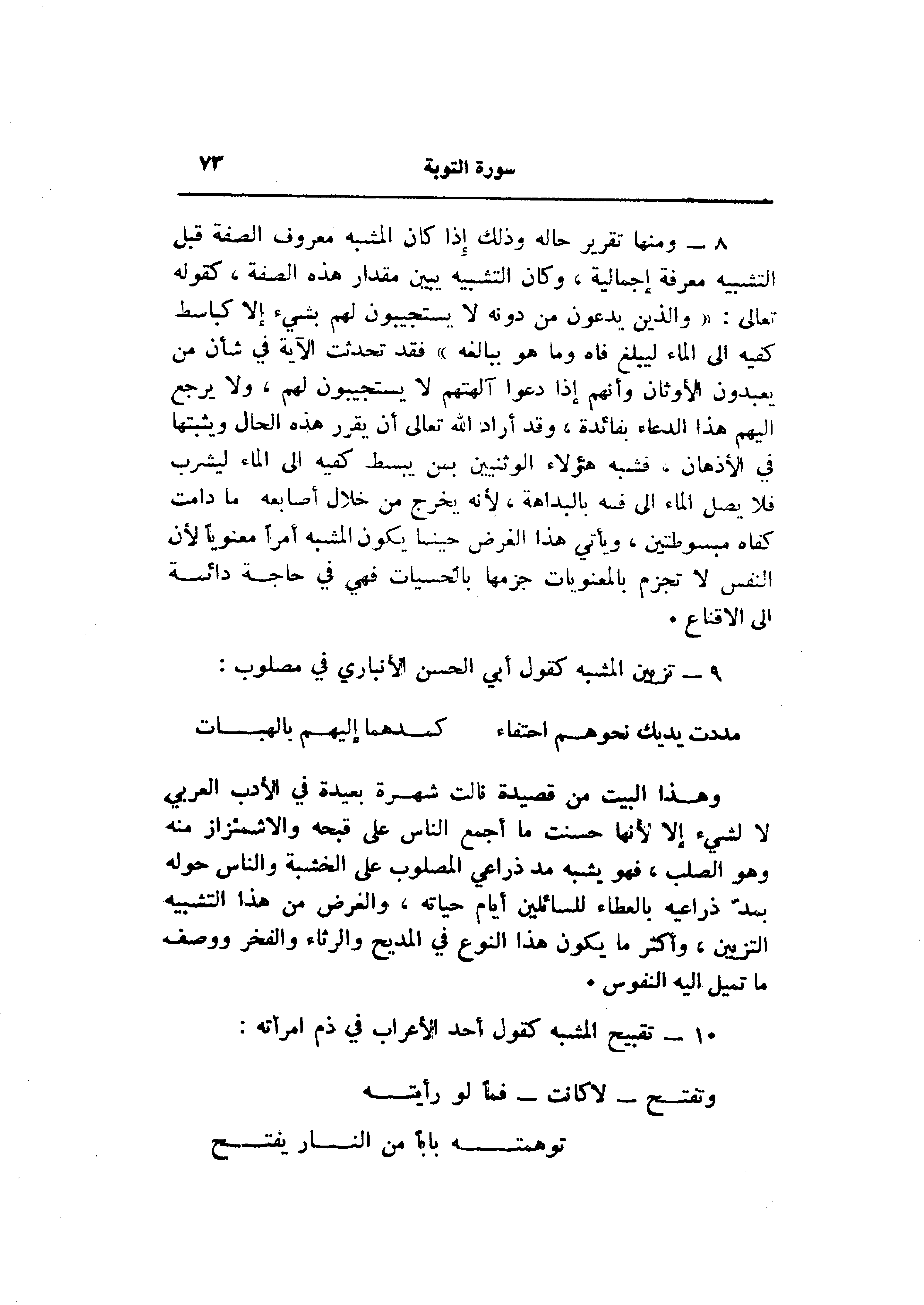 8- ومنها تقرير حاله وذلك إذا كان المشبه معروف الصفة قبل التشبيه معرفة إجمالية، وكان التشبيه يبين مقدار هذه الصفة، كقوله تعالى: «والذين يدعون من دونه لا يستجيبون لهم بشيء إلا كباسط كفيه الى الماء ليبلغ فاه وما هو ببالغه» فقد تحدثت الآية في شأن من يعبدون الأوثان وأنهم إذا دعوا آلهتهم لا يستجيبون لهم، ولا يرجع إليهم هذا الدعاء بفائدة، وقد أراد الله تعالى أن يقرر هذه الحال ويثبتها في الأذهان، فشبه هؤلاء الوثنيين بمن يبسط كفيه الى الماء ليشرب فلا يصل الماء الى فمه بالبداهة، لأنه يخرج من خلال أصابعه ما دامت كفاه مبسوطتين، ويأتي هذا الغرض حينما يكون المشبه أمرا معنويا لأن النفس لا تجزم بالمعنويات جزمها بالحسيات فهي في حاجة دائمة الى الاقناع.