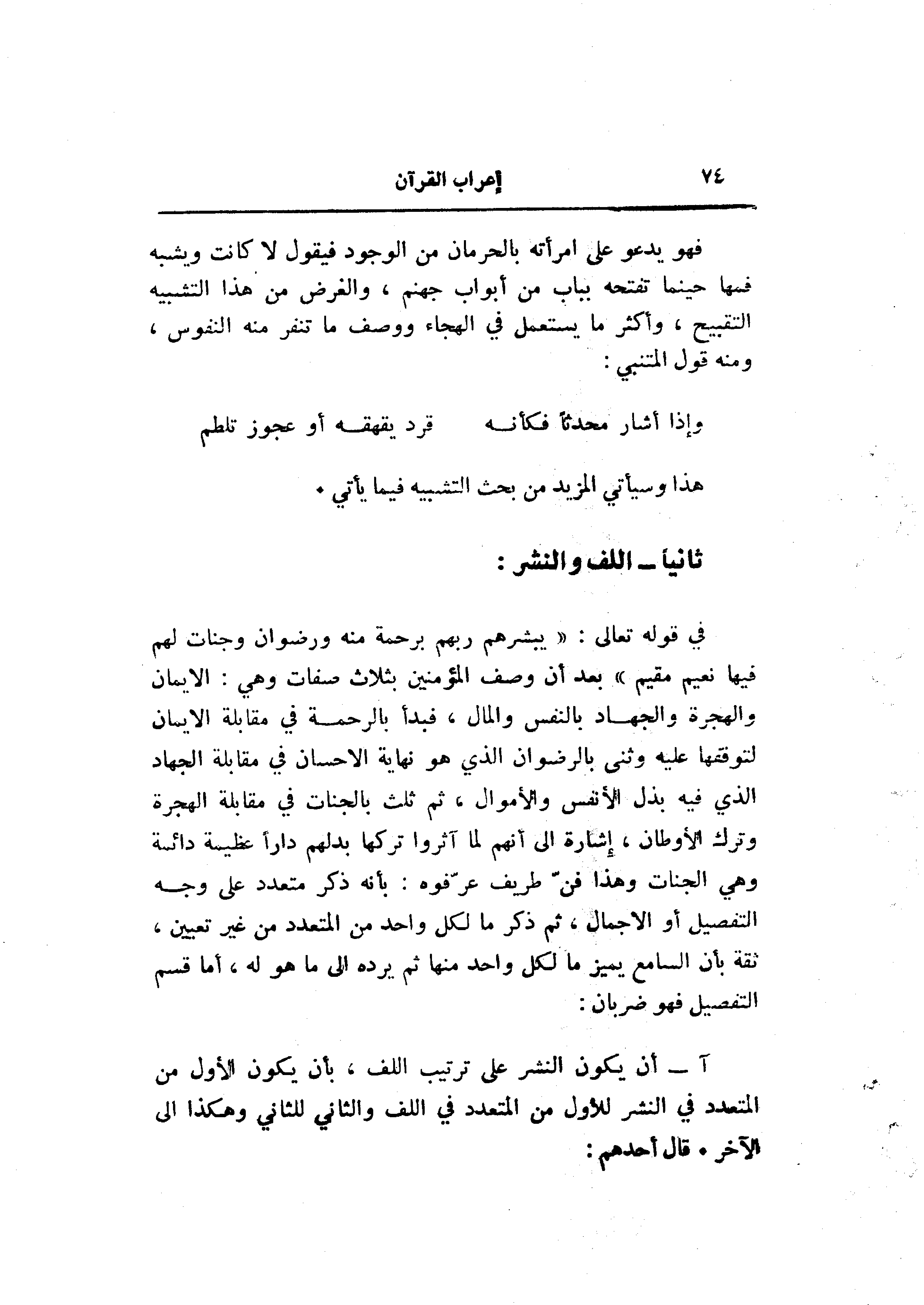 في قوله تعالى: «يبشرهم ربهم برحمة منه ورضوان وجنات لهم فيها نعيم مقيم» بعد أن وصف المؤمنين بثلاث صفات وهي: الايمان والهجرة والجهاد بالنفس والمال، فبدأ بالرحمة في مقابلة الايمان لتوقفها عليه وثنى بالرضوان الذي هو نهاية الإحسان في مقابلة الجهاد الذي فيه بذل الأنفس والأموال، ثم ثلث بالجنات في مقابلة الهجرة وترك الأوطان، إشارة الى أنهم لما آثروا تركها بدلهم دارا عظيمة دائمة وهي الجنات وهذا فنّ طريف عرّفوه: بأنه ذكر متعدد على وجه التفصيل أو الإجمال، ثم ذكر ما لكل واحد من المتعدد من غير تعيين، ثقة بأن السامع يميز ما لكل واحد منها ثم يرده الى ما هو له، أما قسم التفصيل فهو ضربان: