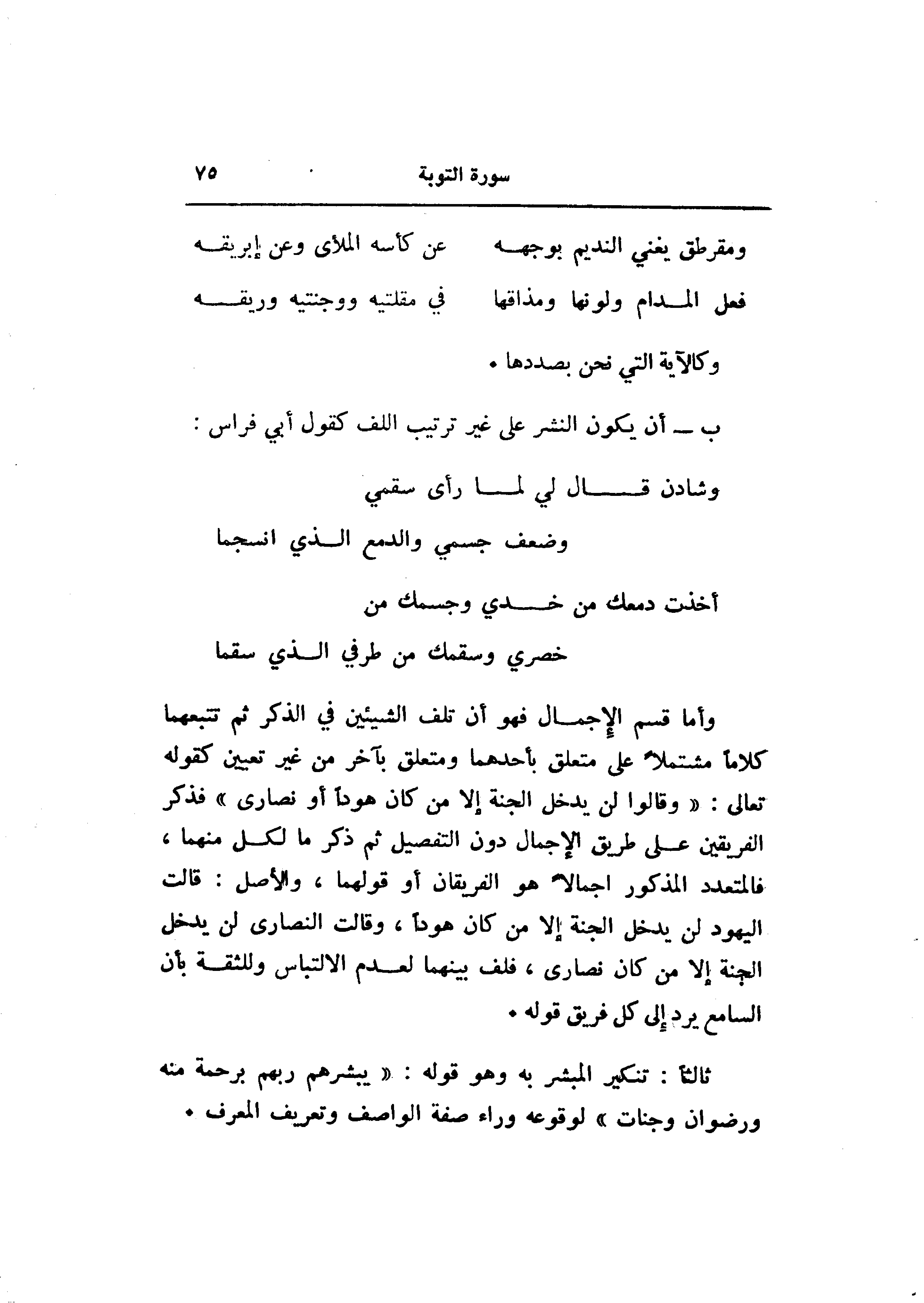وأما قسم الإجمال فهو أن تلف الشيئين في الذكر ثم تتبعهما كلاما مشتملا على متعلق بأحدهما ومتعلق بآخر من غير تعيين كقوله تعالى: «وقالوا لن يدخل الجنة إلا من كان هودا أو نصارى» فذكر الفريقين على طريق الإجمال دون التفصيل ثم ذكر ما لكل منهما، فالمتعدد المذكور اجمالا هو الفريقان أو قولهما، والأصل: قالت اليهود لن يدخل الجنة إلا من كان هودا، وقالت النصارى لن يدخل الجنة إلا من كان نصارى، فلف بينهما لعدم الالتباس وللثقة بأن السامع يرد إلى كل فريق قوله.
