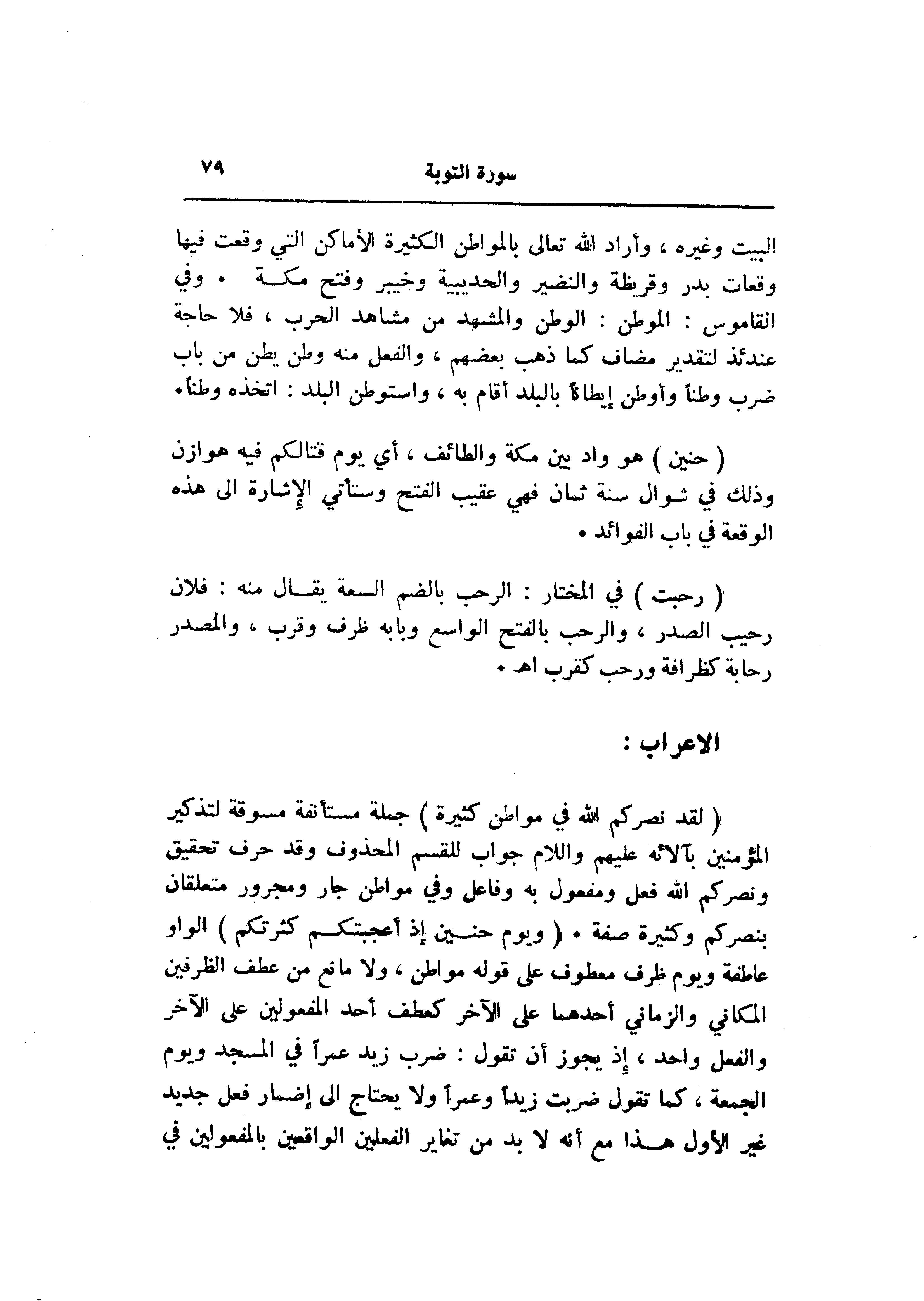 (لَقَدْ نَصَرَكُمُ اللَّهُ فِي مَواطِنَ كَثِيرَةٍ) جملة مستأنفة مسوقة لتذكير المؤمنين بآلائه عليهم واللام جواب للقسم المحذوف وقد حرف تحقيق ونصركم الله فعل ومفعول به وفاعل وفي مواطن جار ومجرور متعلقان بنصركم وكثيرة صفة. (وَيَوْمَ حُنَيْنٍ إِذْ أَعْجَبَتْكُمْ كَثْرَتُكُمْ) الواو عاطفة ويوم ظرف معطوف على قوله مواطن، ولا مانع من عطف الظرفين المكاني والزماني أحدهما على الآخر كعطف أحد المفعولين على الآخر والفعل واحد، إذ يجوز أن تقول: ضرب زيد عمرا في المسجد ويوم الجمعة، كما تقول ضربت زيدا وعمرا ولا يحتاج الى إضمار فعل جديد غير الأول هذا مع أنه لا بد من تغاير الفعلين الواقعين بالمفعولين في